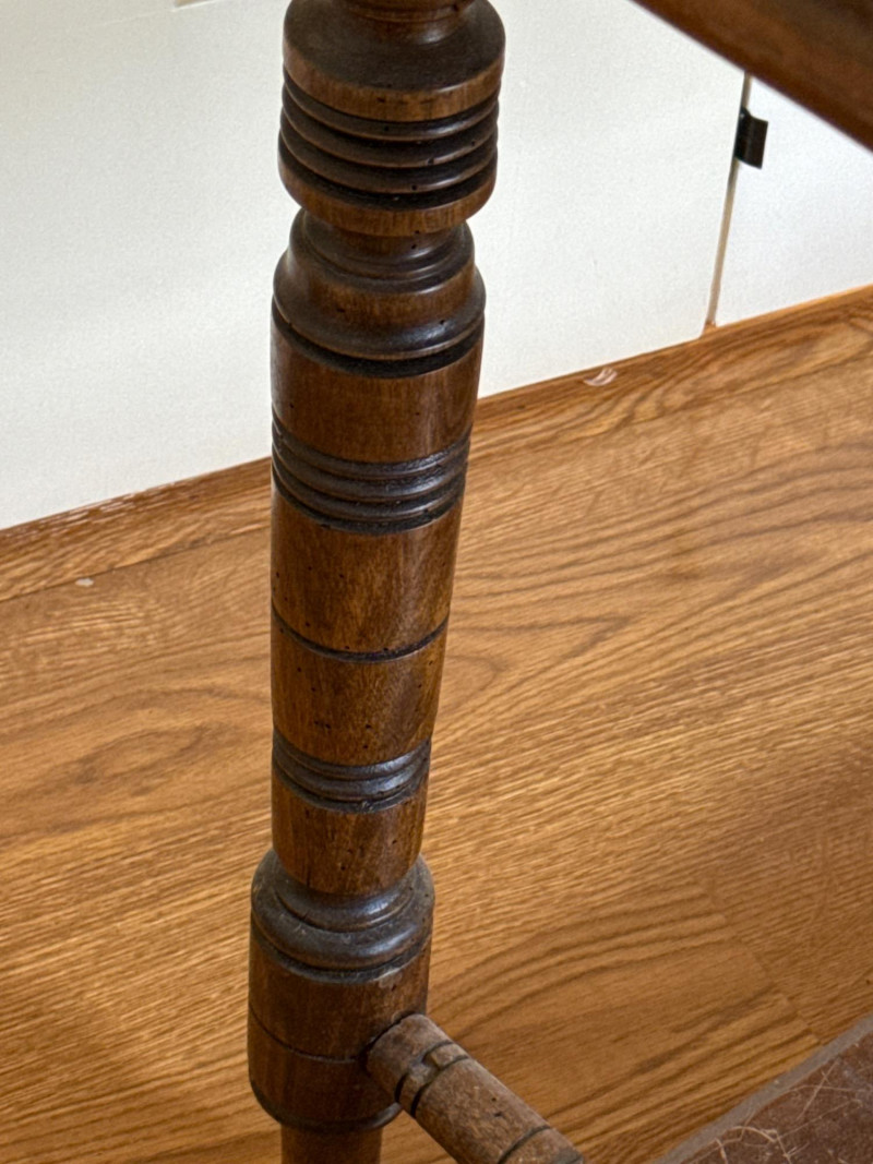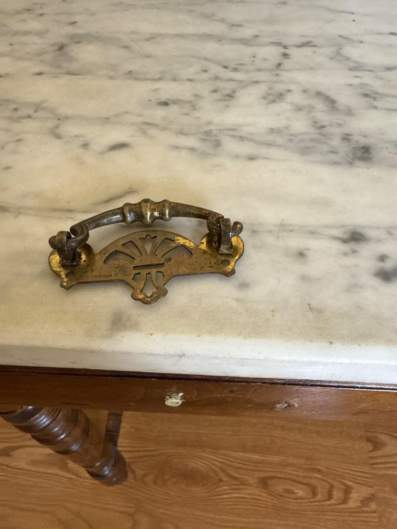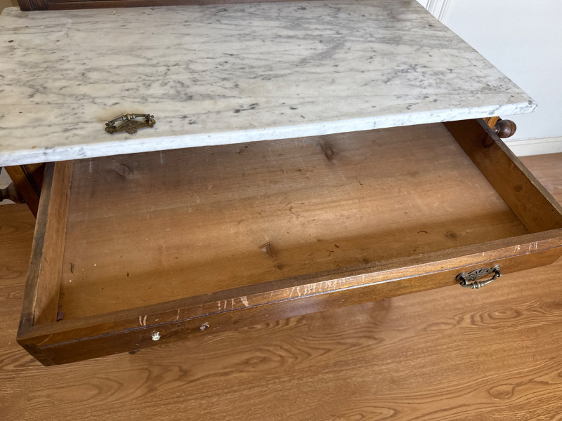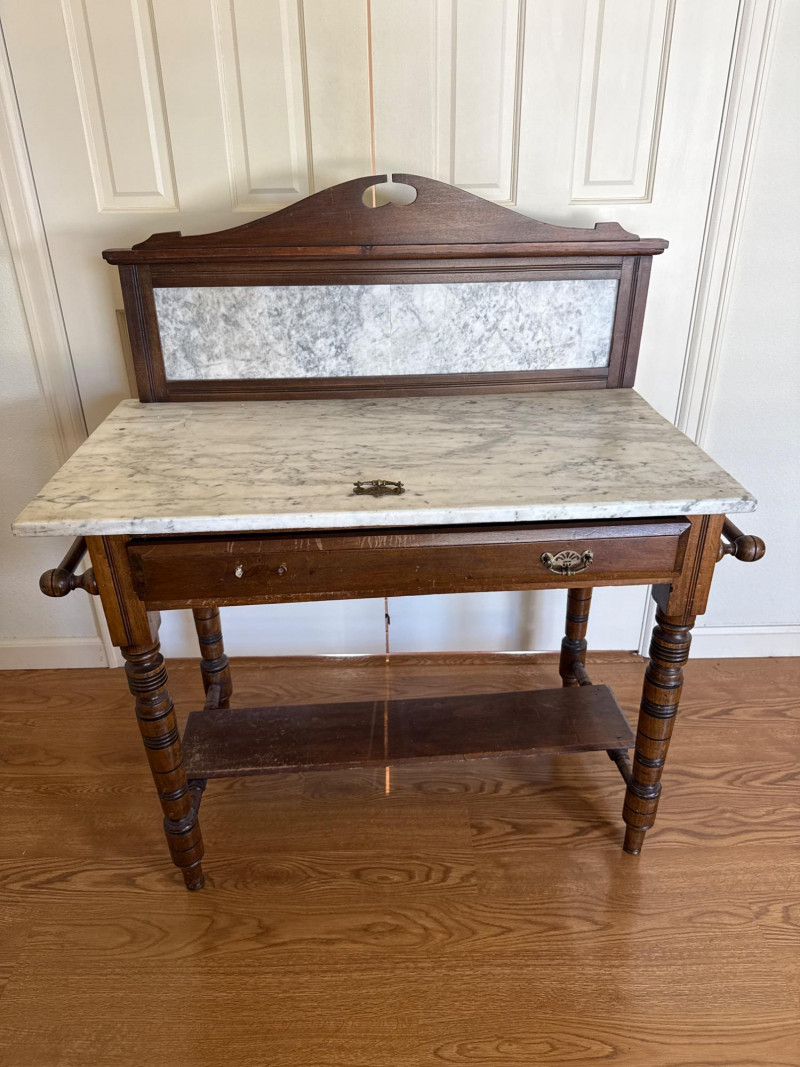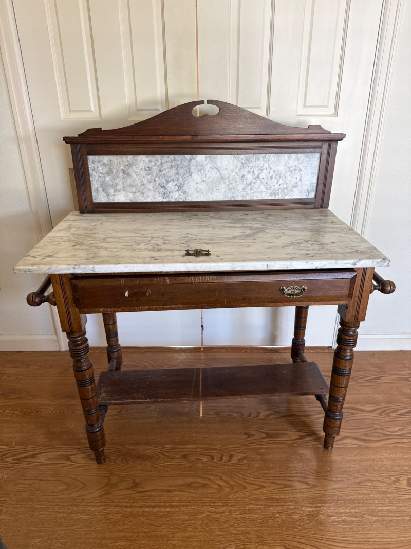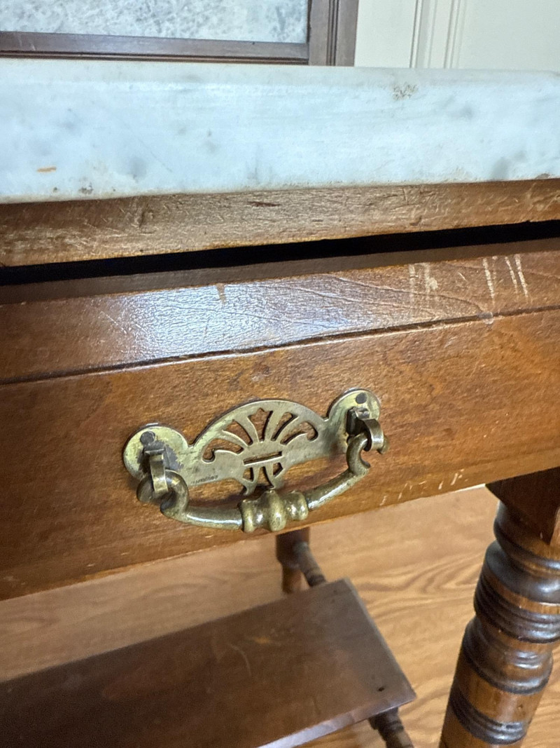 An elegant early 20th-century washstand featuring: Top: White/gray veined marble slab with matching marble backsplash inset in wood. Wood: Solid walnut frame with four turned legs showcasing 18 decorative ring turnings. Drawer: Single wide drawer with original brass pulls (note: one pull requires reattachment). Other Features: Side towel bars and a lower wood shelf. Hardware: Original brass pulls included; one detached but present. Marble-top washstands were popular in the late 19th and early 20th centuries, typically used with a basin and pitcher before indoor plumbing became widespread. Walnut examples with turned legs, brass pulls, and side towel bars reflect transitional Victorian and early Eastlake design aesthetics.Antique Marble and Walnut Washstand – Early 20th Century