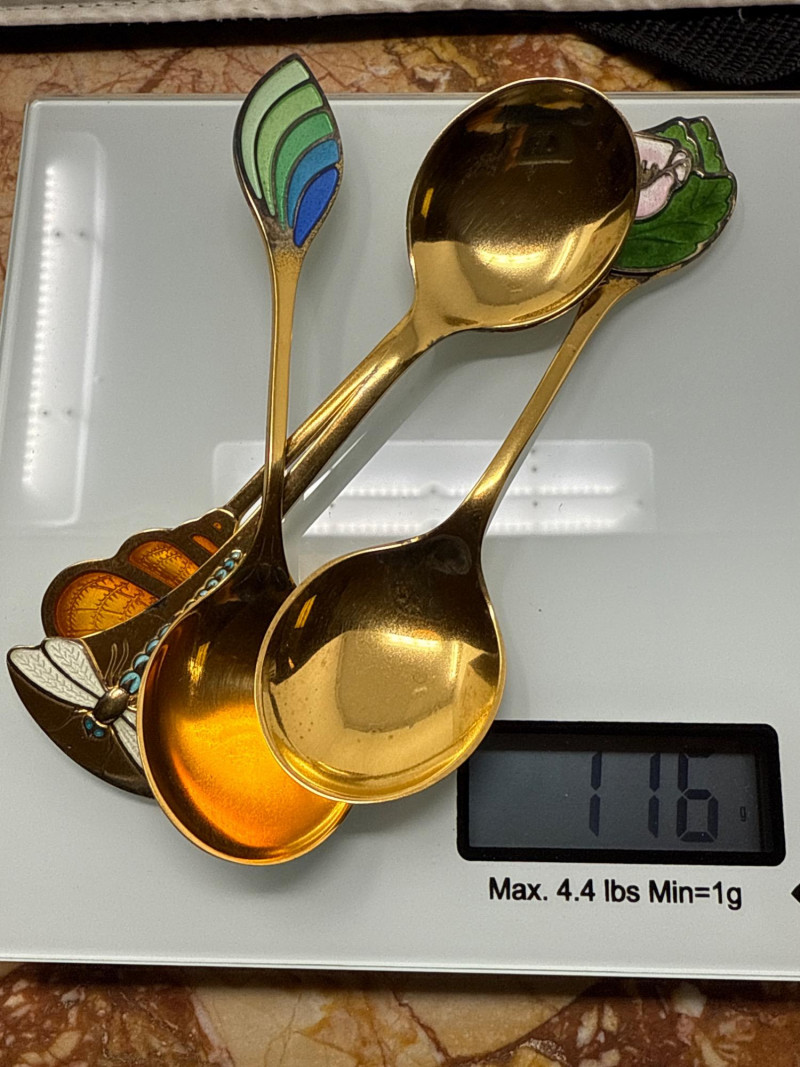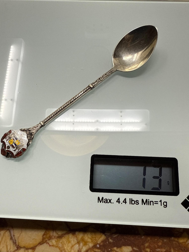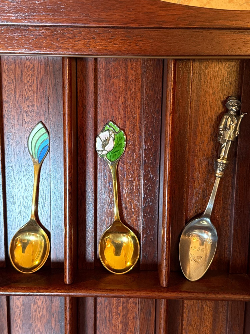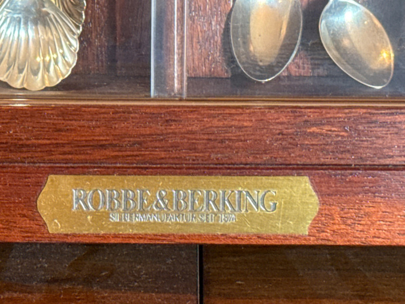 Brand: Robbe & Berking Material: Rich wood finish Design: Sliding glass doors with fitted interior Dimensions: Approx. 14" x 12" Purpose: Designed to showcase collector spoons with multiple dedicated slots Material: Gilded sterling silver Design: Colorful enamel decoration Details: Each spoon stamped with maker’s marks and year Combined Weight: 116 grams Handle: Enamel crest Weight: 13 grams Material: Silver-plated and enamel Themes: Includes crests, shields, floral motifs, and landmark designs Robbe & Berking Wooden Display Cabinet with Collector Spoons
