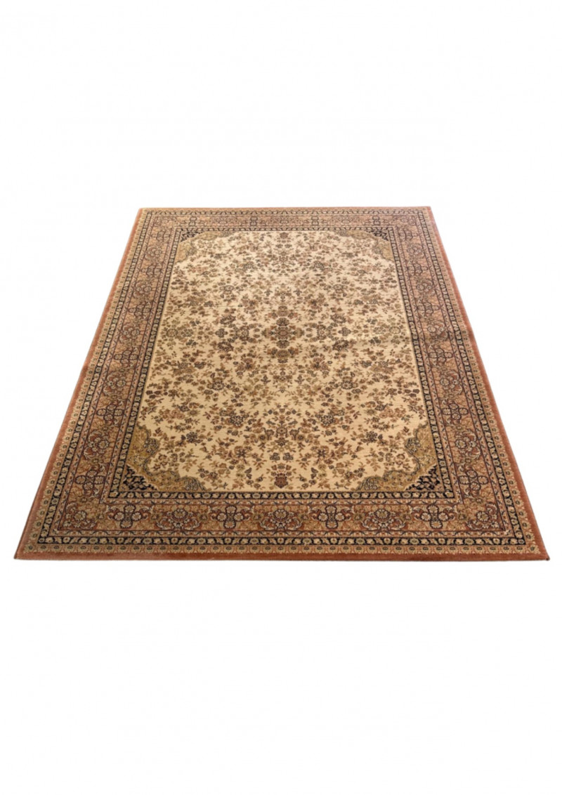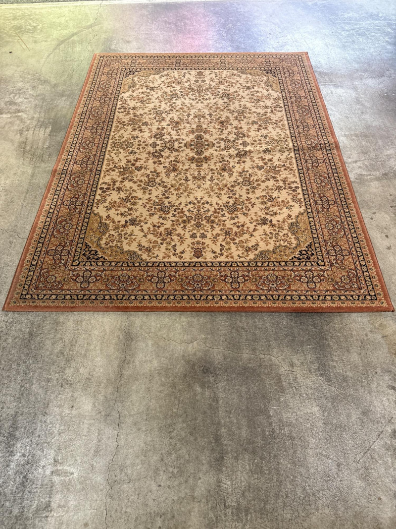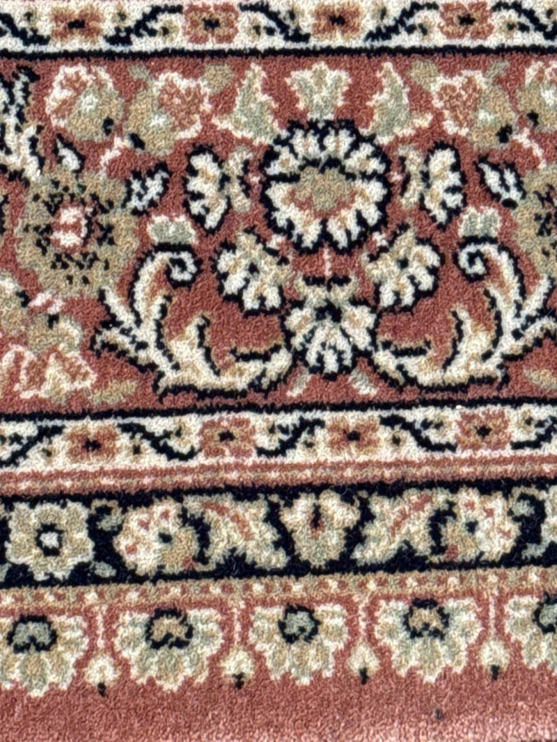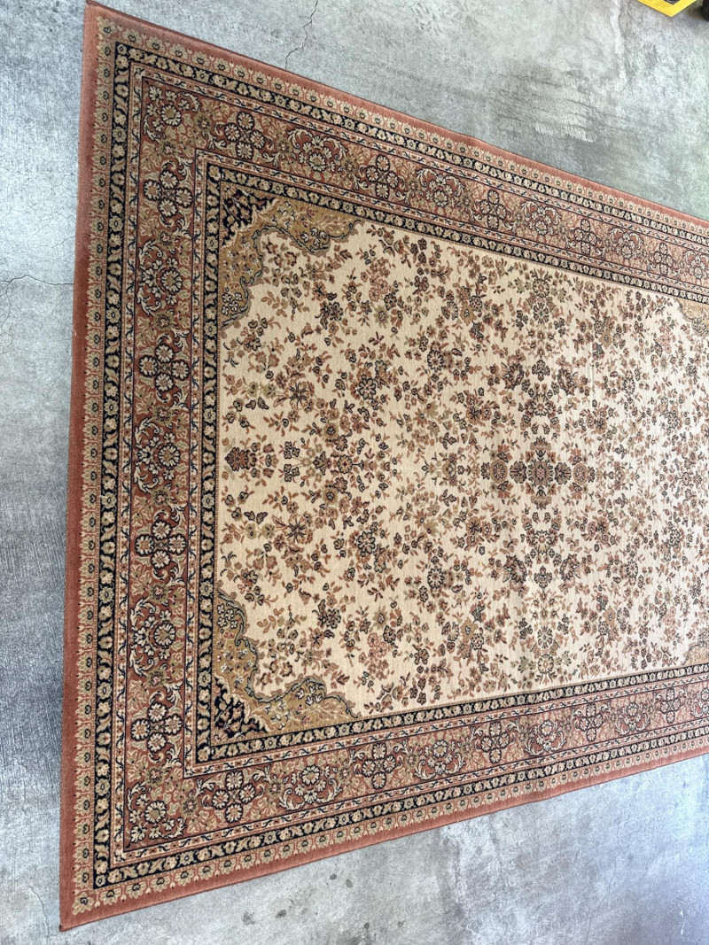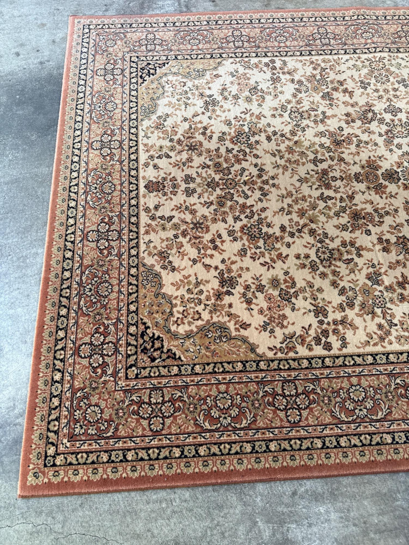 This Persian-style area rug features an elegant all-over floral design in warm beige, rust, and brown tones. The central field is framed by multiple decorative borders, each adorned with symmetrical vine and floral motifs that evoke classic Persian artistry. Its aged patina and rich coloration lend timeless charm, making it a striking accent for traditional interior Design Details: Style: Persian-inspired Pattern: Floral all-over with bordered edges Colors: Beige background with rust, brown, and black accents Collecting Notes:
