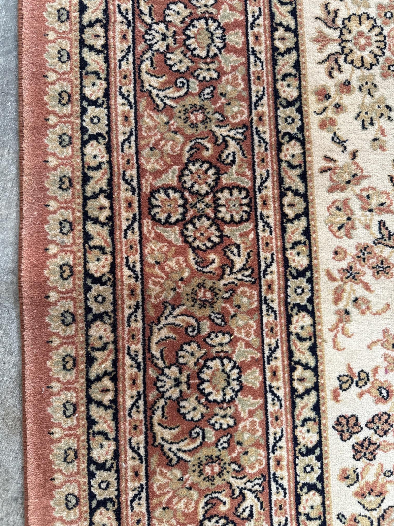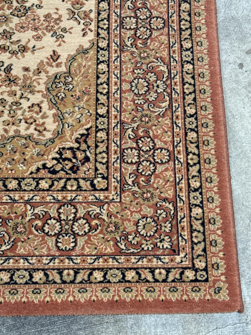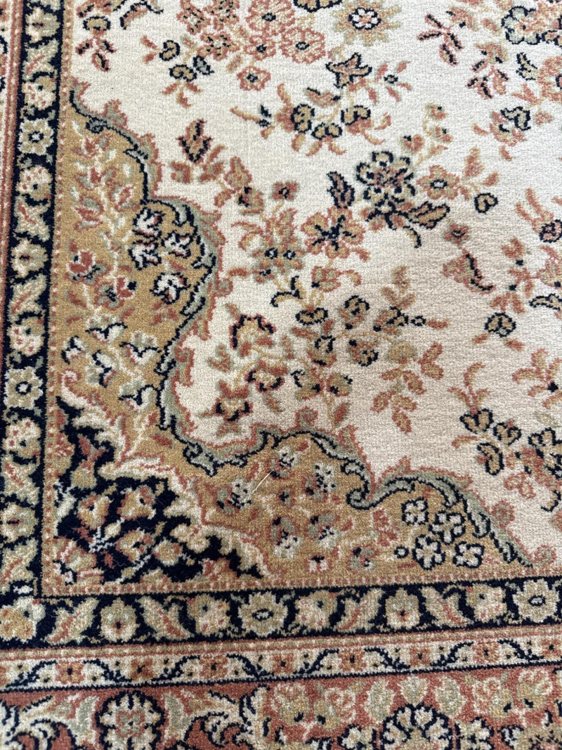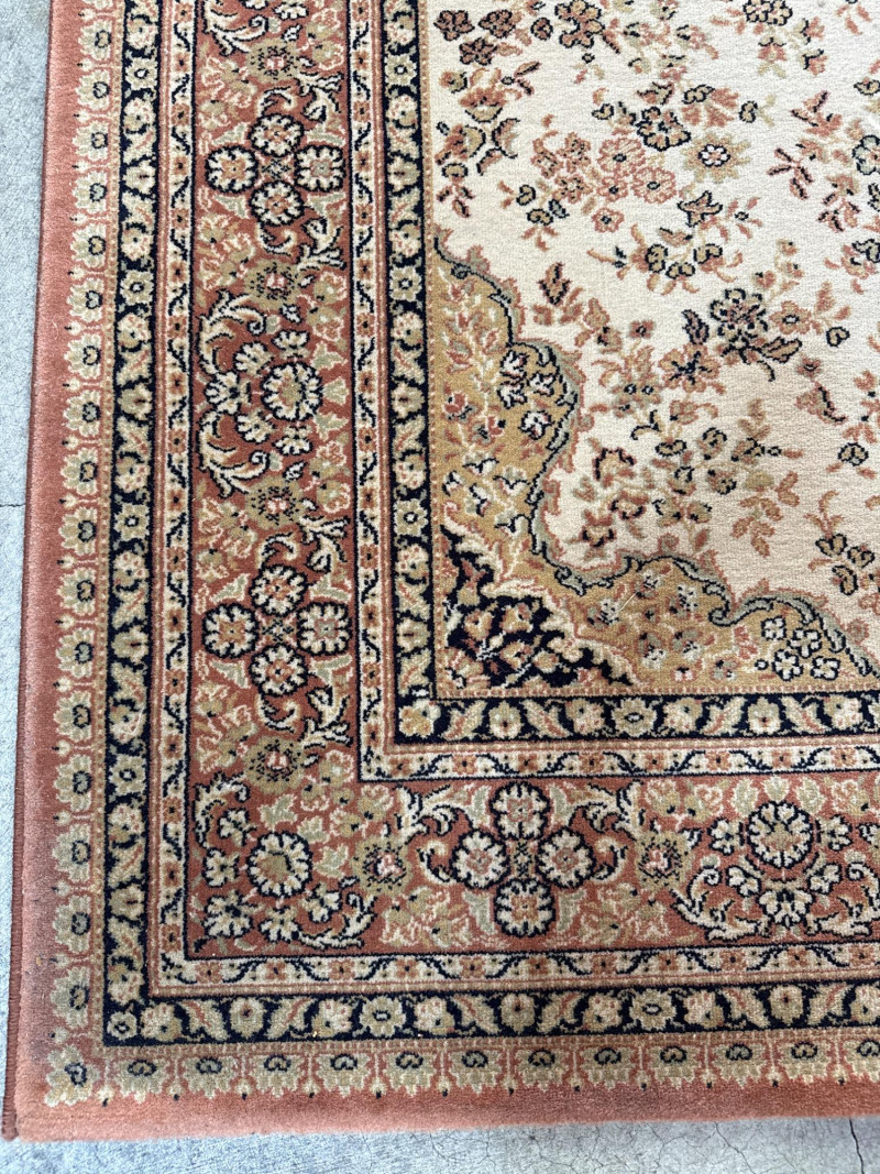 Persian-style rugs are prized for their intricate floral motifs and harmonious border work. This piece, with its aged patina and authentic vintage charm, is ideal for collectors or decorators seeking a classic accent with character. Whether displayed in a formal living room or curated as part of a vintage rug collection, it offers enduring appeal.Persian-Style Floral Area Rug – Beige & Rust Tones