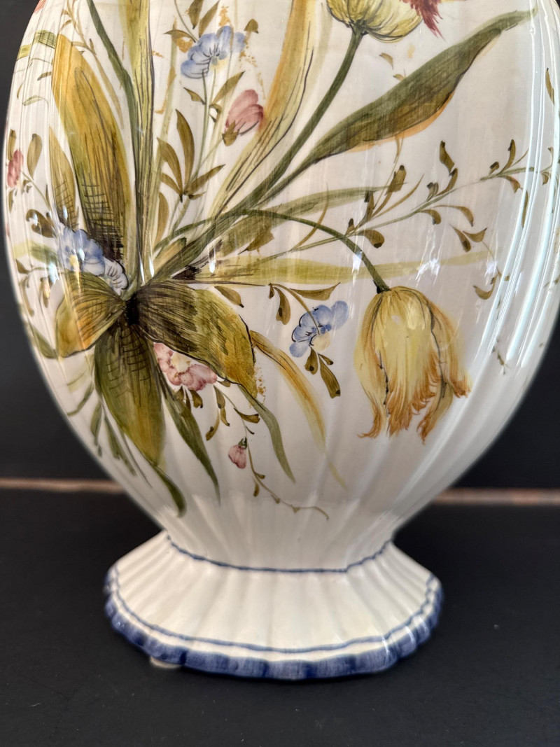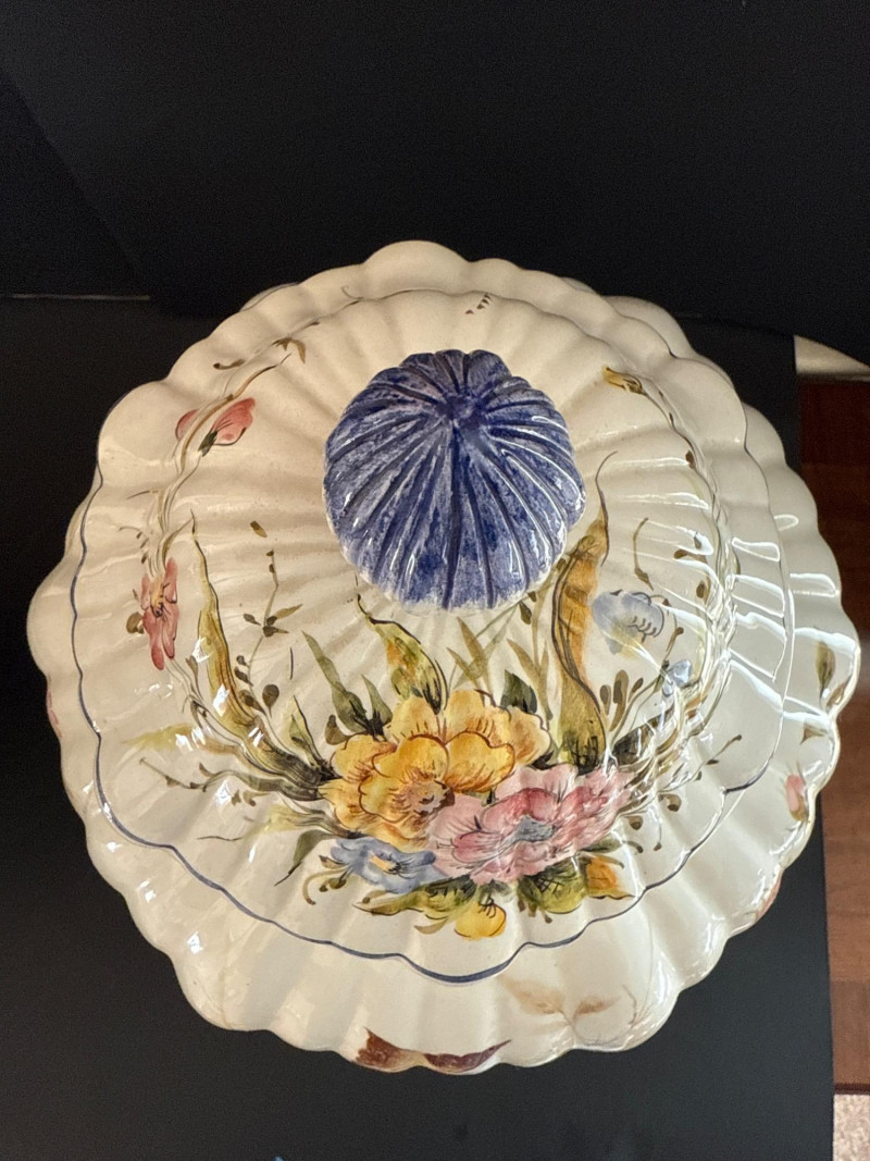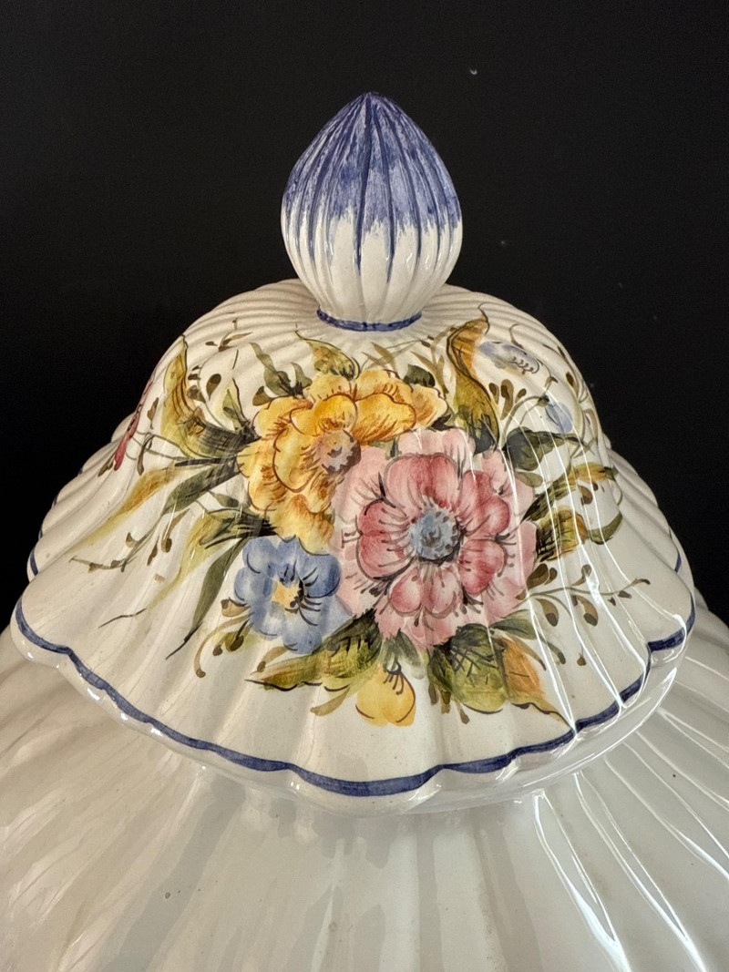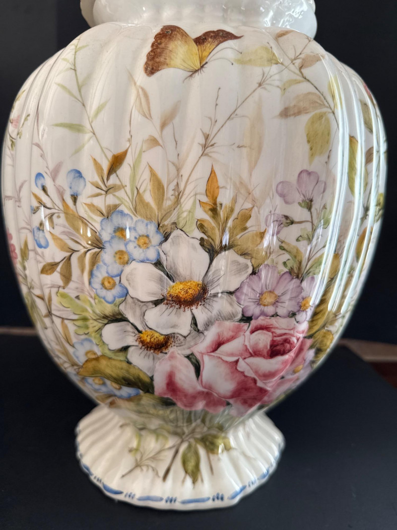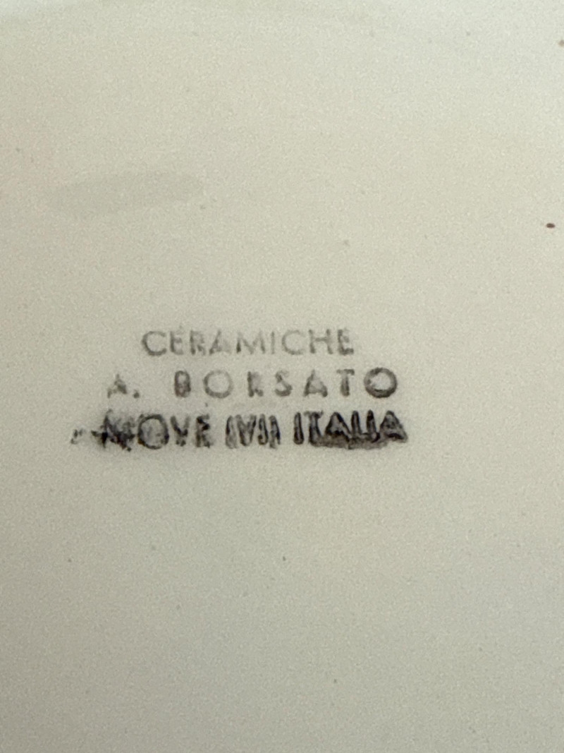 Origin: Nove, Vicenza, Italy A stunning matched pair of Italian ceramic ginger jars, hand-painted with intricate floral and butterfly motifs. These lidded jars feature: Scalloped bases and domed lids with finials Rich blue decorative accents framing a cream ground Light glaze crazing that adds vintage charm Maker’s Mark: Stamped underside reads “Ceramiche A. Borsato – Nove, Italia” Ceramiche A. Borsato was a renowned ceramic studio in Nove, a town famous for its majolica artistry since the 18th century. Known for its hand-painted decorative pieces, the workshop embraced the Venetian ceramic tradition—blending utility with artistic elegance. Their work often features naturalistic themes, especially florals and fauna, rendered with meticulousDescription: