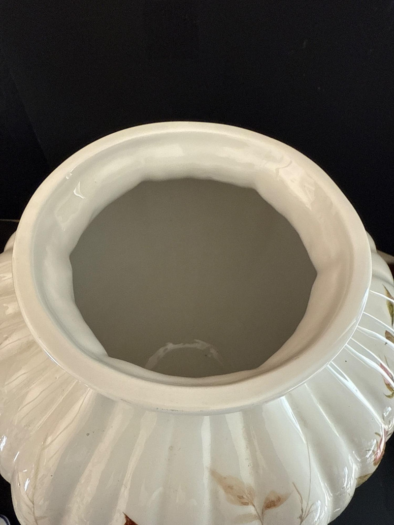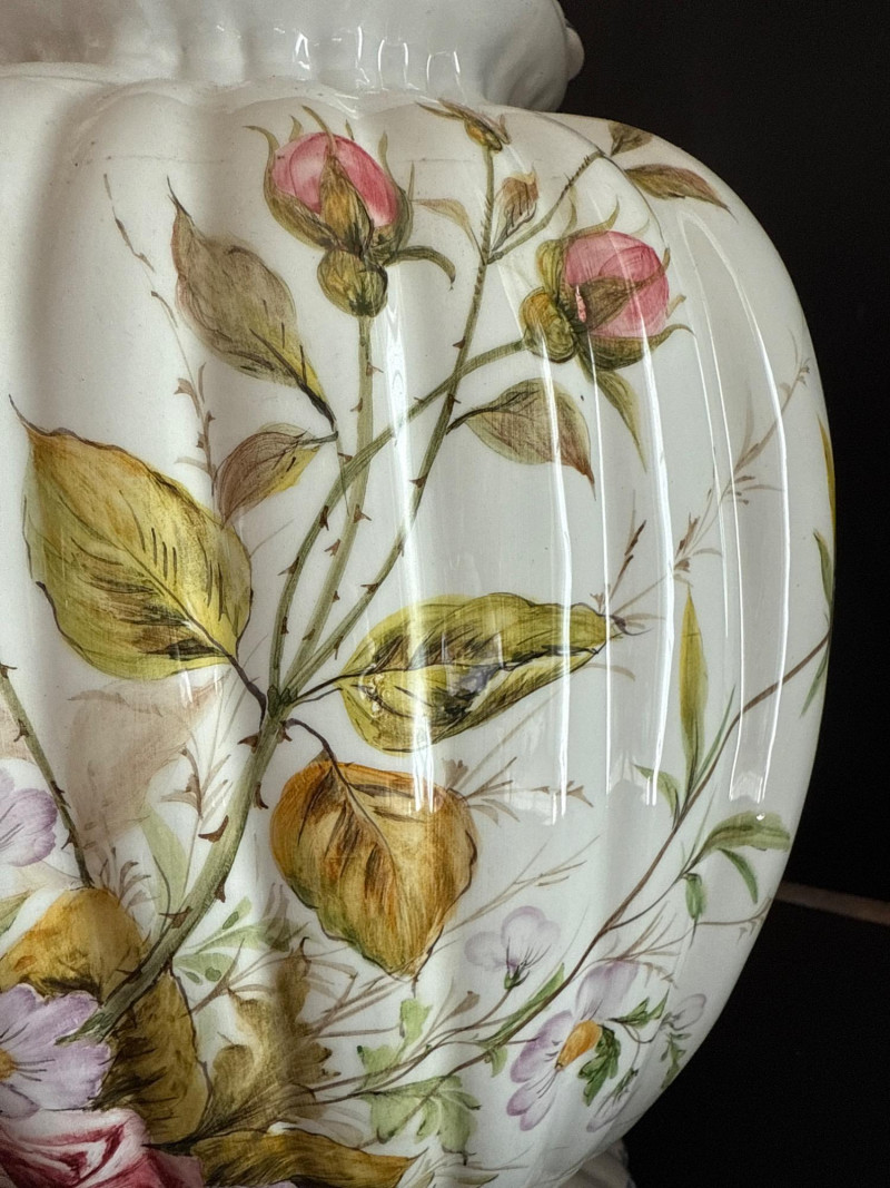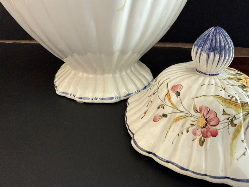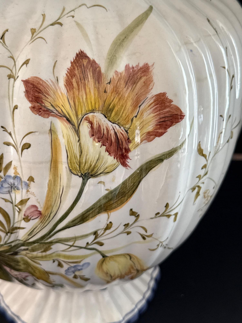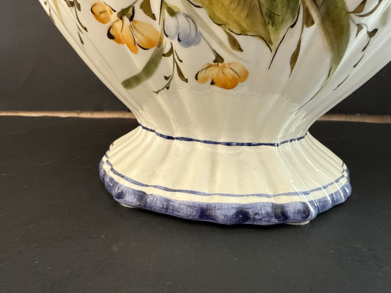 Origin: Nove, Vicenza, Italy A stunning matched pair of Italian ceramic ginger jars, hand-painted with intricate floral and butterfly motifs. These lidded jars feature: Scalloped bases and domed lids with finials Rich blue decorative accents framing a cream ground Light glaze crazing that adds vintage charm Maker’s Mark: Stamped underside reads “Ceramiche A. Borsato – Nove, Italia” Ceramiche A. Borsato was a renowned ceramic studio in Nove, a town famous for its majolica artistry since the 18th century. Known for its hand-painted decorative pieces, the workshop embraced the Venetian ceramic tradition—blending utility with artistic elegance. Their work often features naturalistic themes, especially florals and fauna, rendered with meticulousDescription: