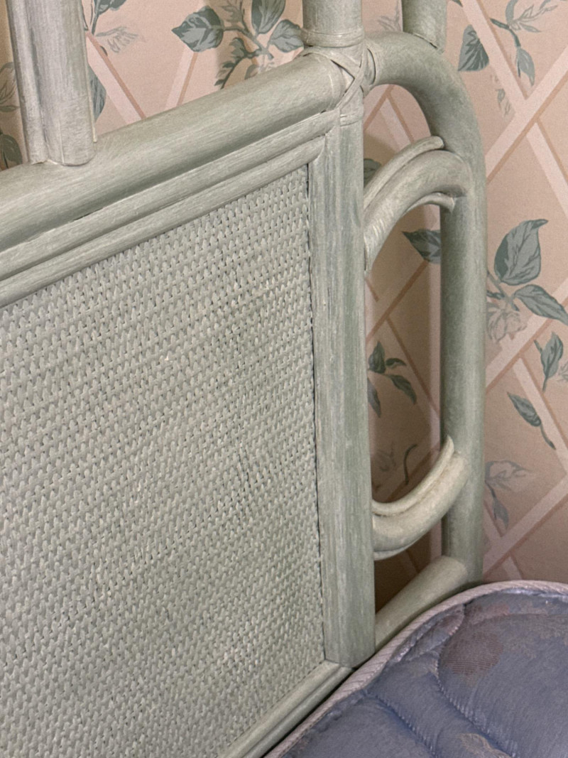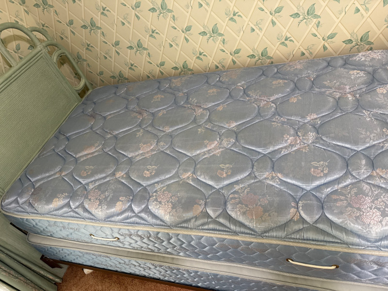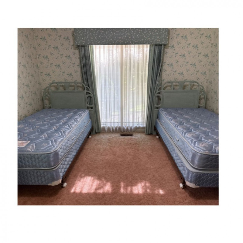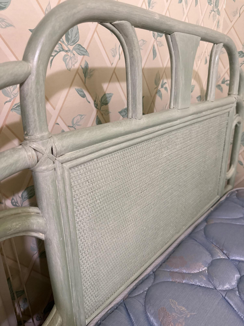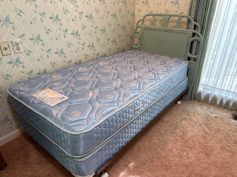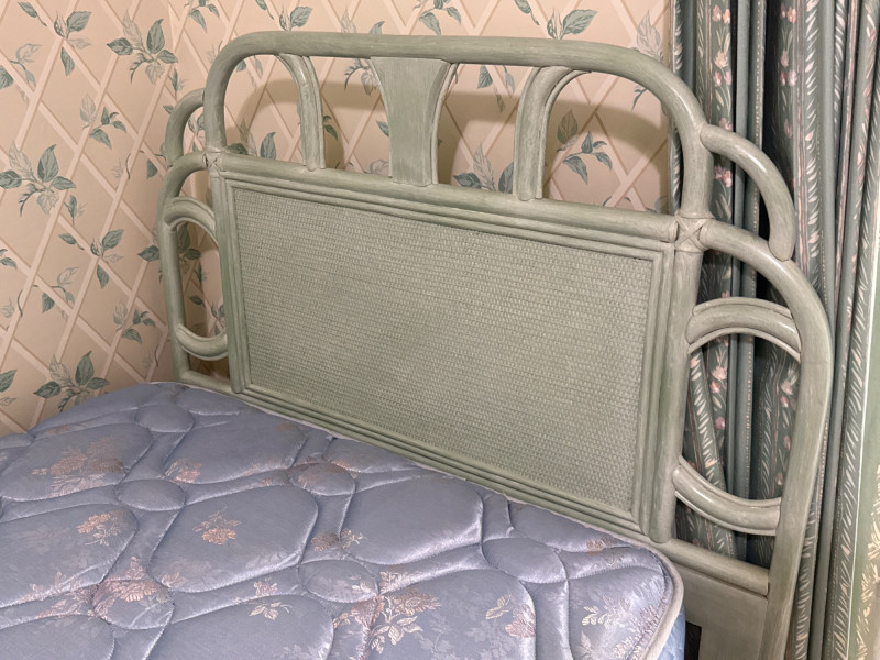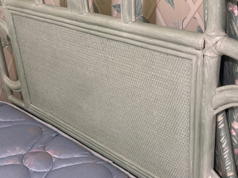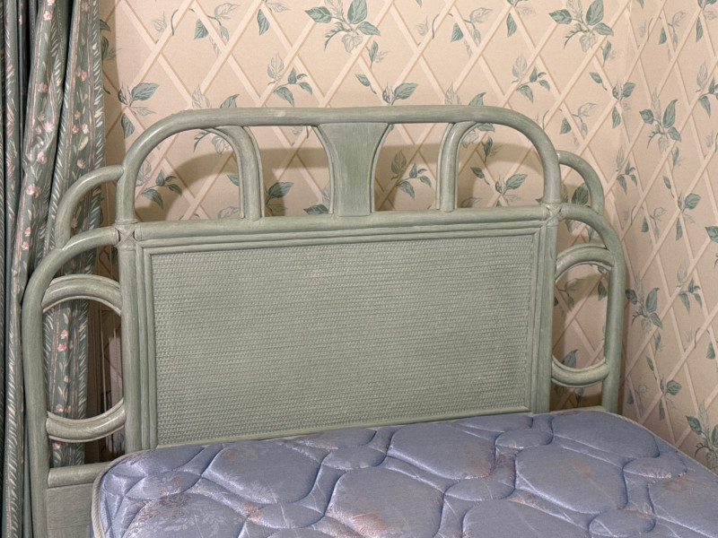 Vintage Twin Beds Ficks Reed Style with Rattan Headboards & Mattresses Bring timeless coastal elegance to your space with this vintage twin bed set styled in the manner of Ficks Reed. Each bed features a painted mint-green rattan frame with an arched headboard and woven cane center panel, offering a breezy, sophisticated look perfect for any coastal or tropical-inspired interior. Design: Painted rattan frames with arched cane panel headboards in Ficks Reed style Mattresses: Spring Air “Back Supporter Prelude” Luxury Firm – appear unused Support System: Matching box springs and metal rolling frames with casters included Headboards: approx. 45" tall × 41" wide Beds: approx. 76" long × 36" wide (standard twin size) Mattresses appear unused and in excellent condition *Tools not available. Bring equipment and help to load.Features: