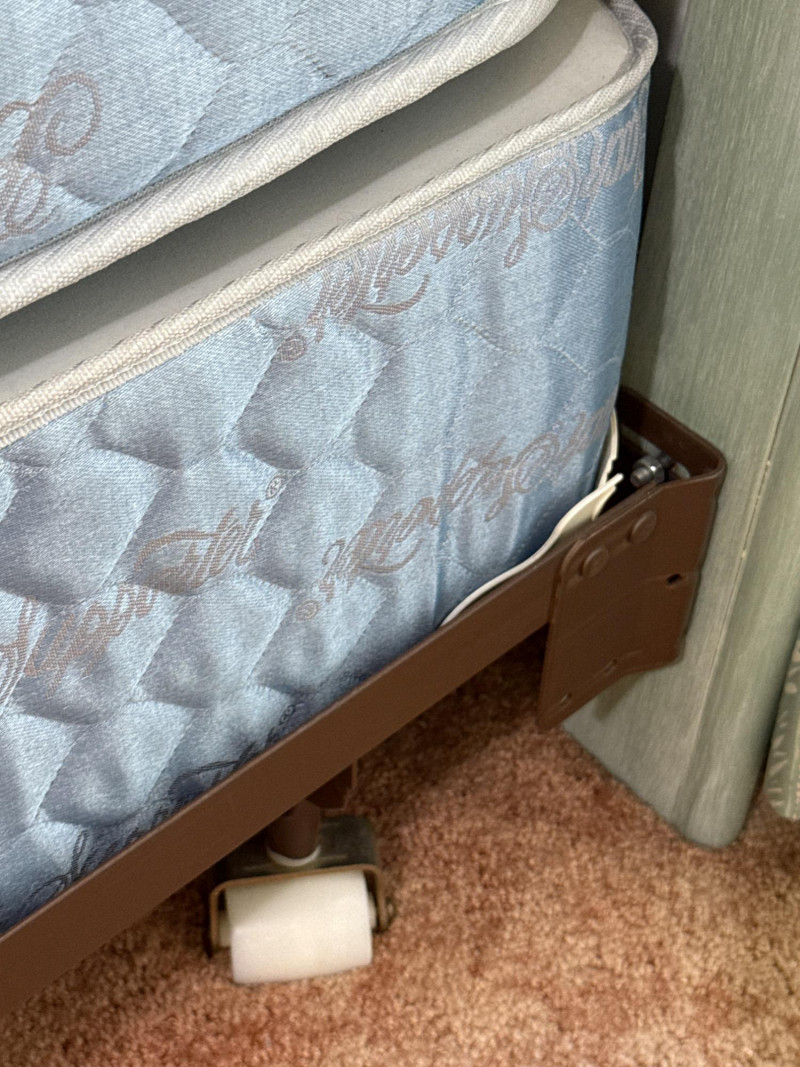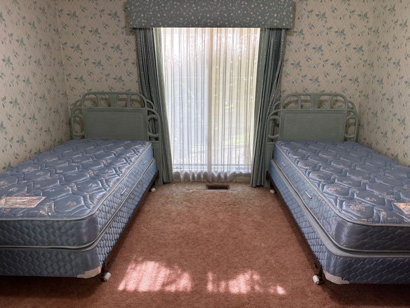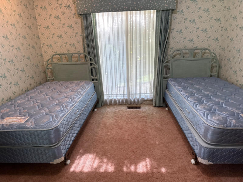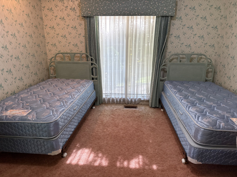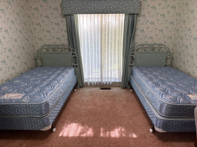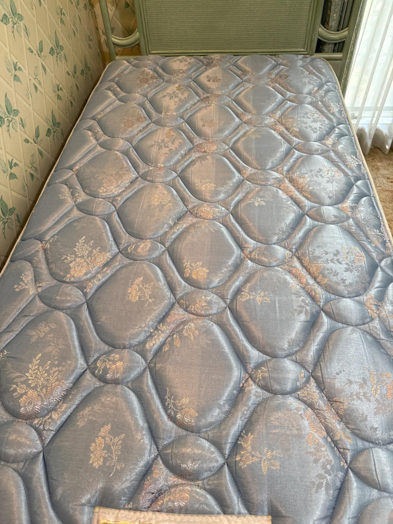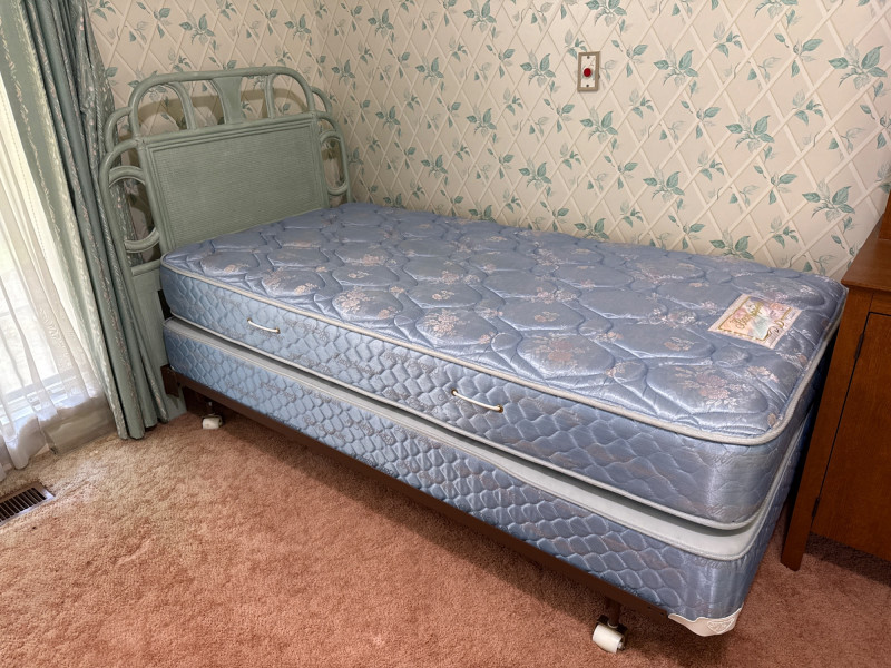 Vintage Twin Beds Ficks Reed Style with Rattan Headboards & Mattresses Bring timeless coastal elegance to your space with this vintage twin bed set styled in the manner of Ficks Reed. Each bed features a painted mint-green rattan frame with an arched headboard and woven cane center panel, offering a breezy, sophisticated look perfect for any coastal or tropical-inspired interior. Design: Painted rattan frames with arched cane panel headboards in Ficks Reed style Mattresses: Spring Air “Back Supporter Prelude” Luxury Firm – appear unused Support System: Matching box springs and metal rolling frames with casters included Headboards: approx. 45" tall × 41" wide Beds: approx. 76" long × 36" wide (standard twin size) Mattresses appear unused and in excellent condition *Tools not available. Bring equipment and help to load.Features: