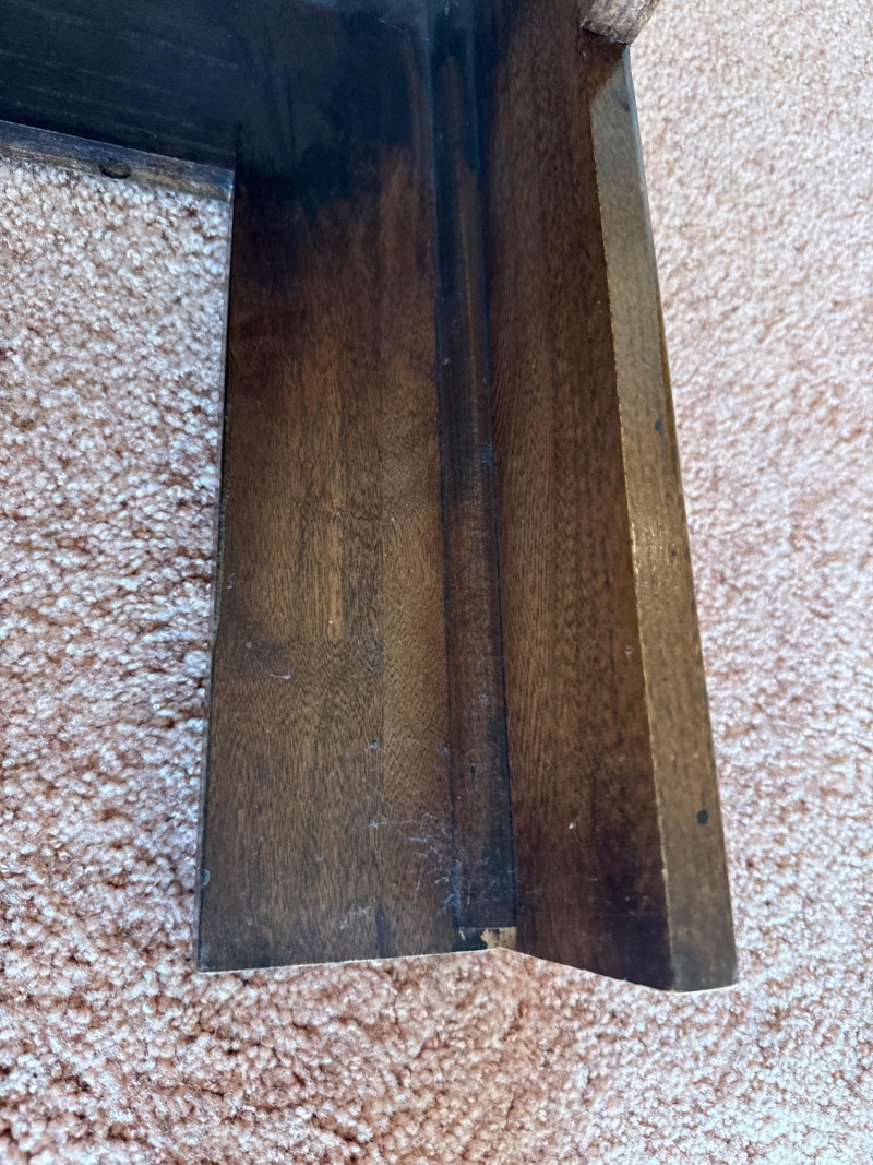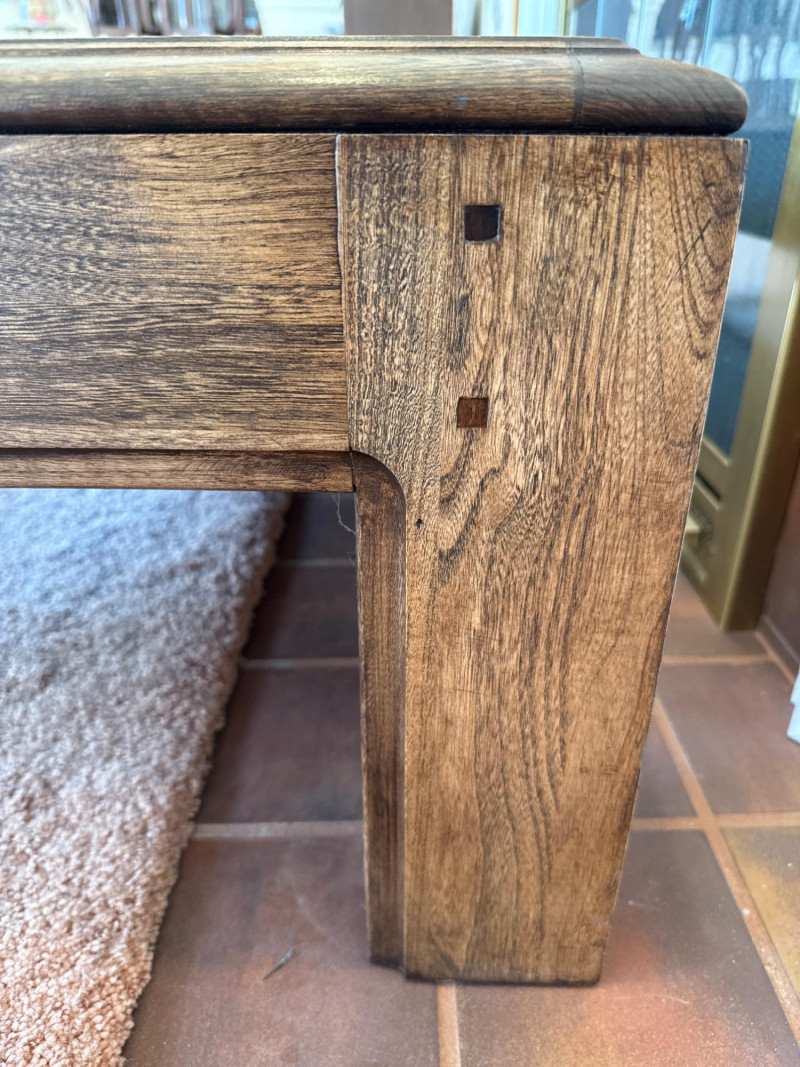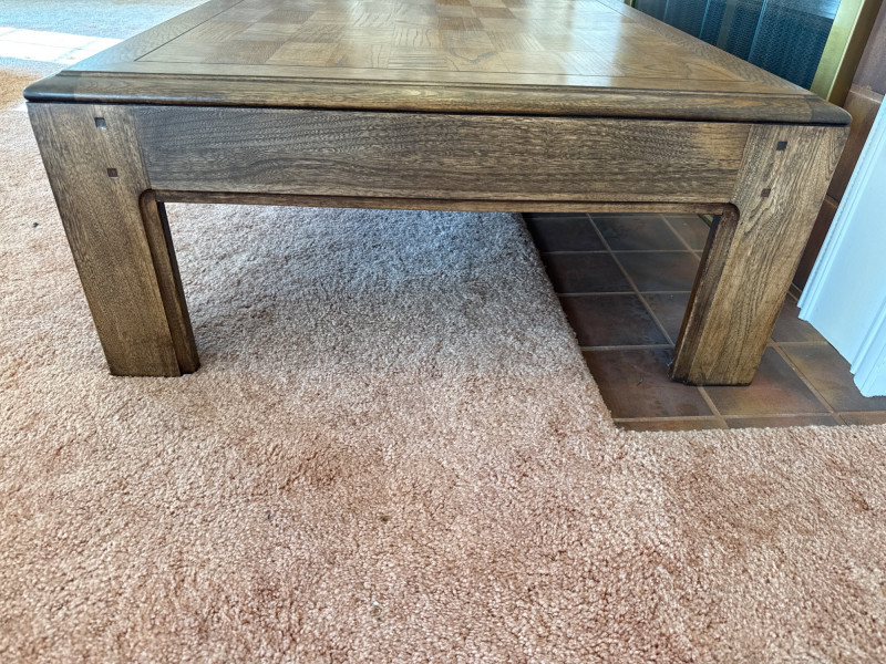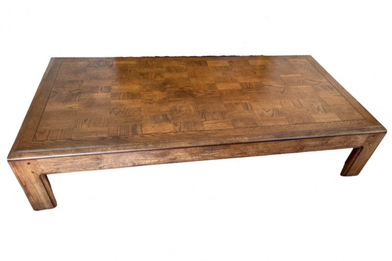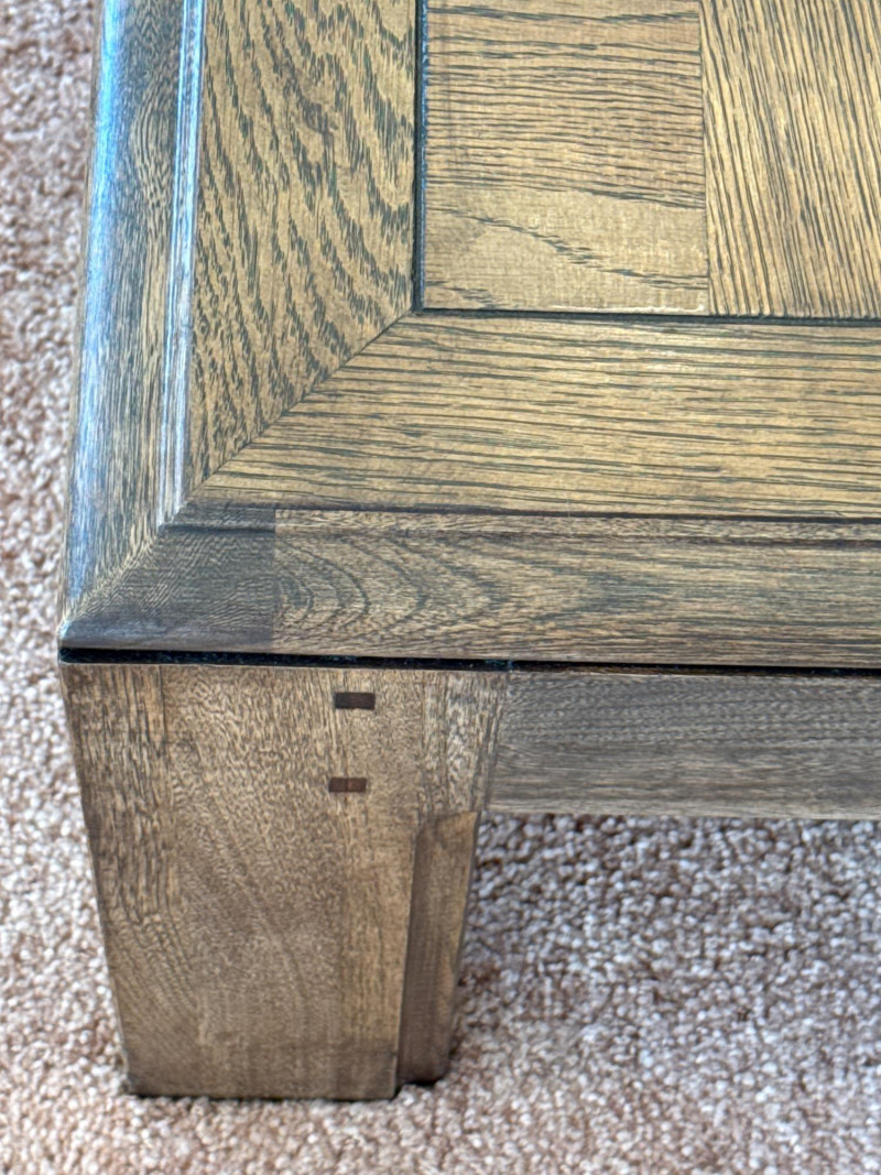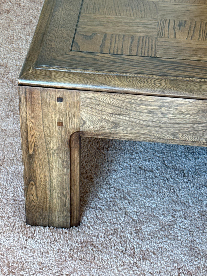 Material: Oak veneer with solid wood framing Design Features: Geometric parquet veneer top Framed border detail Sturdy squared legs with subtle notched joinery accents About the Maker: