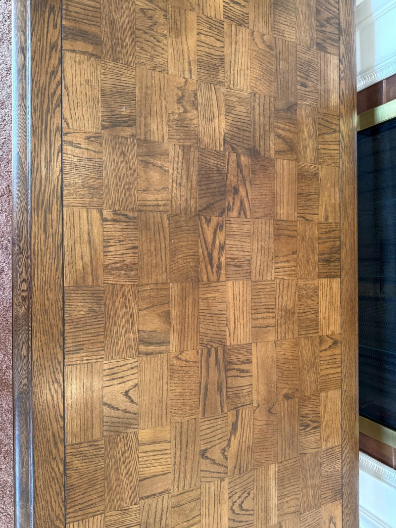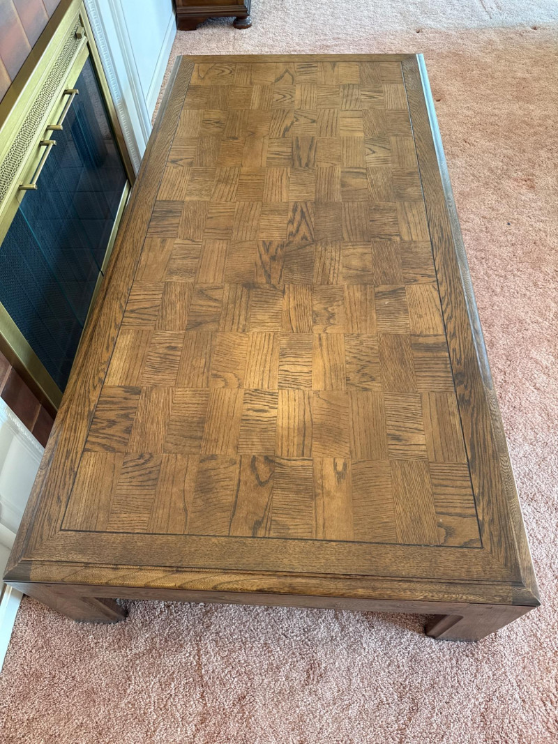 MCM Lane Altavista Parquet Top Coffee Table – 1976 A vintage Lane Furniture coffee table, manufactured in Altavista, Virginia, on March 5, 1976 (Serial No. 4675030, Style No. 1396-91).