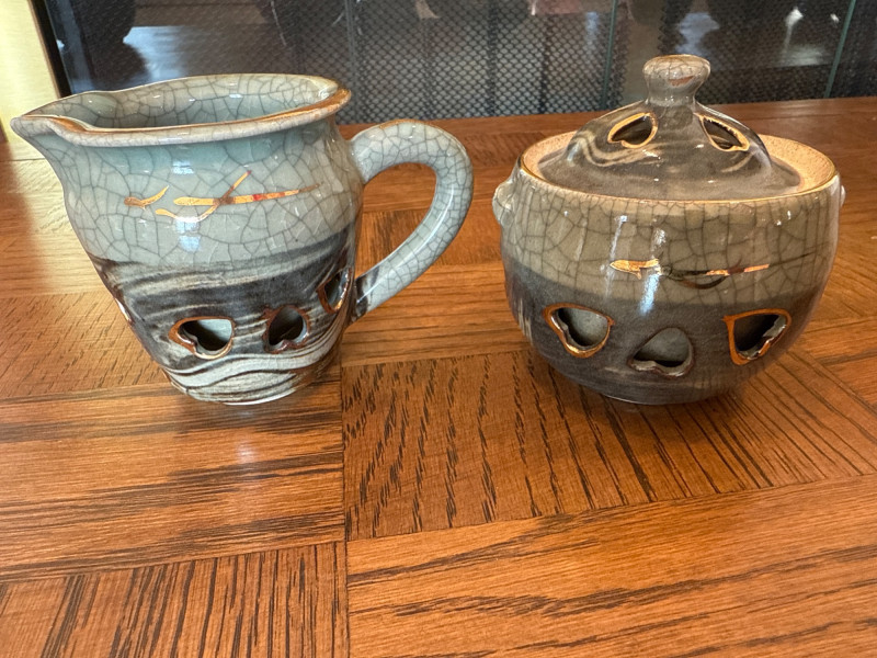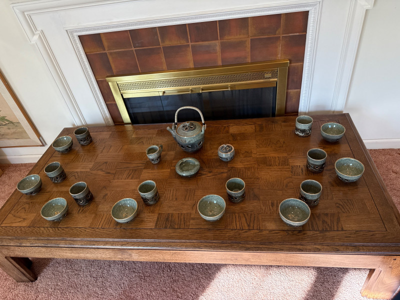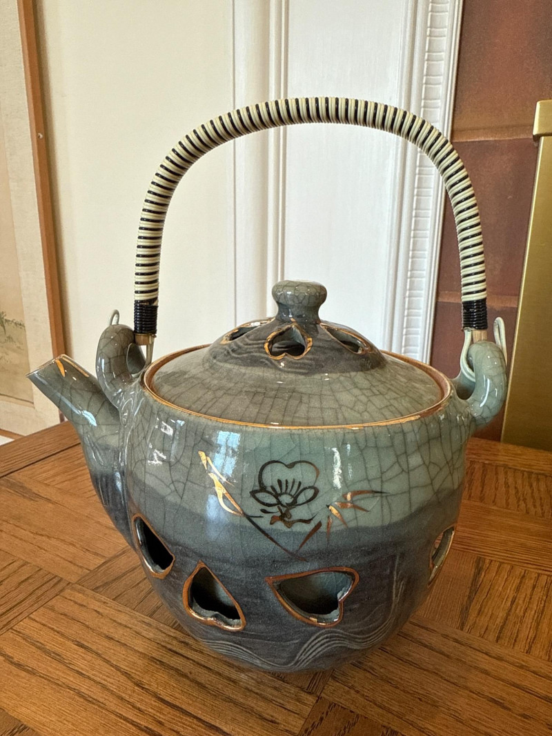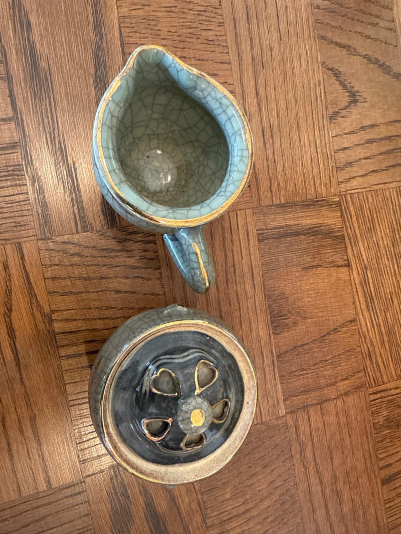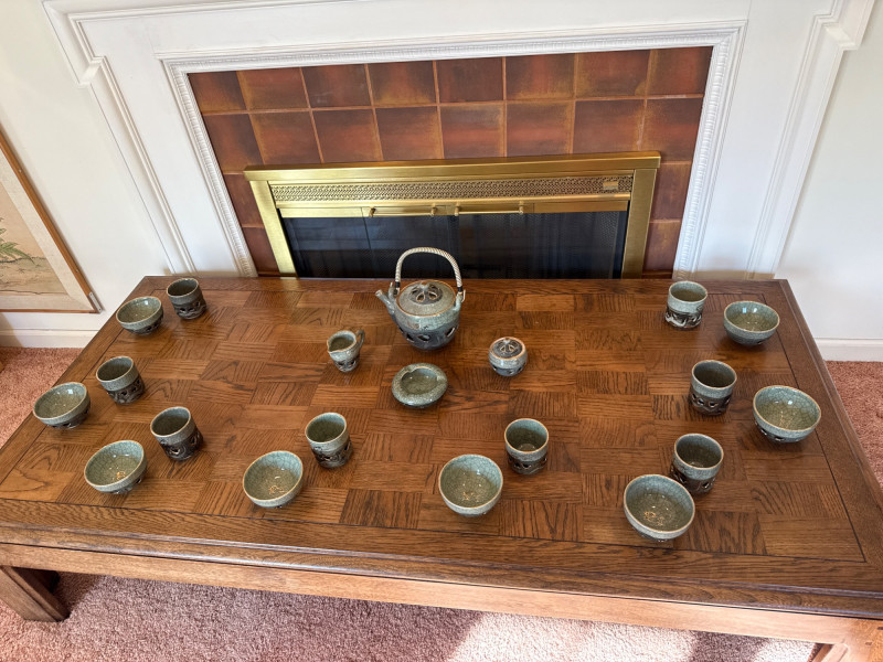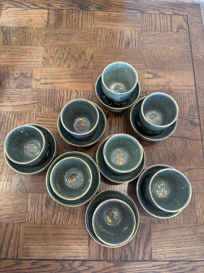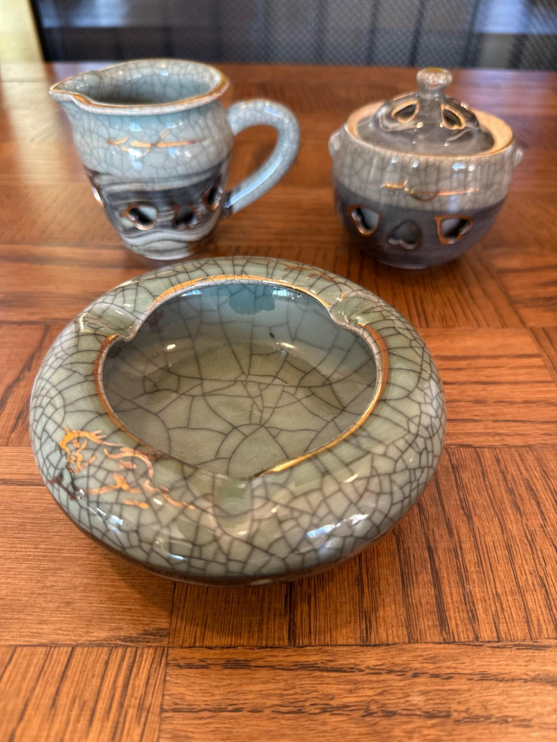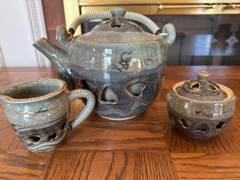 A rare and complete 20-piece Somayaki tea set from mid-century Japan, showcasing the iconic Aohibi (blue-green crackle) glaze and gilt Hashirigoma (running horse) motif—symbols of vitality and samurai heritage. Crafted in Fukushima, this set reflects the enduring artistry of Soma Ware, known for its double-walled construction with heart-shaped cut-outs that insulate heat while remaining cool to the touch. This vintage 20-piece Somayaki tea set from Japan features: 1 Teapot with wicker handle 1 Sugar jar with lid 1 Creamer pitcher Multiple tea cups, bowls, and serving dishes Highlights: Rare Aohibi (blue-green) crackle glaze Gilt Hashirigoma (running horse) motif Double-walled ceramic with heart-shaped cut-outs Origin: Fukushima, Japan | Mid-20th century export ware Somayaki pottery hails from Fukushima, Japan, with roots in the 17th century under the Soma samurai clan. Known for its double-walled construction and heart-shaped cut-outs, it features the Aohibi crackle glaze and the Hashirigoma (running horse) motif—symbols of vitality and freedom. Popularized in the mid-20th century, Somayaki pieces were widely exported and remain prized for their craftsmanship and cultural heritage.About Somayaki (Soma Ware)