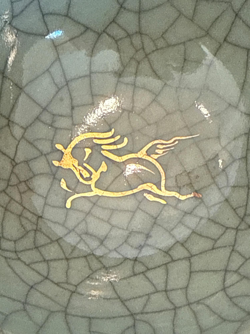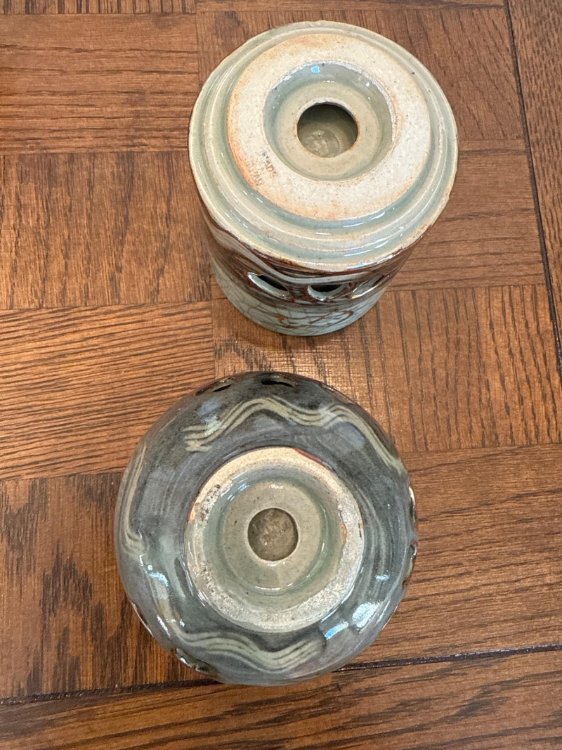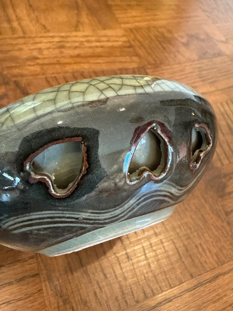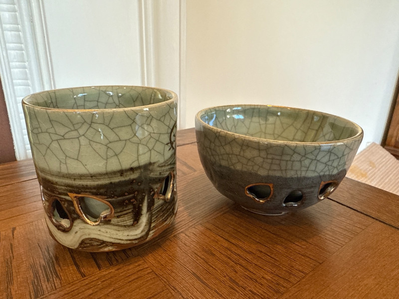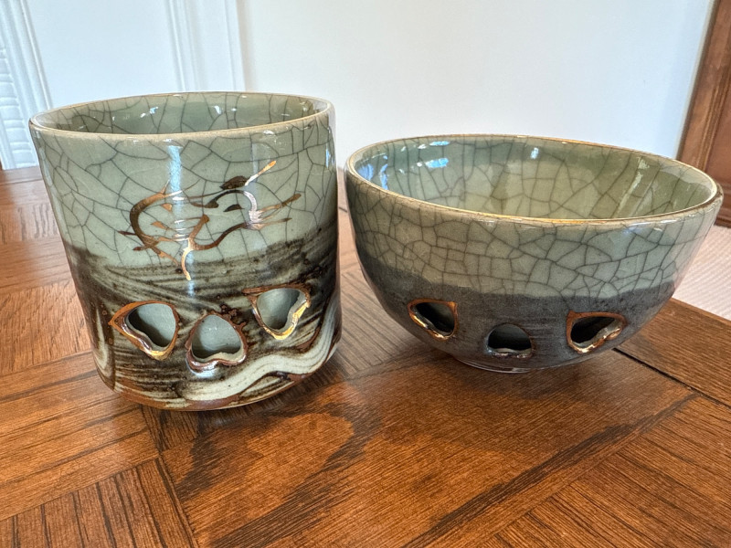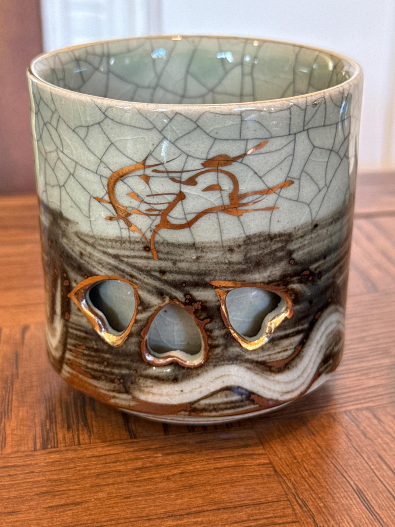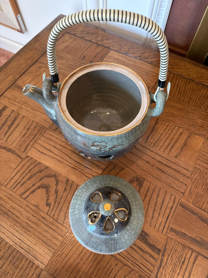 A rare and complete 20-piece Somayaki tea set from mid-century Japan, showcasing the iconic Aohibi (blue-green crackle) glaze and gilt Hashirigoma (running horse) motif—symbols of vitality and samurai heritage. Crafted in Fukushima, this set reflects the enduring artistry of Soma Ware, known for its double-walled construction with heart-shaped cut-outs that insulate heat while remaining cool to the touch. This vintage 20-piece Somayaki tea set from Japan features: 1 Teapot with wicker handle 1 Sugar jar with lid 1 Creamer pitcher Multiple tea cups, bowls, and serving dishes Highlights: Rare Aohibi (blue-green) crackle glaze Gilt Hashirigoma (running horse) motif Double-walled ceramic with heart-shaped cut-outs Origin: Fukushima, Japan | Mid-20th century export ware Somayaki pottery hails from Fukushima, Japan, with roots in the 17th century under the Soma samurai clan. Known for its double-walled construction and heart-shaped cut-outs, it features the Aohibi crackle glaze and the Hashirigoma (running horse) motif—symbols of vitality and freedom. Popularized in the mid-20th century, Somayaki pieces were widely exported and remain prized for their craftsmanship and cultural heritage.About Somayaki (Soma Ware)