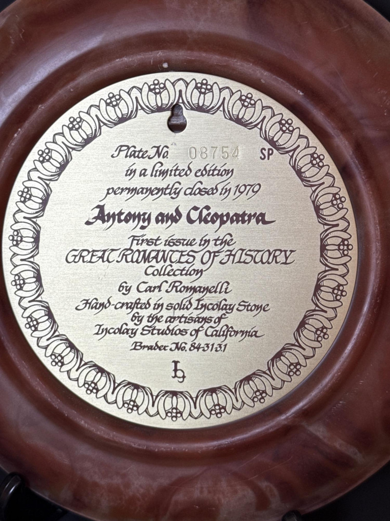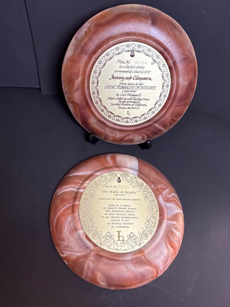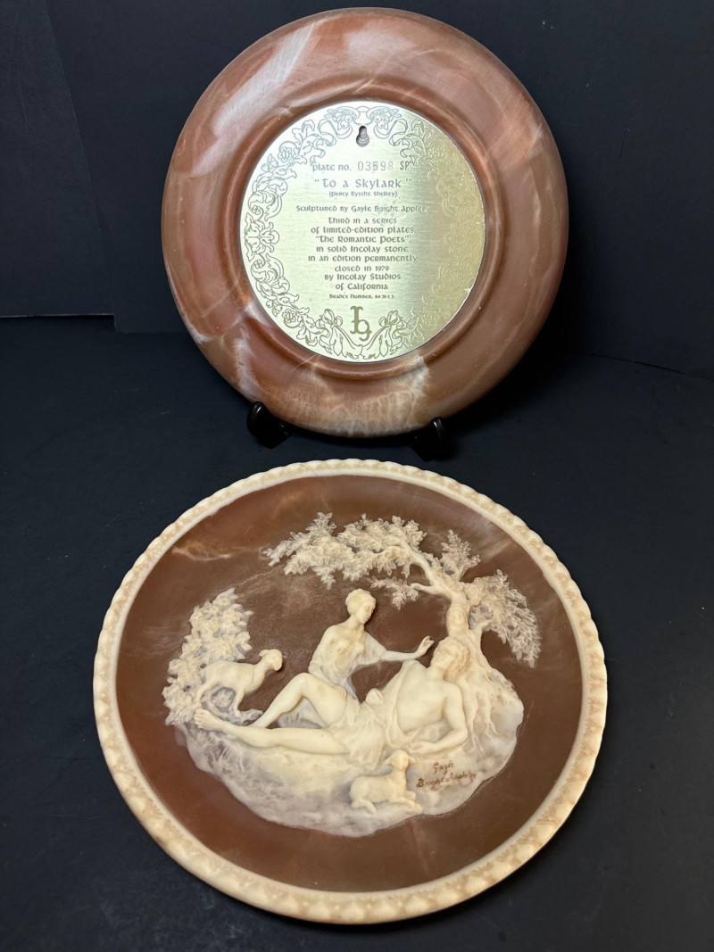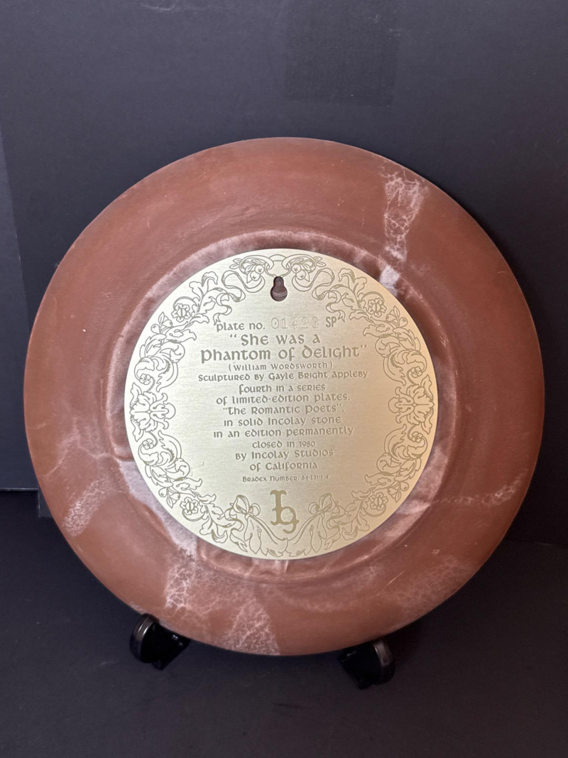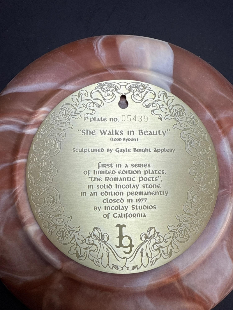 Incolay Studios Collector Plate Set – Romantic Poets & Great Romances of History A rare and elegant collection of five limited-edition collector plates, hand-crafted by the artisans of Incolay Studios in California. Sculpted in high relief from solid Incolay stone—a proprietary blend of natural minerals—each plate features detailed cameo-style artwork inspired by classic poetry and historical romance. Titles included in this lot: She Walks in Beauty by Lord Byron – First in the Romantic Poets series, sculpted by Gayle Bright Appleby, edition closed in 1977. A Thing of Beauty by John Keats – Second in the Romantic Poets series, sculpted by Gayle Bright Appleby, edition closed in 1978. To a Skylark by Percy Bysshe Shelley – Third in the Romantic Poets series, sculpted by Gayle Bright Appleby, edition closed in 1979. She Was a Phantom of Delight by William Wordsworth – Fourth in the Romantic Poets series, sculpted by Gayle Bright Appleby, edition closed in 1980. Antony and Cleopatra – First issue in the Great Romances of History collection, sculpted by Carl Romanelli, edition closed in 1979. About the Maker: