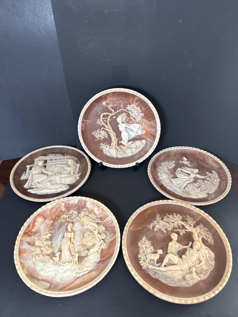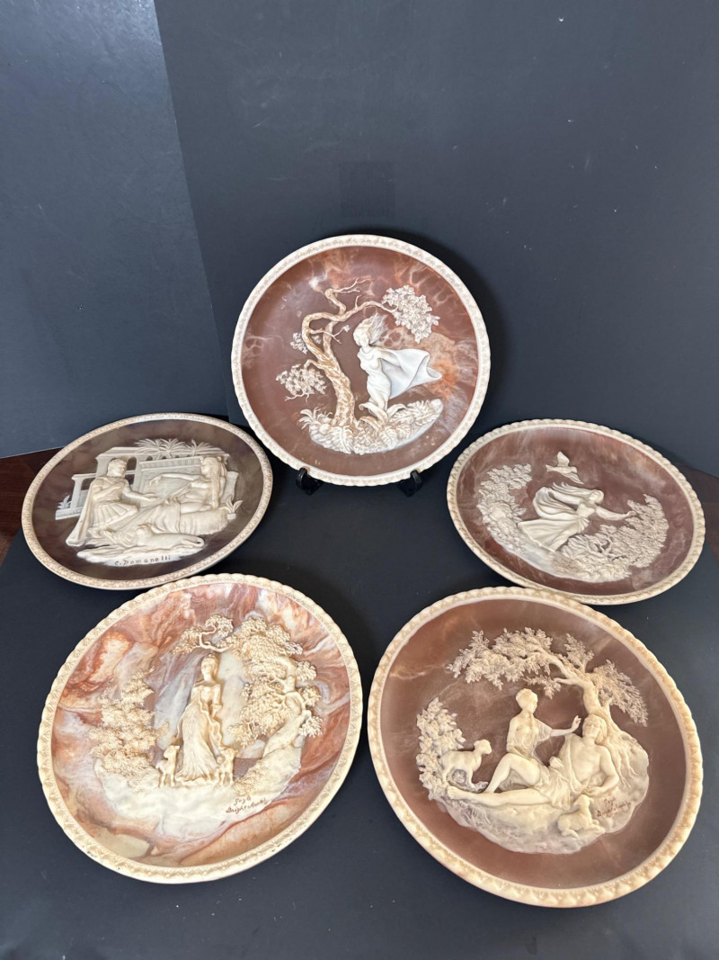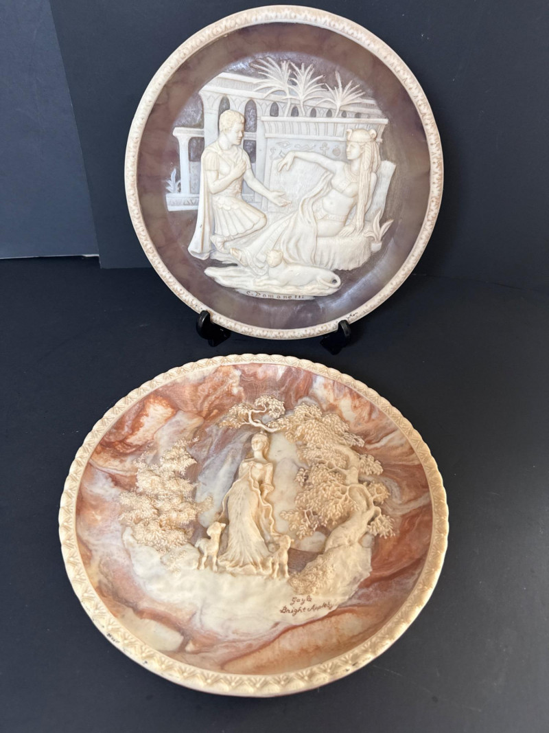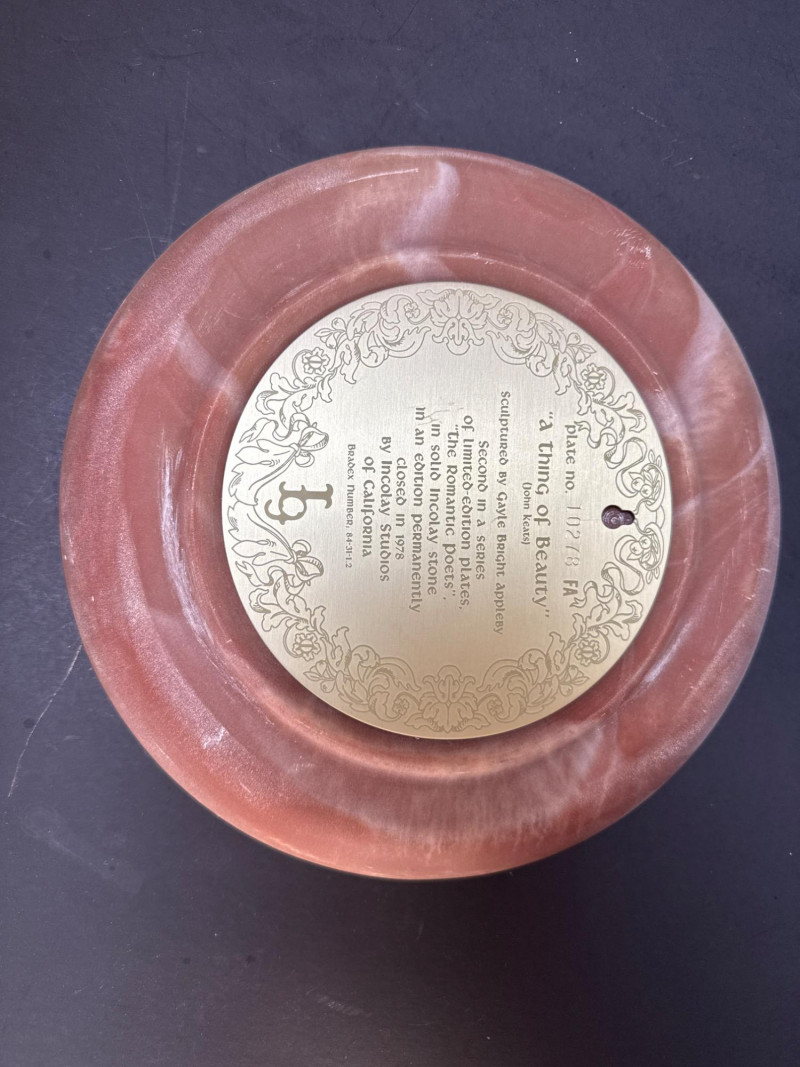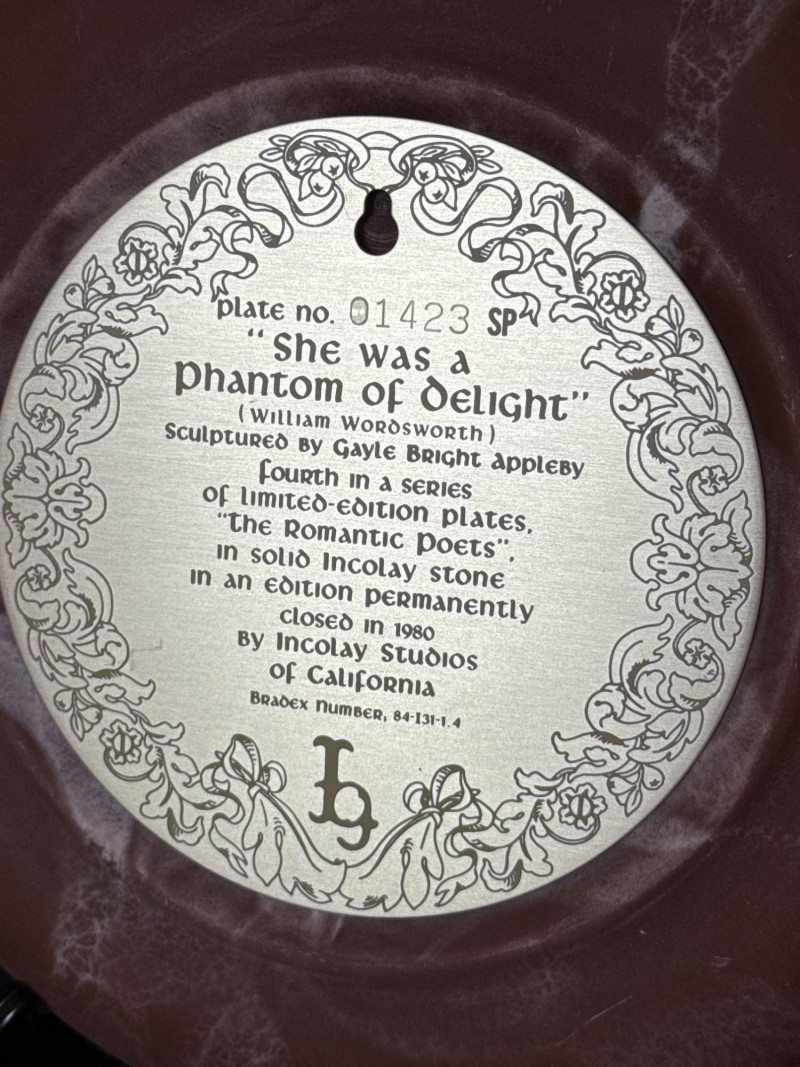 Incolay Studios Collector Plate Set – Romantic Poets & Great Romances of History A rare and elegant collection of five limited-edition collector plates, hand-crafted by the artisans of Incolay Studios in California. Sculpted in high relief from solid Incolay stone—a proprietary blend of natural minerals—each plate features detailed cameo-style artwork inspired by classic poetry and historical romance. Titles included in this lot: She Walks in Beauty by Lord Byron – First in the Romantic Poets series, sculpted by Gayle Bright Appleby, edition closed in 1977. A Thing of Beauty by John Keats – Second in the Romantic Poets series, sculpted by Gayle Bright Appleby, edition closed in 1978. To a Skylark by Percy Bysshe Shelley – Third in the Romantic Poets series, sculpted by Gayle Bright Appleby, edition closed in 1979. She Was a Phantom of Delight by William Wordsworth – Fourth in the Romantic Poets series, sculpted by Gayle Bright Appleby, edition closed in 1980. Antony and Cleopatra – First issue in the Great Romances of History collection, sculpted by Carl Romanelli, edition closed in 1979. About the Maker: