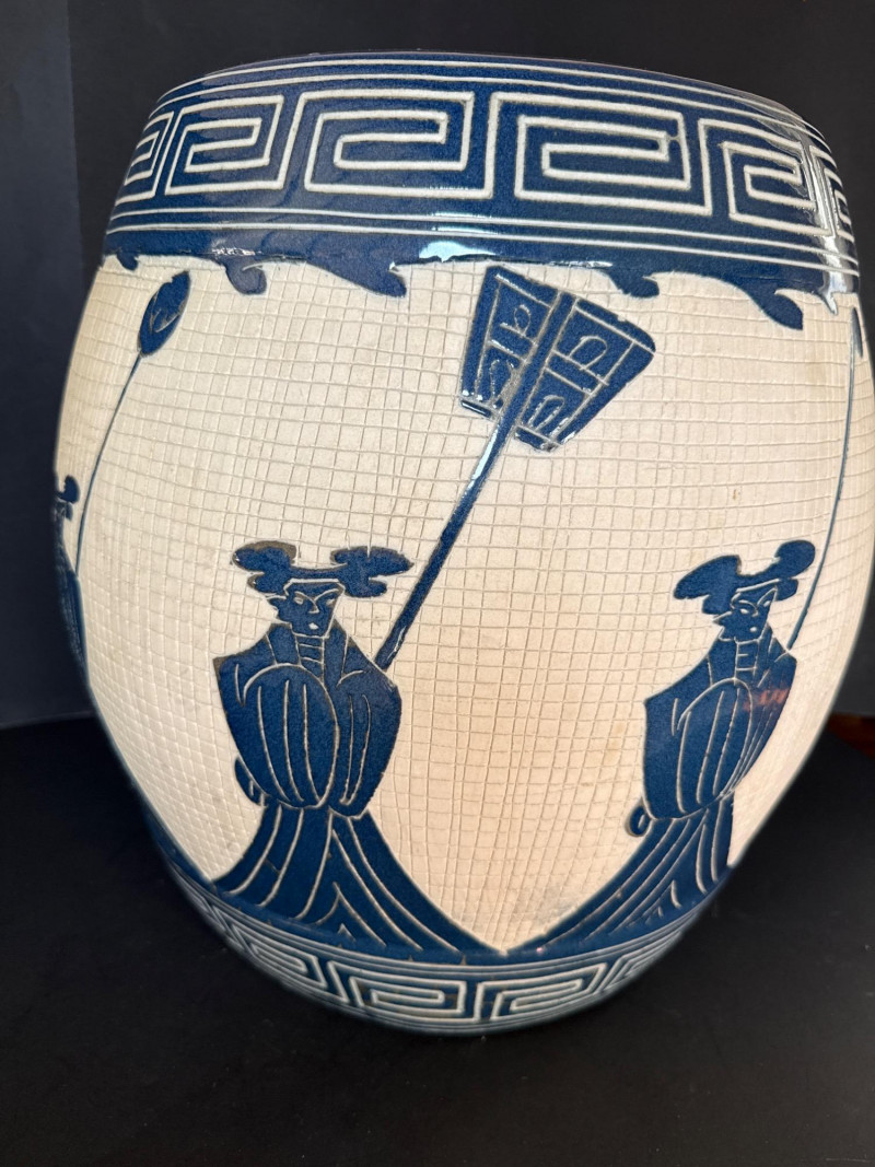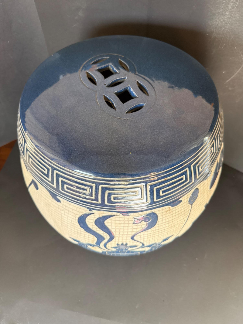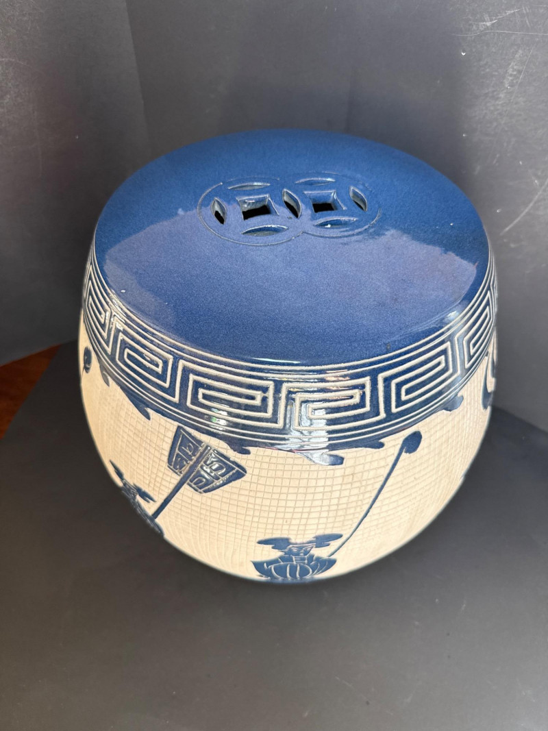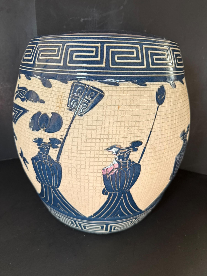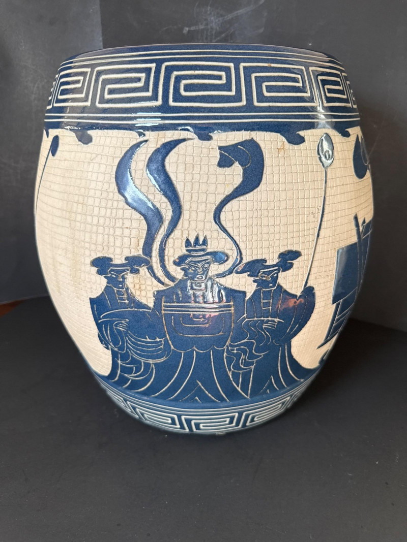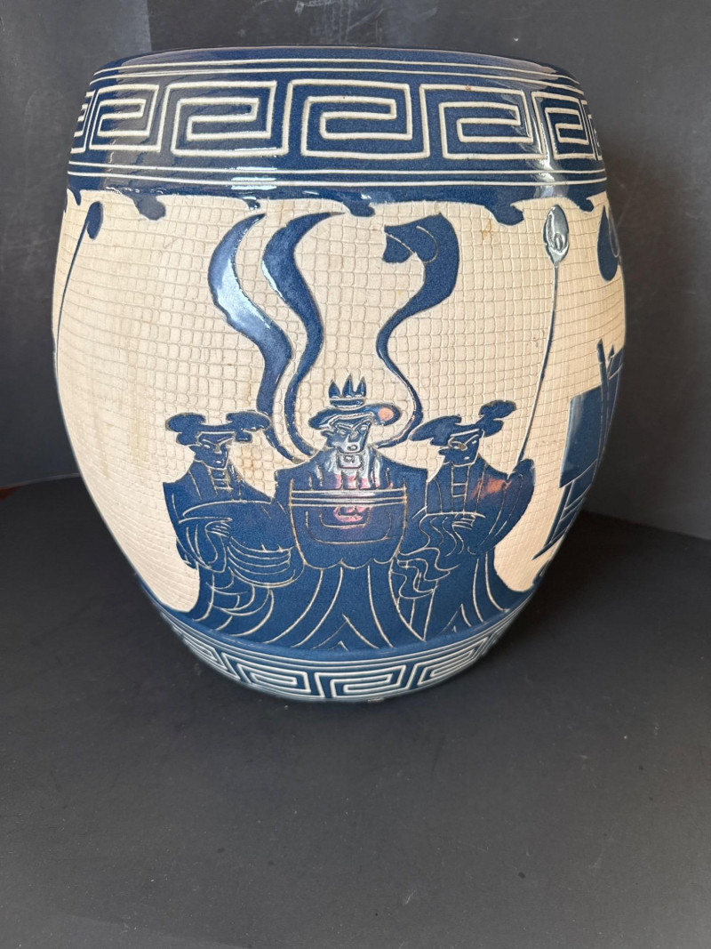 Asian Blue & White Garden Stool / Plant Stand Barrel-shaped garden stool in a traditional blue-and-white palette. The surface features a crackle glaze with figural procession scenes—attendants, banners, and a central seated figure—framed by classic Greek key borders. The pierced top allows it to serve as a stool, side table, or decorative plant stand. Material: Glazed finish with crackle effect (exact base material unknown)