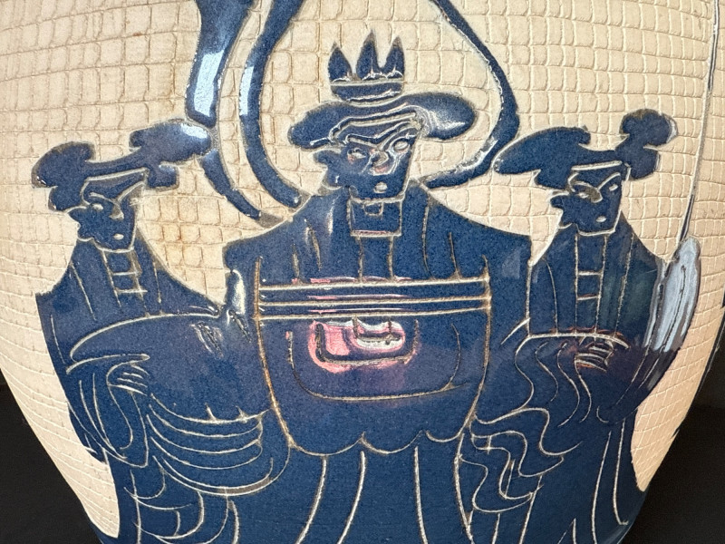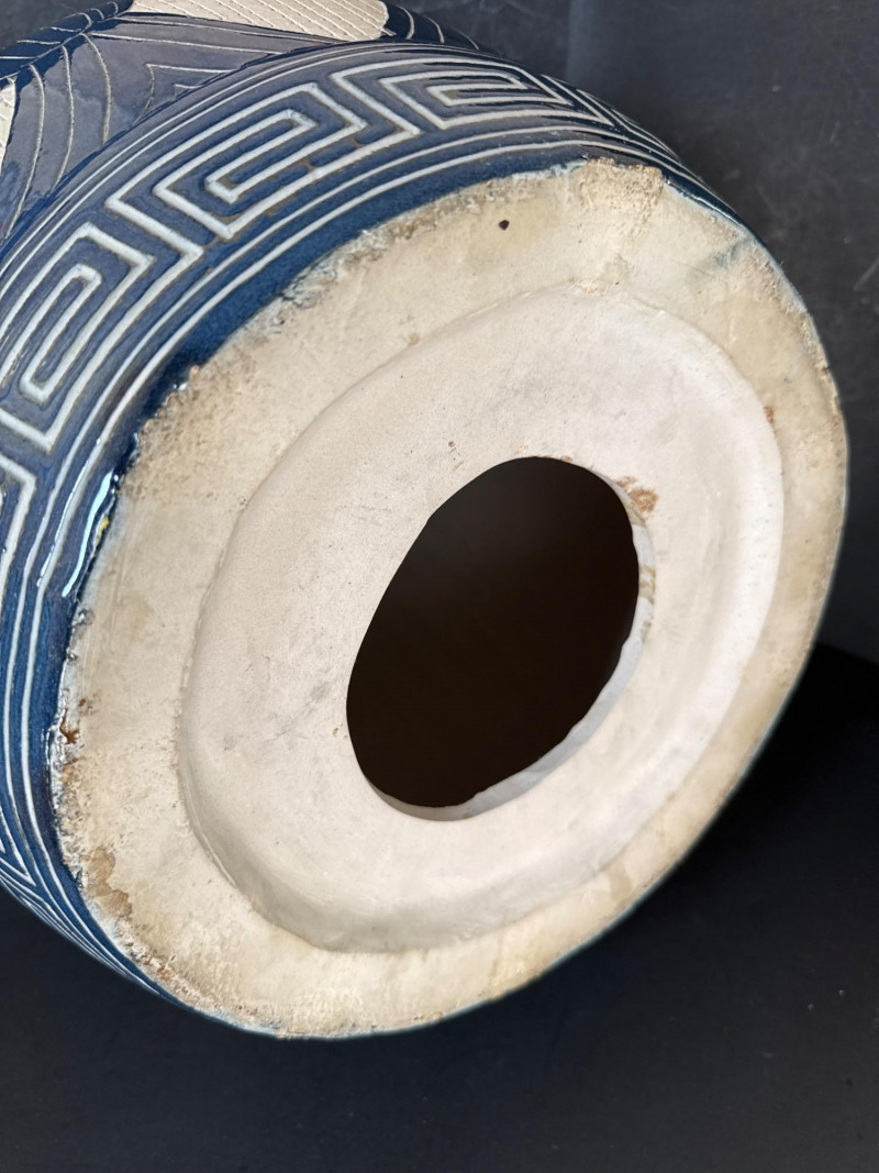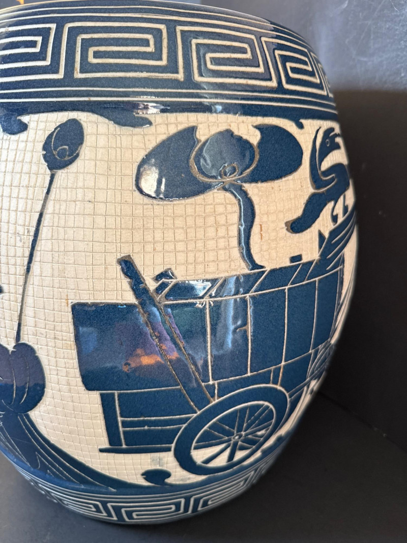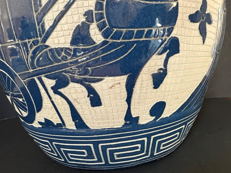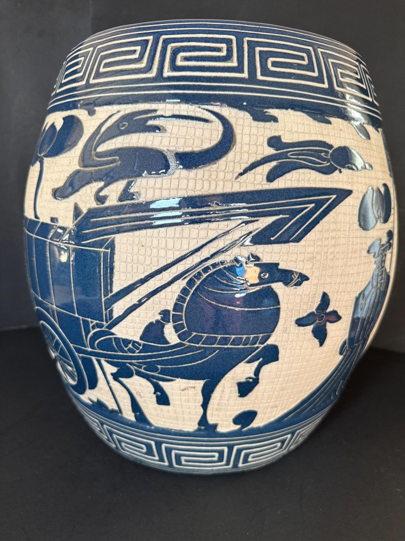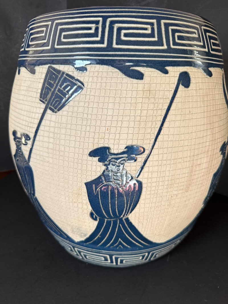 Asian Blue & White Garden Stool / Plant Stand Barrel-shaped garden stool in a traditional blue-and-white palette. The surface features a crackle glaze with figural procession scenes—attendants, banners, and a central seated figure—framed by classic Greek key borders. The pierced top allows it to serve as a stool, side table, or decorative plant stand. Material: Glazed finish with crackle effect (exact base material unknown)