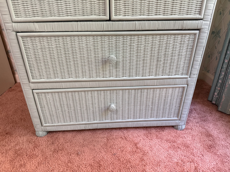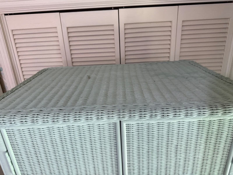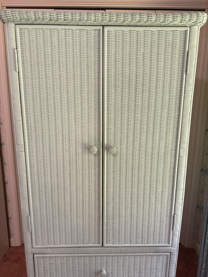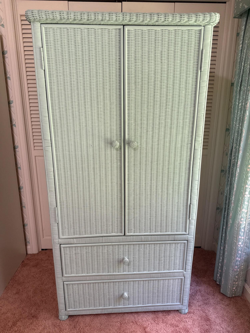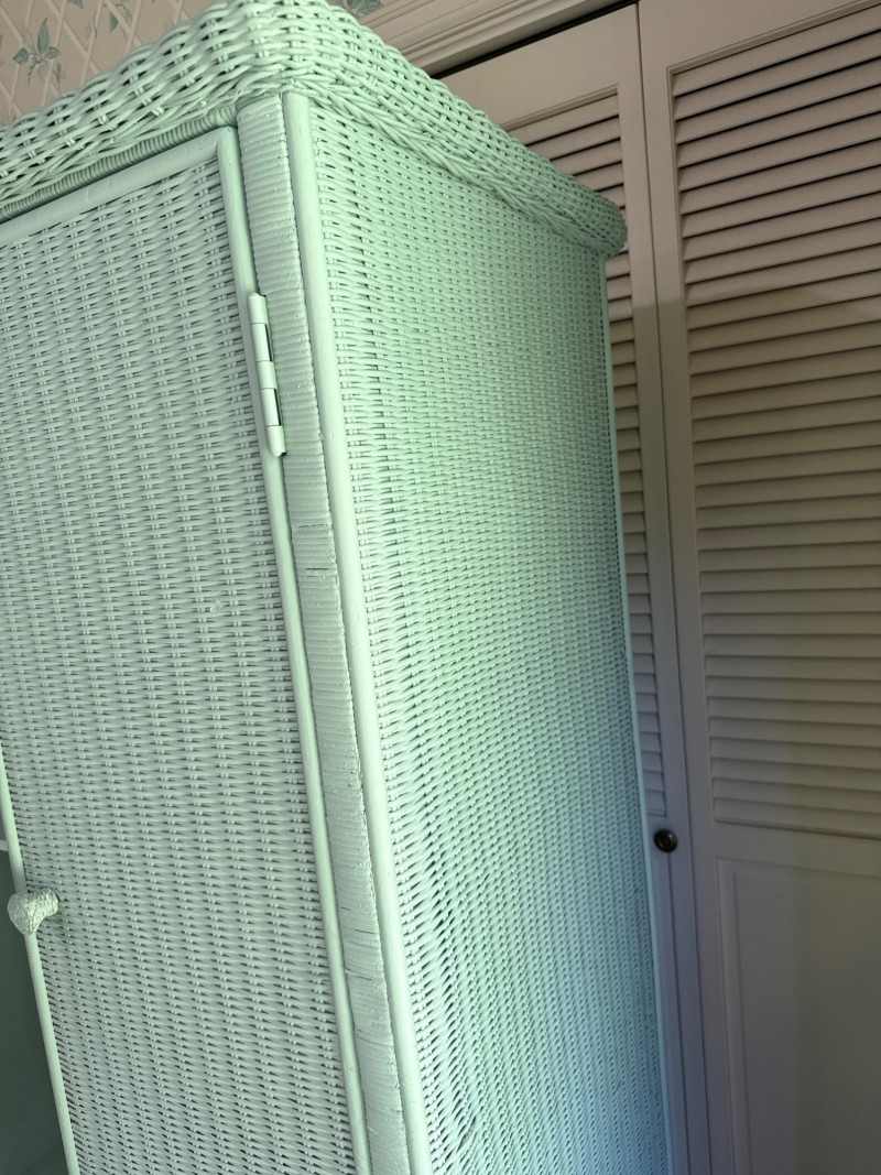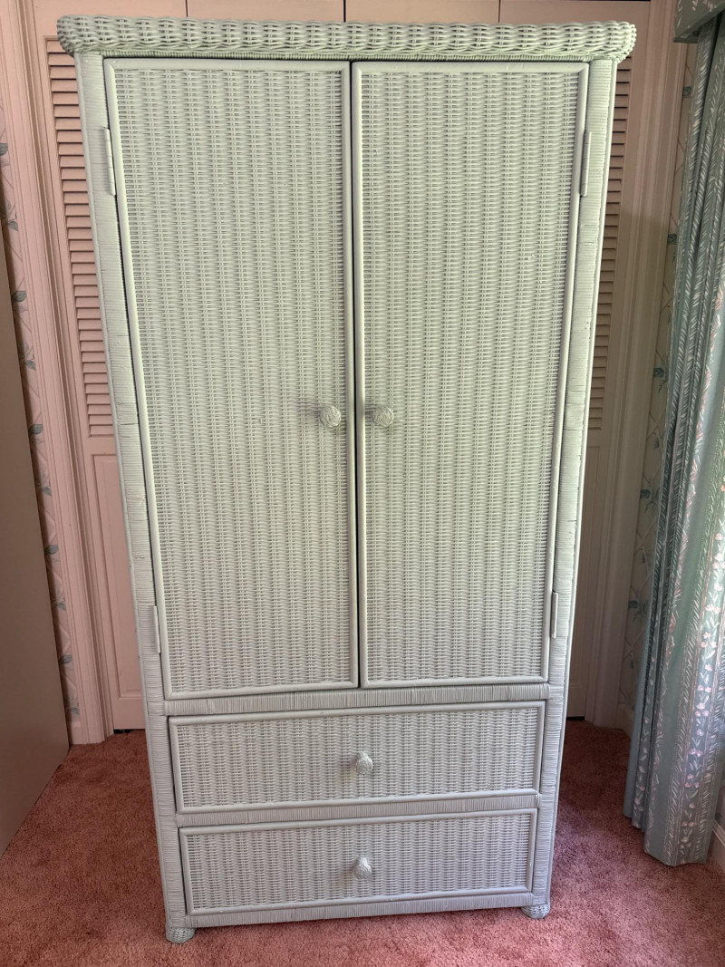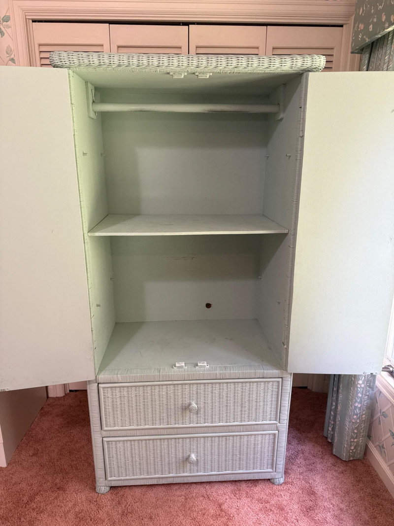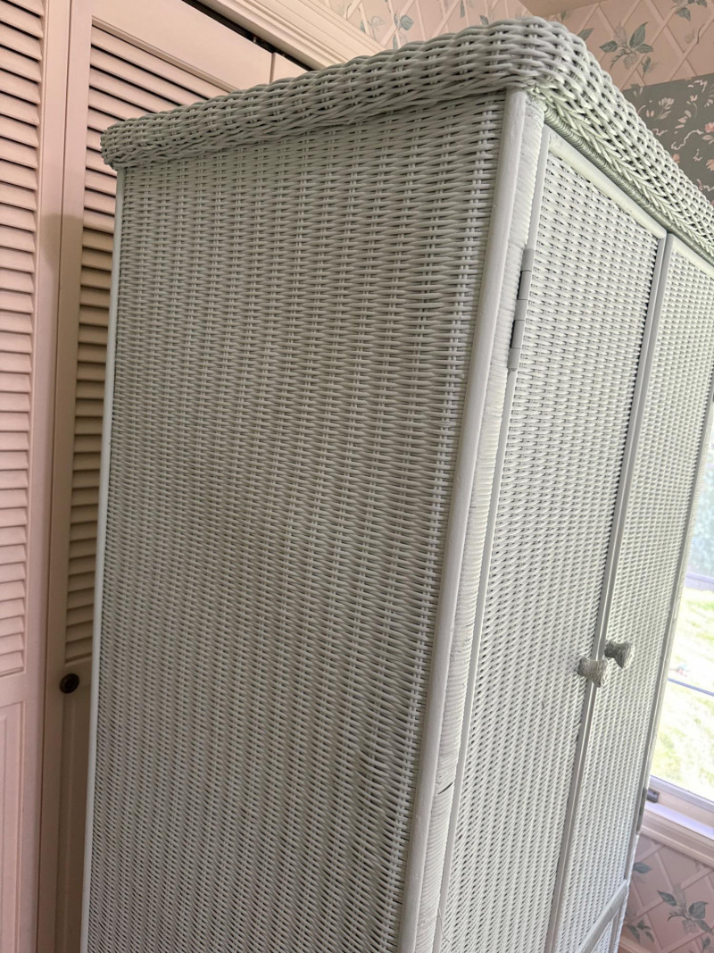Perfect as a clothing wardrobe, linen armoire, or general storage cabinet. Its neutral painted wicker finish complements a variety of interiors—from breezy coastal to cozy cottage or vintage farmhouse.Vintage Mint Green Wicker Armoire with Drawers