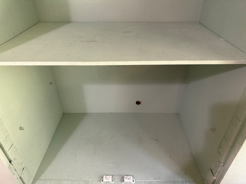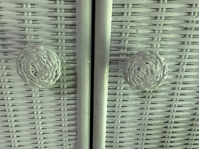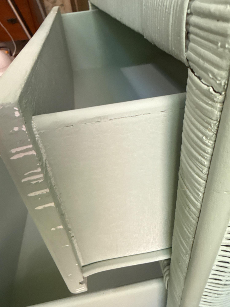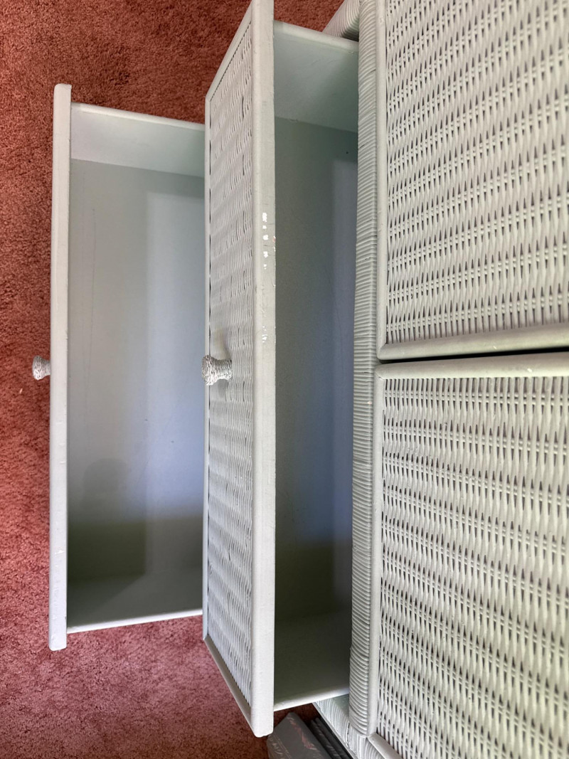 Painted wicker/rattan over a sturdy wood frame in a soft mint green finish. Coastal, cottage, and vintage-inspired charm. Key Features: Double doors with woven wicker fronts Interior hanging rod and single shelf for versatile storage Two lower drawers with matching wicker pulls stamped “MEITIAN (美恬)” Painted wood interior Usage Notes: