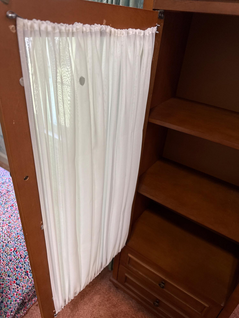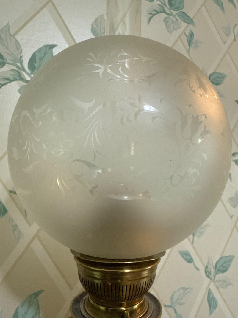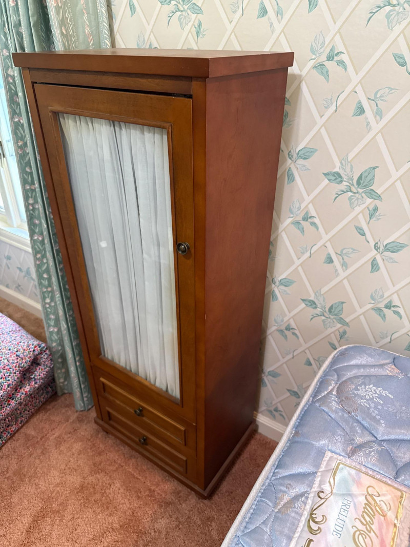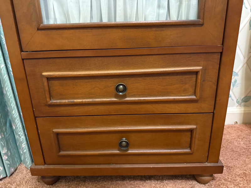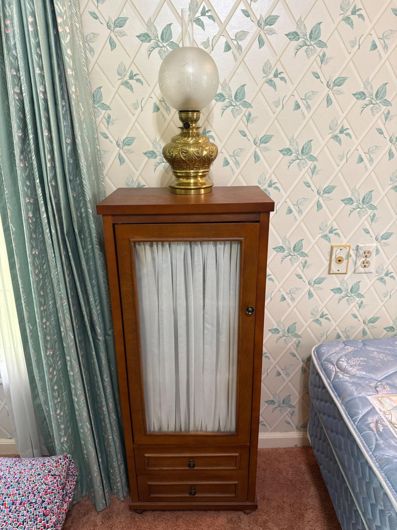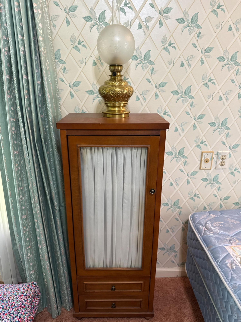 A charming vintage bedroom vignette featuring a pleated-curtain wood cabinet and a brass gas-style lamp with frosted glass globe. The cabinet includes a glass door with inset white pleated fabric and two lower drawers, offering both display and storage. Atop sits a classic brass lamp with a round frosted shade—perfect for soft ambient lighting. Together, they evoke cozy cottage charm and timeless utility. Cabinet: Material: Wood with glass door and pleated fabric backing Features: Two drawers, vintage hardware Dimensions: 46" H × 18.5" L × 12" W Lamp: Material: Brass base with frosted glass globe Style: Gas-style vintage reproduction Dimensions: 18.5" H × 6.5" W Item Details