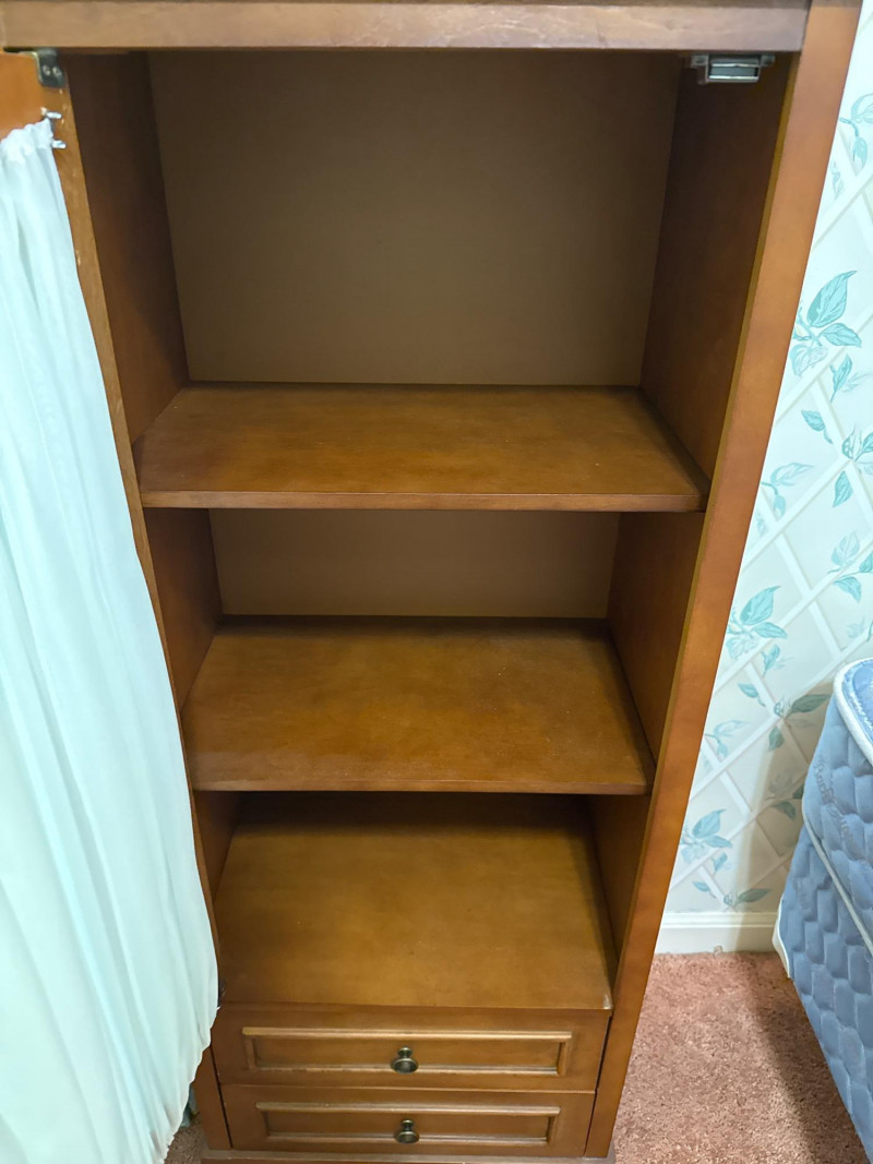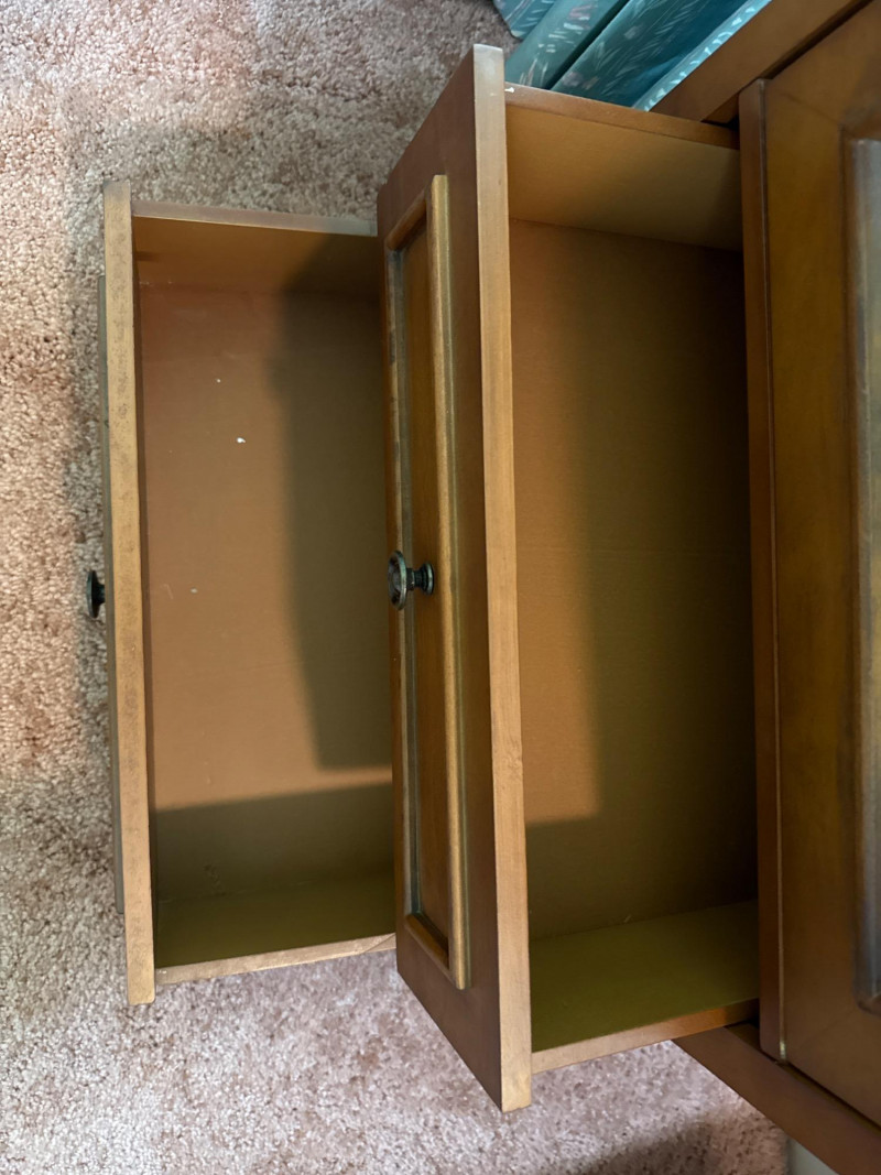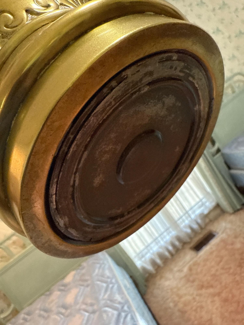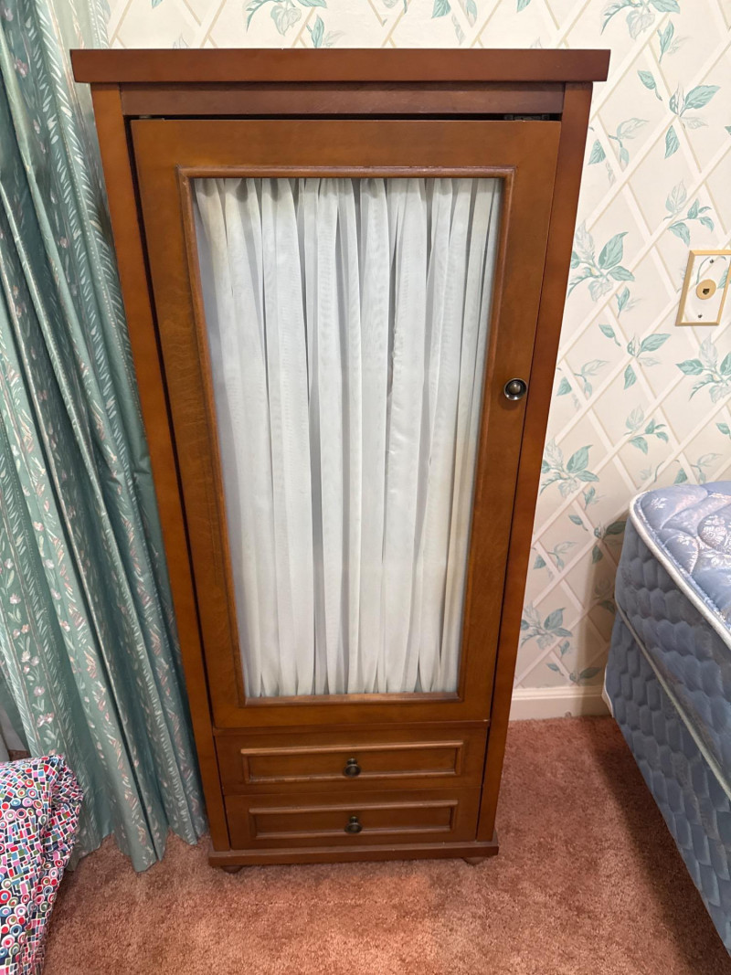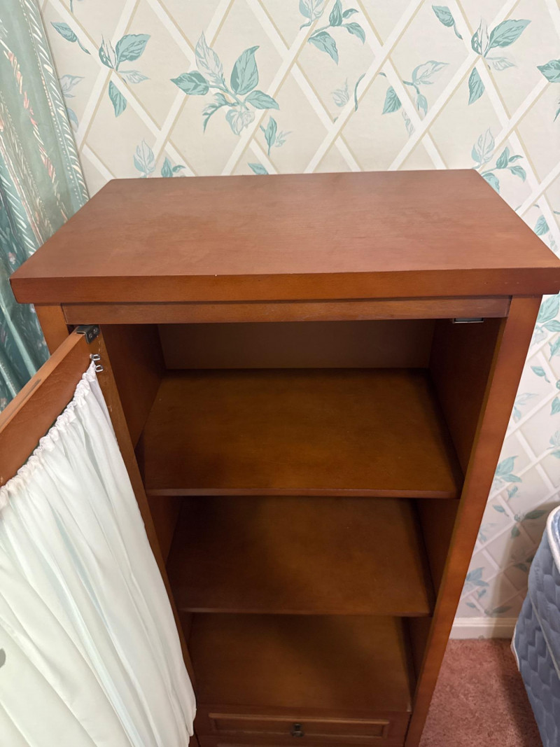 A charming vintage bedroom vignette featuring a pleated-curtain wood cabinet and a brass gas-style lamp with frosted glass globe. The cabinet includes a glass door with inset white pleated fabric and two lower drawers, offering both display and storage. Atop sits a classic brass lamp with a round frosted shade—perfect for soft ambient lighting. Together, they evoke cozy cottage charm and timeless utility. Cabinet: Material: Wood with glass door and pleated fabric backing Features: Two drawers, vintage hardware Dimensions: 46" H × 18.5" L × 12" W Lamp: Material: Brass base with frosted glass globe Style: Gas-style vintage reproduction Dimensions: 18.5" H × 6.5" W Item Details