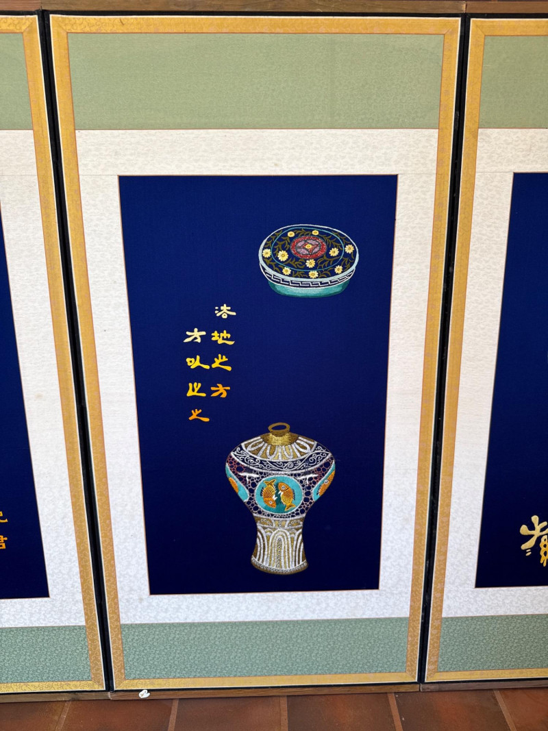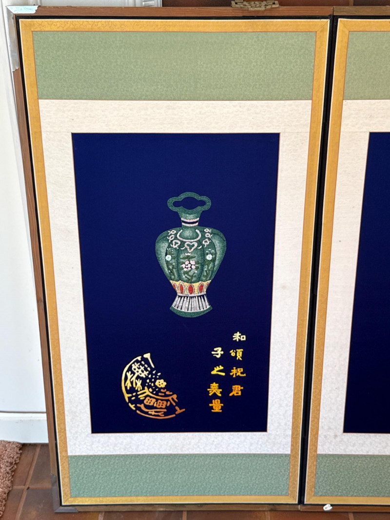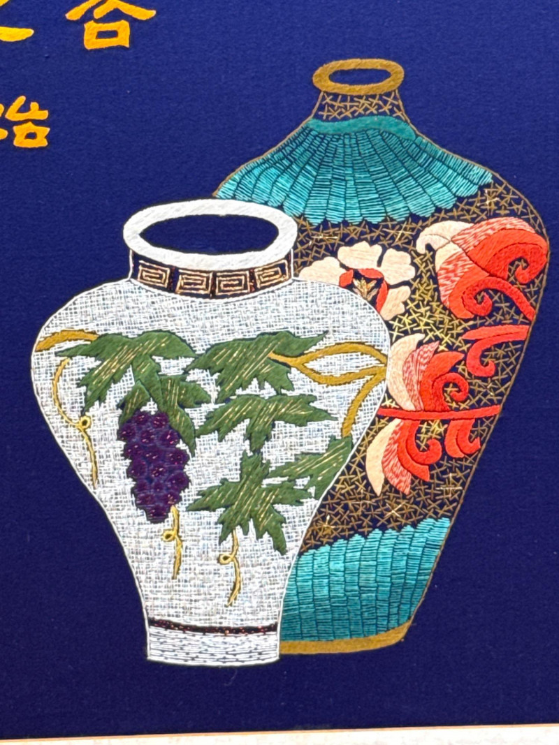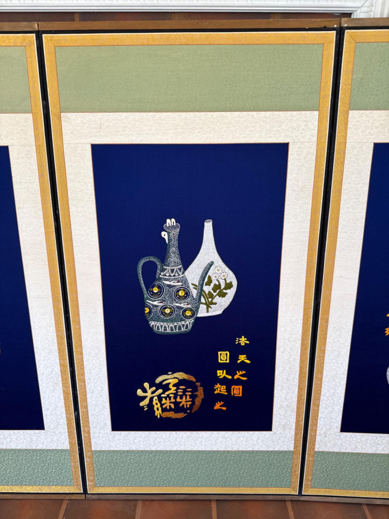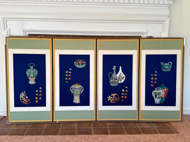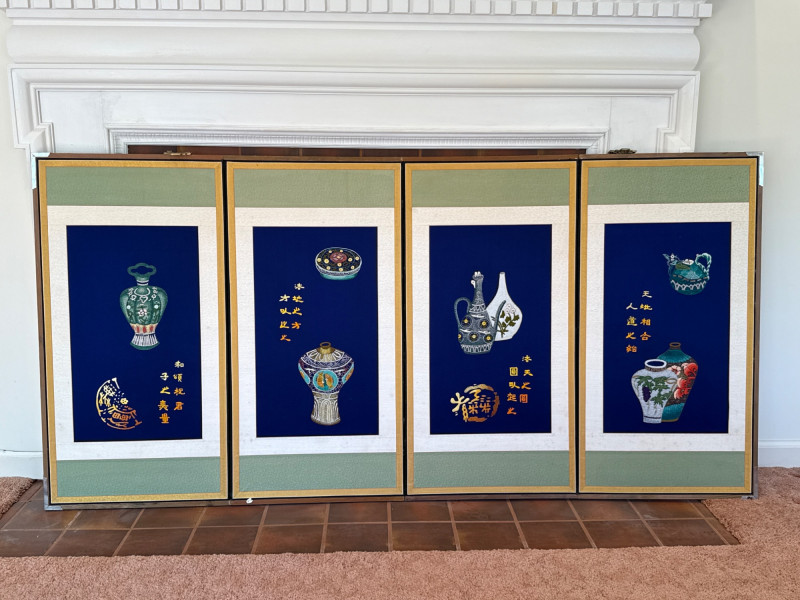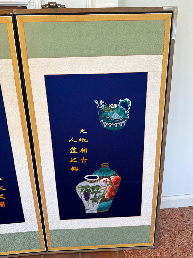 A four-panel folding screen showcasing exquisite silk embroidery on a deep blue ground, each panel adorned with two finely rendered porcelain vessel motifs. These include celadon, cloisonné-style, and famille rose forms—each paired with vertical gold-thread Chinese calligraphy that enhances the screen’s elegance and cultural depth. Materials: Silk embroidery on fabric-covered panels Hardware: Brass hinges with geometric designs Reverse: Patterned decorative paper backing Collecting Note: Cream and green fabric borders with gilt edges frame the embroidered scenes, reflecting the precision and vivid coloration of Suzhou embroidery (苏绣)—a celebrated textile art revived during the mid-20th century. These screens were popular both domestically and for export, blending reverence for China’s ceramic heritage with the artistry of traditional needlework. Perfect as a statement piece in a study, living room, or gallery, this screen offers both aesthetic beauty and historical resonance.Vintage Chinese Four-Panel Embroidered Folding Screen