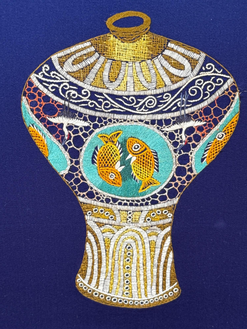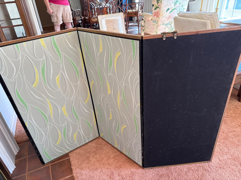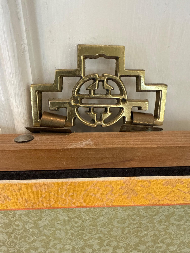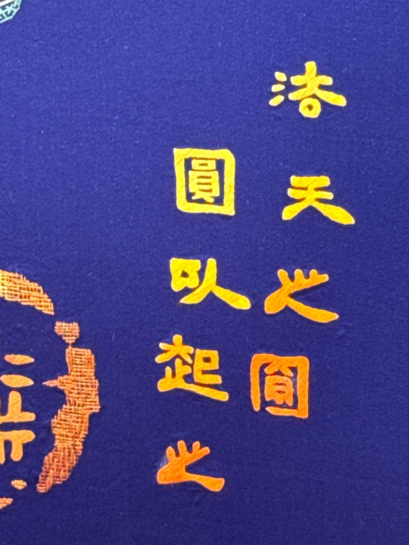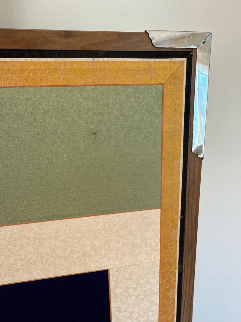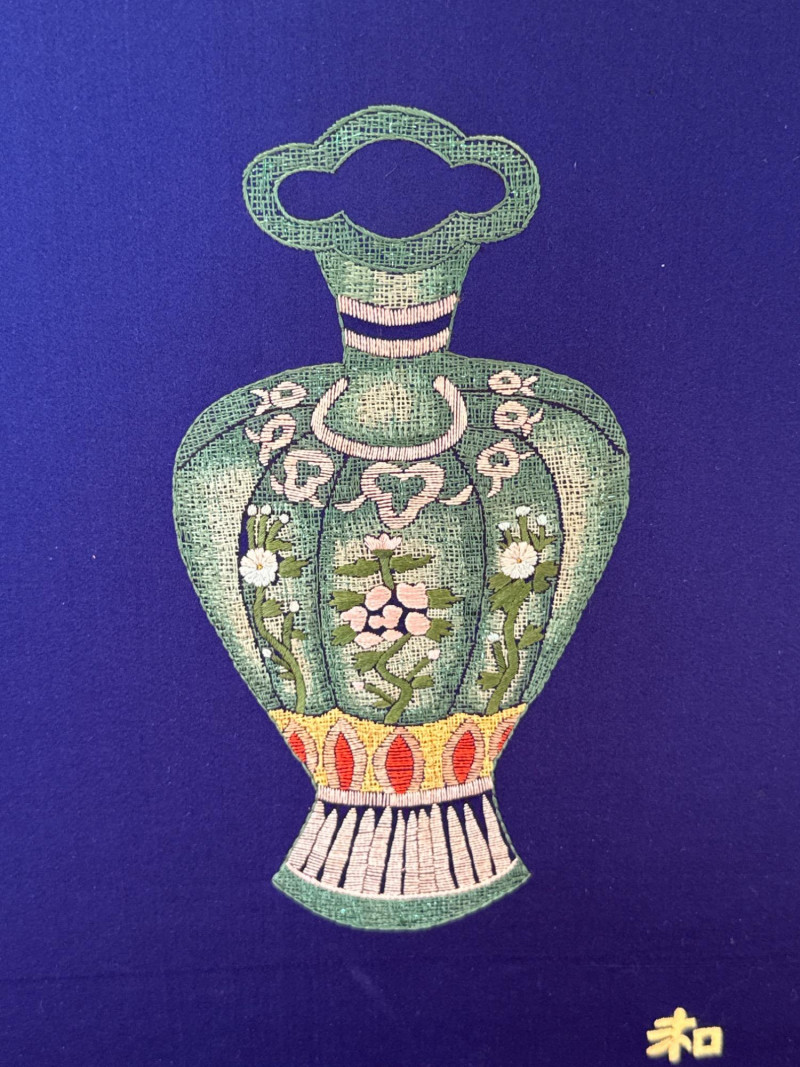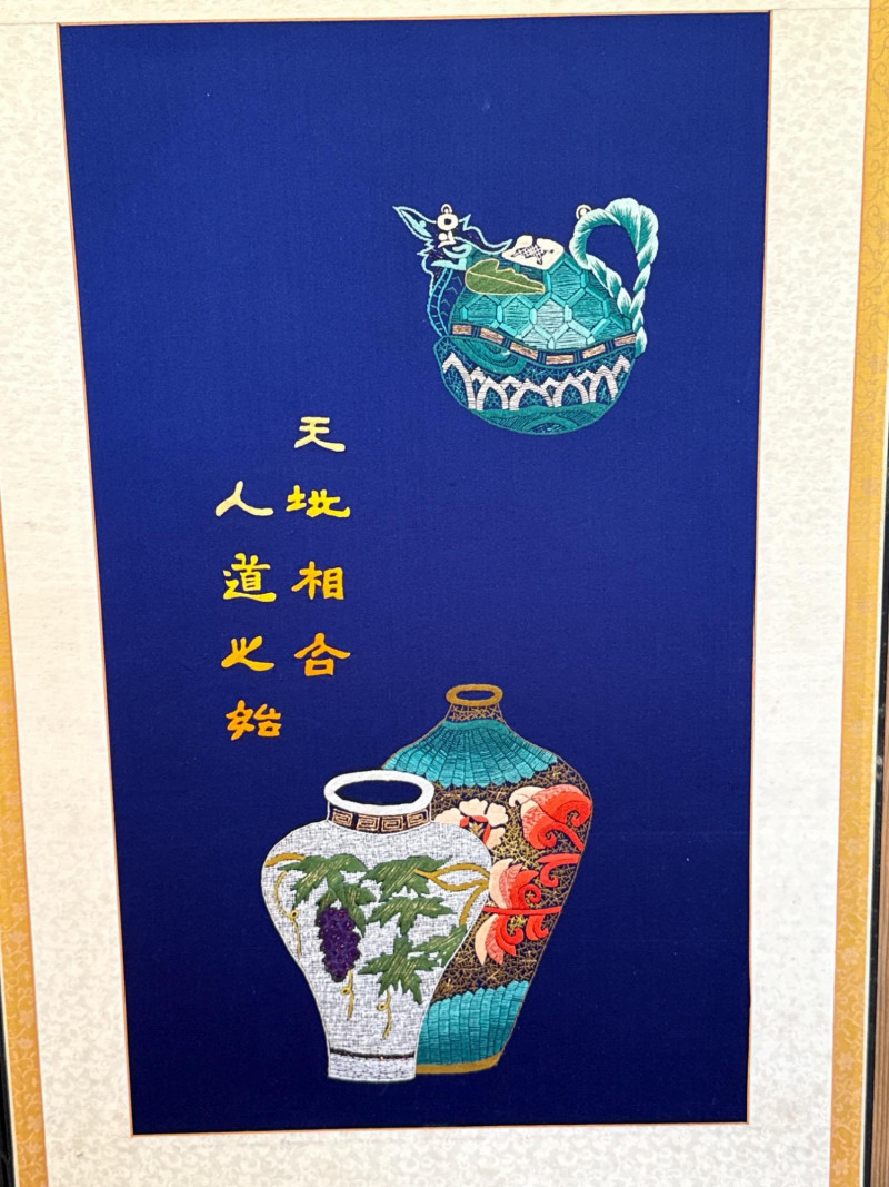 A four-panel folding screen showcasing exquisite silk embroidery on a deep blue ground, each panel adorned with two finely rendered porcelain vessel motifs. These include celadon, cloisonné-style, and famille rose forms—each paired with vertical gold-thread Chinese calligraphy that enhances the screen’s elegance and cultural depth. Materials: Silk embroidery on fabric-covered panels Hardware: Brass hinges with geometric designs Reverse: Patterned decorative paper backing Collecting Note: Cream and green fabric borders with gilt edges frame the embroidered scenes, reflecting the precision and vivid coloration of Suzhou embroidery (苏绣)—a celebrated textile art revived during the mid-20th century. These screens were popular both domestically and for export, blending reverence for China’s ceramic heritage with the artistry of traditional needlework. Perfect as a statement piece in a study, living room, or gallery, this screen offers both aesthetic beauty and historical resonance.Vintage Chinese Four-Panel Embroidered Folding Screen