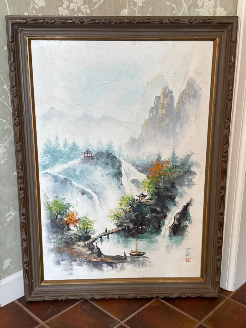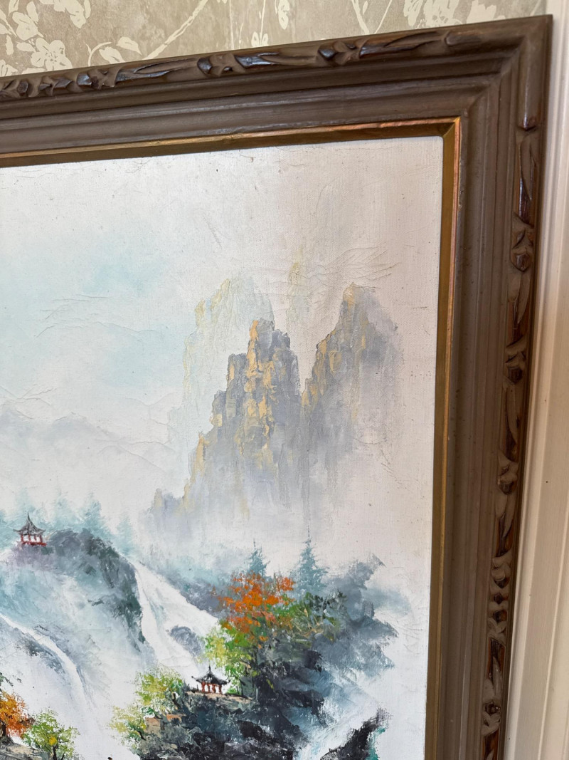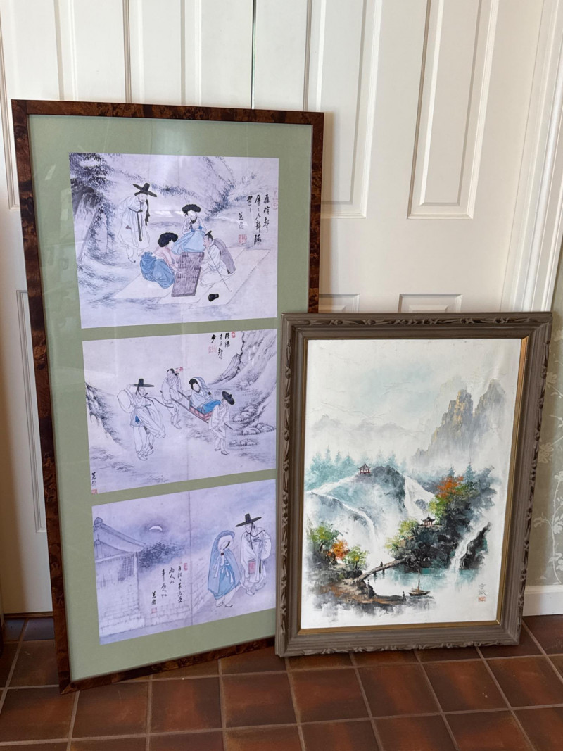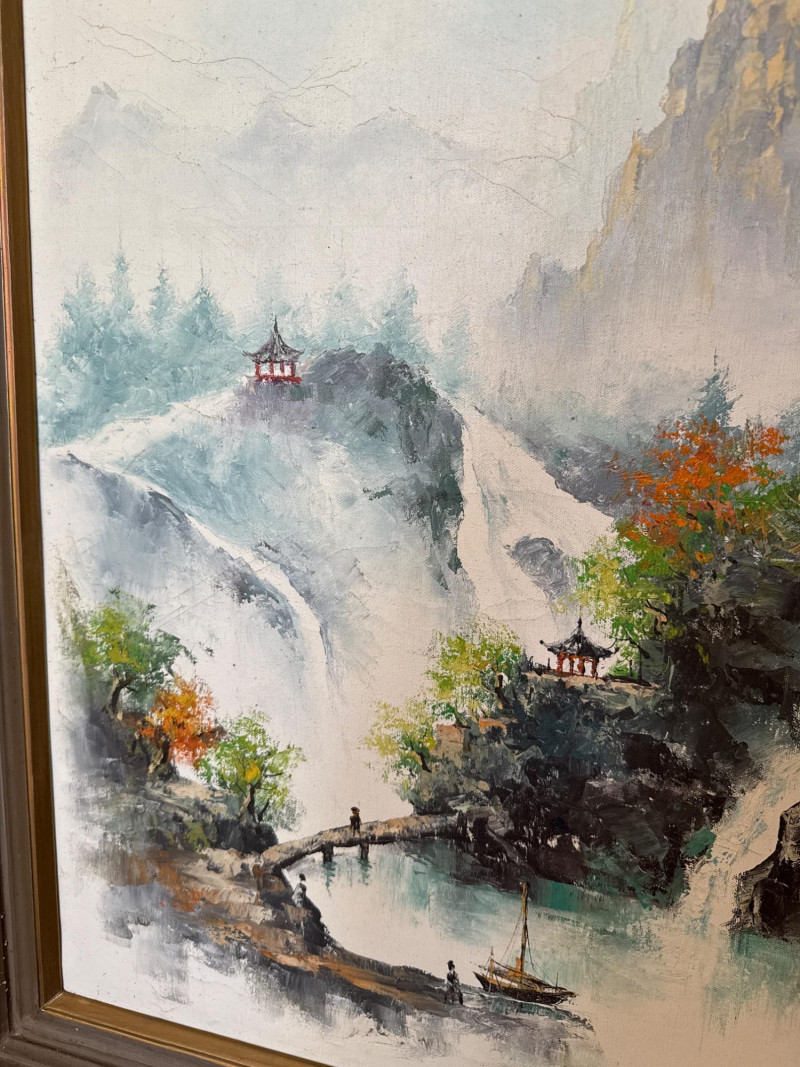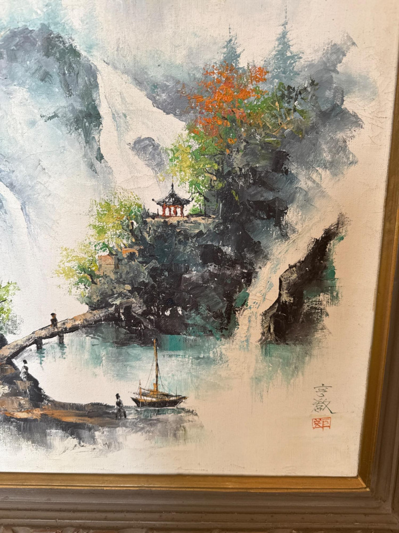 A striking pair of framed Asian artworks, each offering a distinct visual narrative. One features a serene oil landscape with cascading waterfalls and autumnal trees, while the other presents a collage of four traditional scenes with figures in classical attire. Together, they celebrate cultural storytelling and painterly elegance. Oil Landscape Painting Dimensions: 33" H × 24" W Style: Traditional Asian mountain scene with waterfall, bridge, and temple Palette: Earth tones with vibrant foliage and misty depth Framing: Wood frame with glass front Four-Panel Cultural Collage Dimensions: 49" H × 24" W Style: Series of traditional Asian vignettes featuring figures in ceremonial dress, each with calligraphy inscriptions Medium: Mixed media prints or watercolors Framing: Coordinated wood frame with glass front Certificate of authenticity and provenance is not available. Sold as is. We make every effort to describe and research every item. If documentation is found, description will be updated. Set Includes