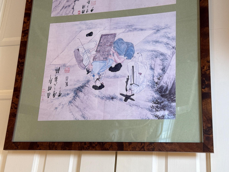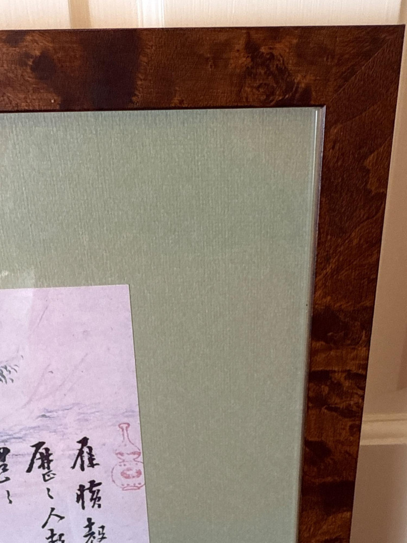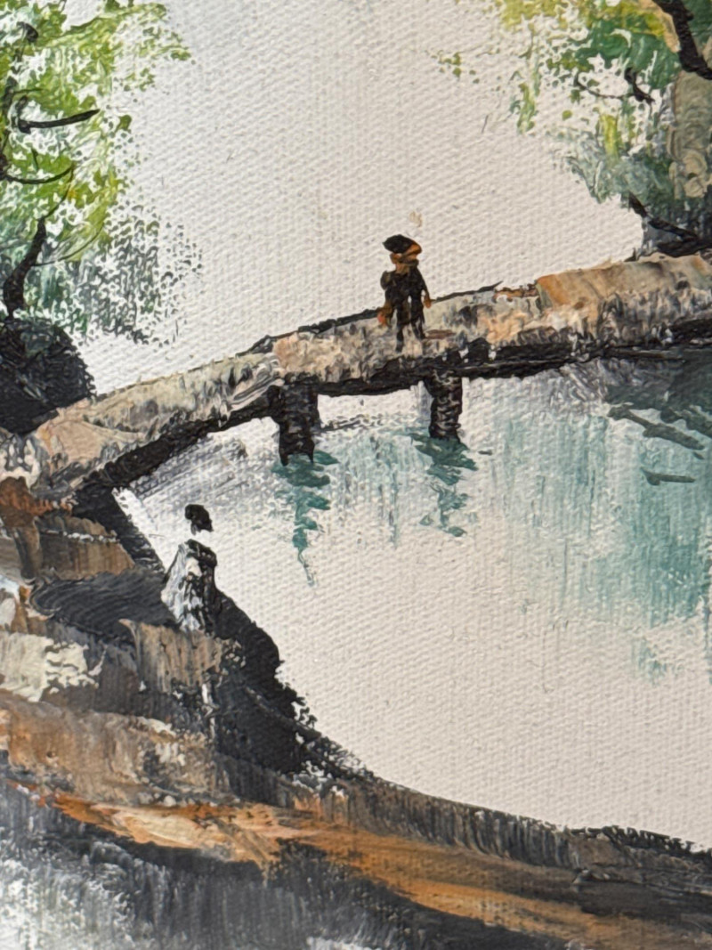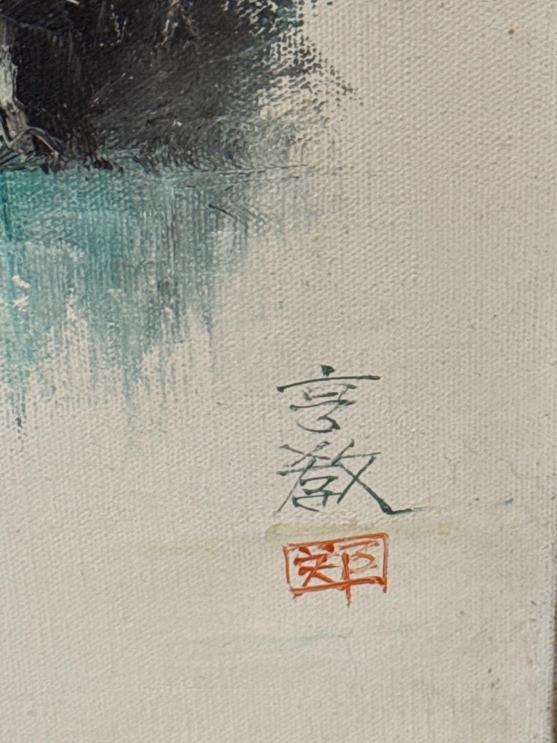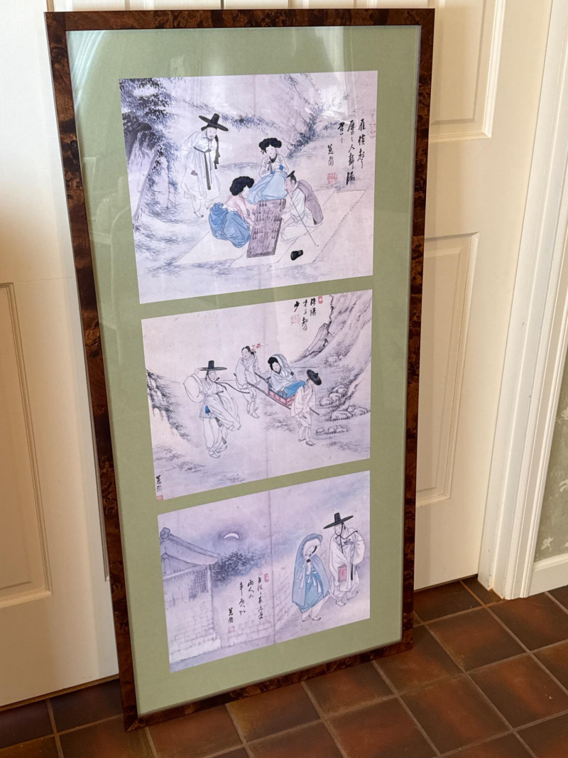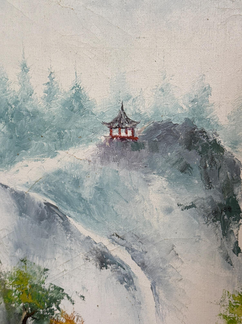 A striking pair of framed Asian artworks, each offering a distinct visual narrative. One features a serene oil landscape with cascading waterfalls and autumnal trees, while the other presents a collage of four traditional scenes with figures in classical attire. Together, they celebrate cultural storytelling and painterly elegance. Oil Landscape Painting Dimensions: 33" H × 24" W Style: Traditional Asian mountain scene with waterfall, bridge, and temple Palette: Earth tones with vibrant foliage and misty depth Framing: Wood frame with glass front Four-Panel Cultural Collage Dimensions: 49" H × 24" W Style: Series of traditional Asian vignettes featuring figures in ceremonial dress, each with calligraphy inscriptions Medium: Mixed media prints or watercolors Framing: Coordinated wood frame with glass front Certificate of authenticity and provenance is not available. Sold as is. We make every effort to describe and research every item. If documentation is found, description will be updated. Set Includes