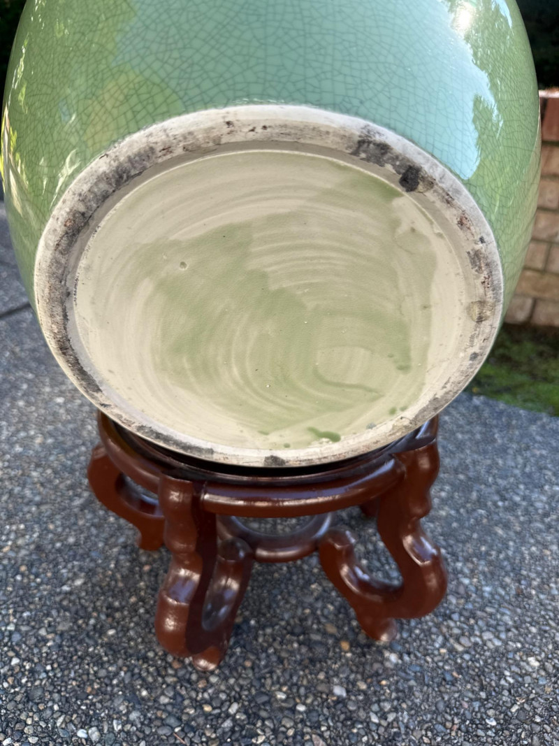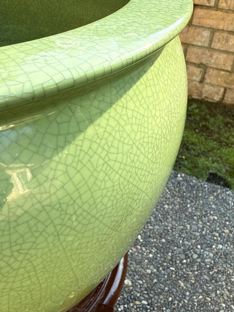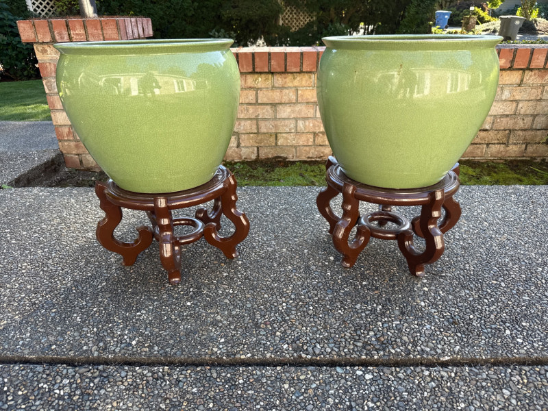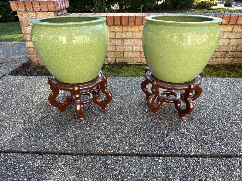 Lot # 146 - Celadon Crackled Indoor Planter Pair with Ornate Wood Stands
