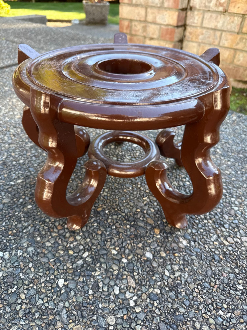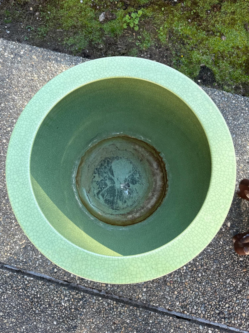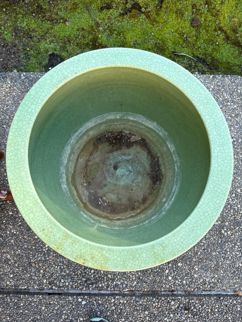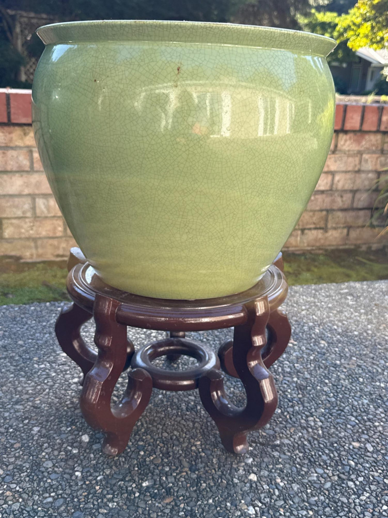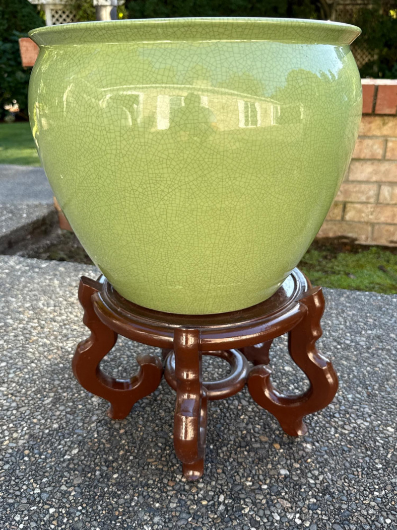 A graceful duo of celadon-glazed ceramic planters, each perched atop a carved wood stand. These matching vessels feature a soft green crackled finish and classic rounded form—perfect for elevating indoor greenery or adding sculptural charm to entryways, sunrooms, or curated corners. Planter Only: 13" H Overall with Stand: 21.5" H × 14.5" W Finish: Celadon glaze with crackled texture Form: Rounded body with wide opening and tapered base Stands: Ornate dark wood with curved legs and decorative apron Dimensions