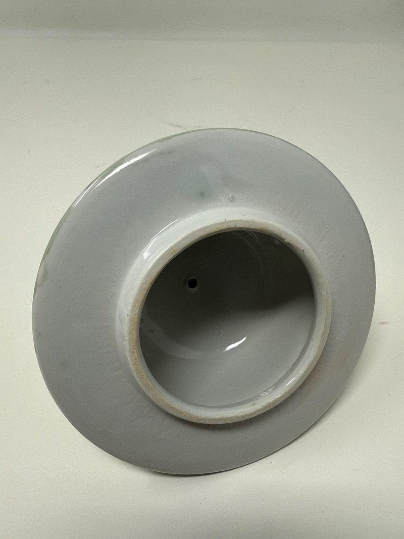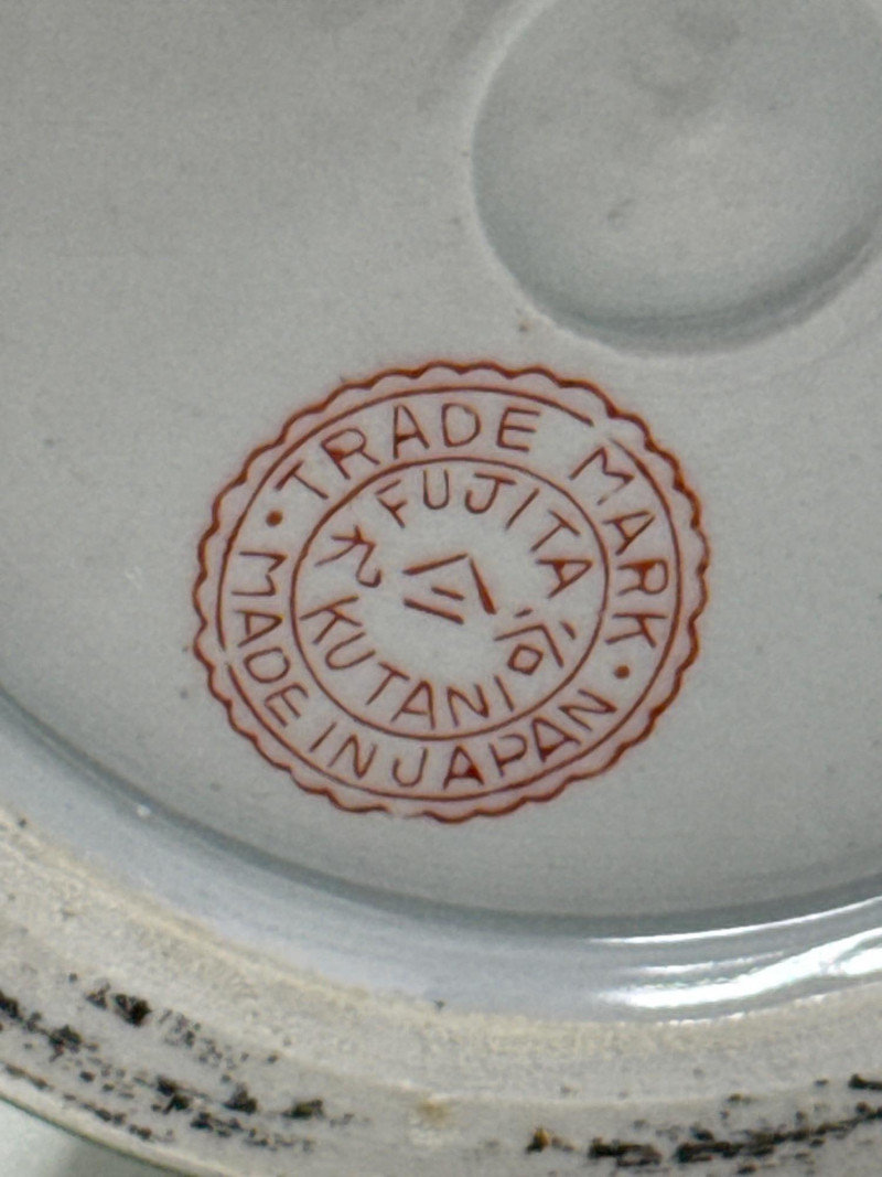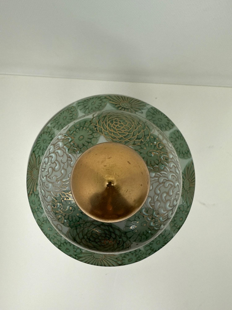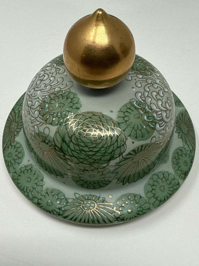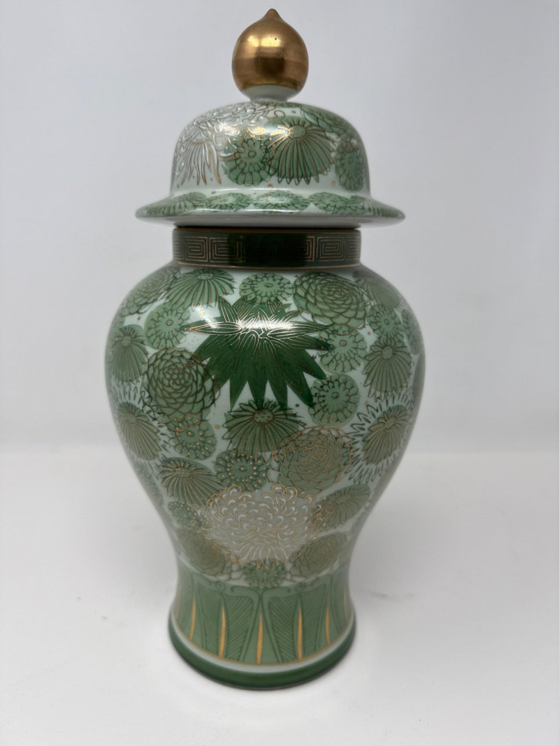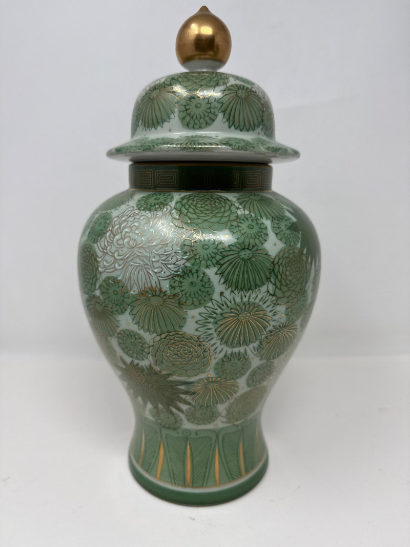 A striking pair of vintage ginger jars from Fujita Kutani, each adorned with hand-painted chrysanthemum blossoms in green and white with rich gold detailing. These lidded ceramic vessels feature traditional forms and elegant finials—perfect for collectors of Japanese porcelain or decorators seeking symmetrical statement pieces. 2 Ginger Jars Dimensions: 6" W × 12.5" H (each) Design: Wide-bodied form tapering to narrow neck Lids: Removable with gold finials Origin: Fujita Kutani, Japan Palette: Green and white floral with gold accents Motif: Chrysanthemum blossoms and leafwork Finish: Gloss glaze with hand-painted detailing Style: Traditional Japanese export porcelain Set Includes