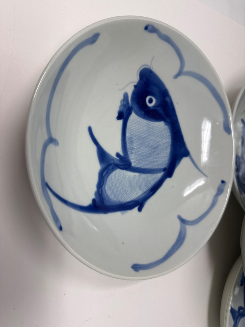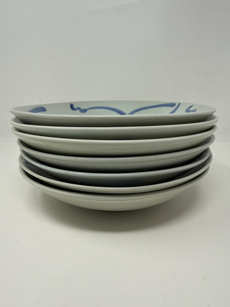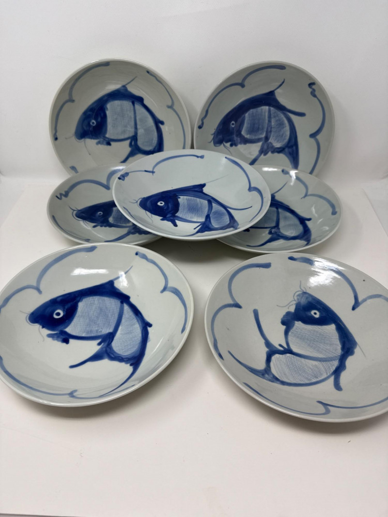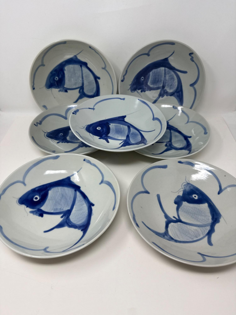 A graceful set of seven hand-painted porcelain bowls featuring stylized koi and carp designs in bold blue brushwork. Each bowl showcases a unique fish orientation framed by cloud-like borders, blending traditional Chinese artistry with fluid motion and symbolic meaning. 7 Matching Bowls Dimensions: 9" W × 2" H (each) Design: Blue koi and carp motifs with cloud border Finish: Gloss glaze with hand-painted detailing Origin: Chinese export porcelain Technique: Hand-painted underglaze blue Motif: Koi and carp – symbols of prosperity, perseverance, and good fortune Style: Traditional with expressive brushwork and organic flowSet Includes