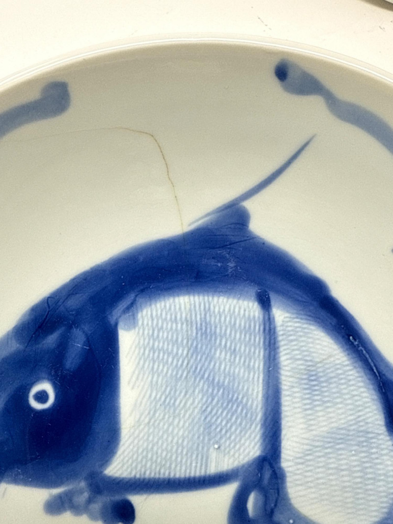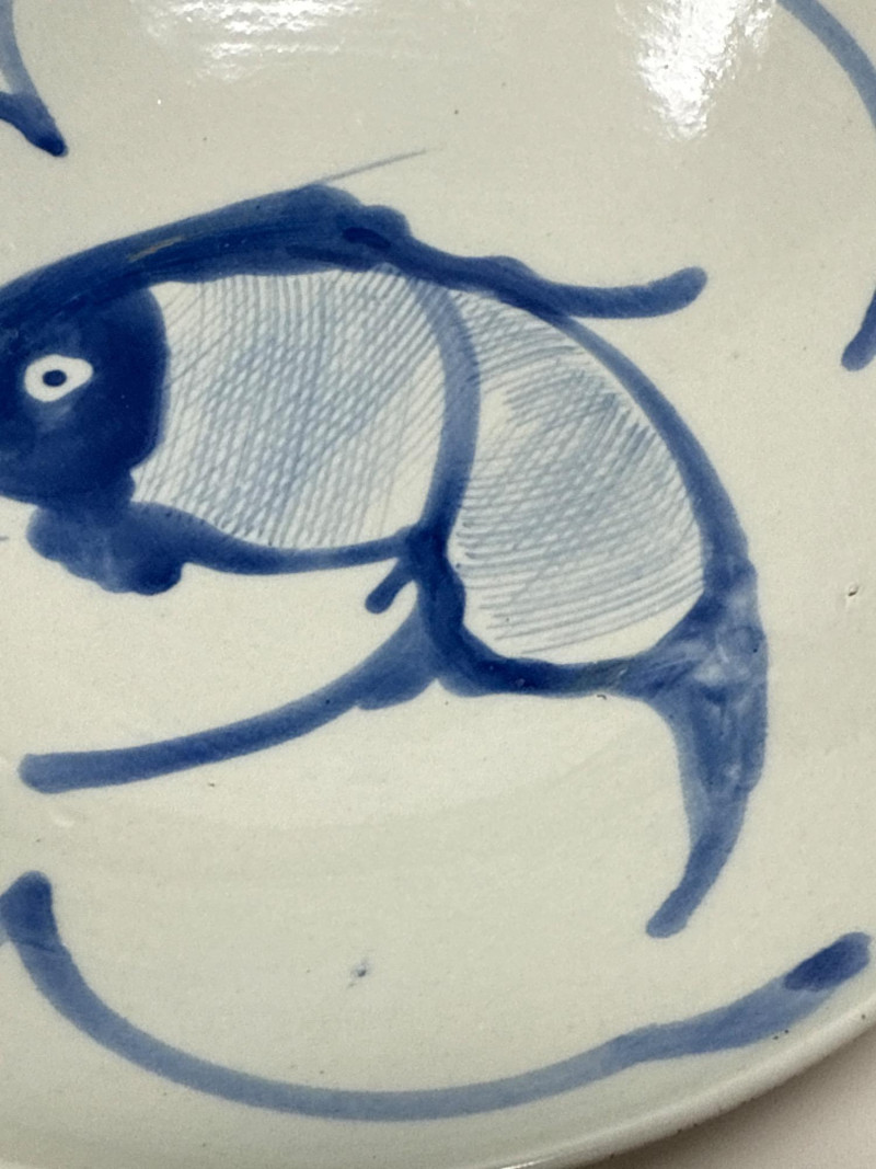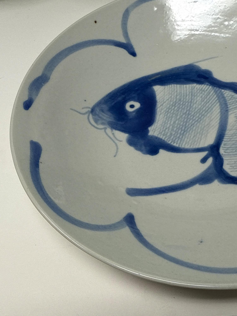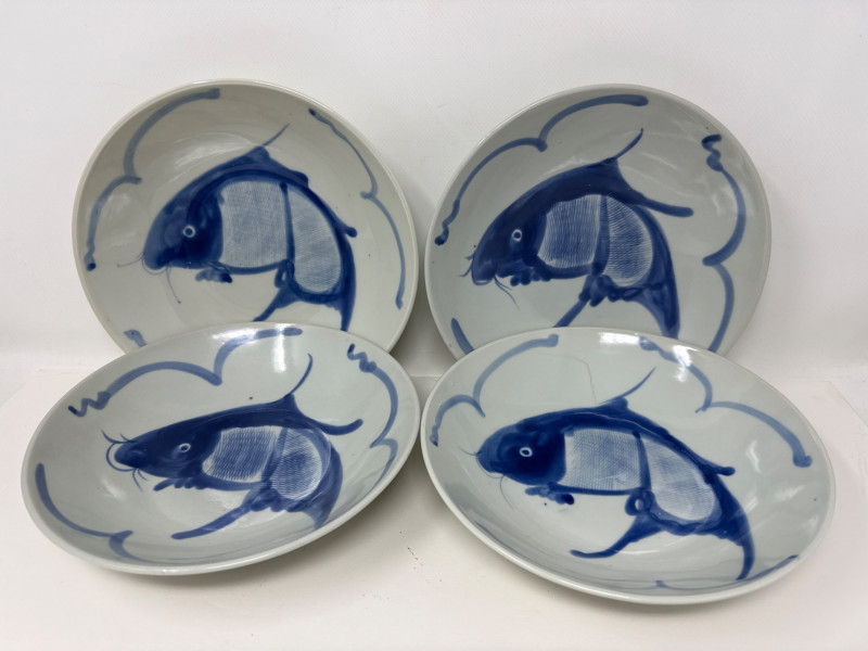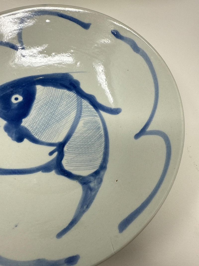 A graceful set of seven hand-painted porcelain bowls featuring stylized koi and carp designs in bold blue brushwork. Each bowl showcases a unique fish orientation framed by cloud-like borders, blending traditional Chinese artistry with fluid motion and symbolic meaning. 7 Matching Bowls Dimensions: 9" W × 2" H (each) Design: Blue koi and carp motifs with cloud border Finish: Gloss glaze with hand-painted detailing Origin: Chinese export porcelain Technique: Hand-painted underglaze blue Motif: Koi and carp – symbols of prosperity, perseverance, and good fortune Style: Traditional with expressive brushwork and organic flowSet Includes