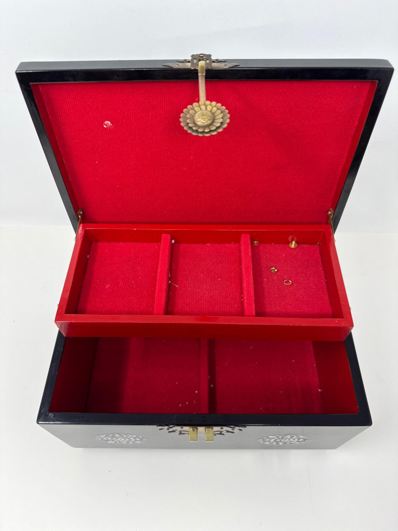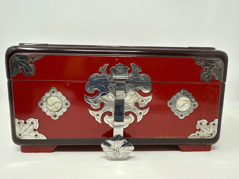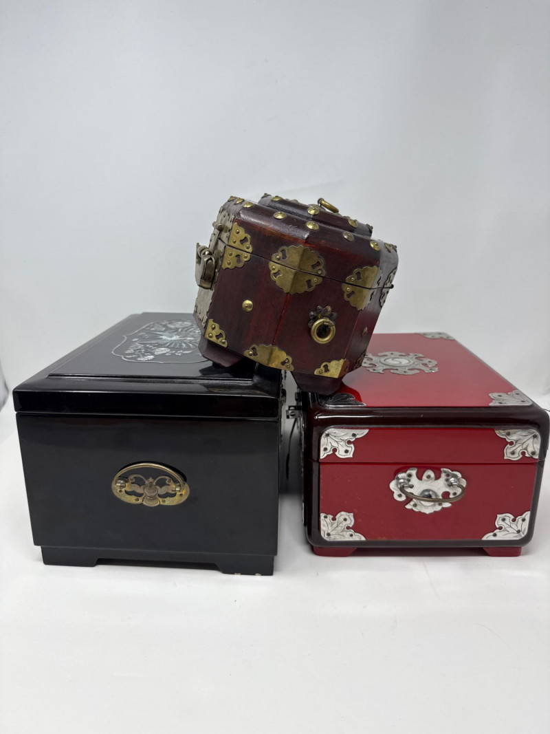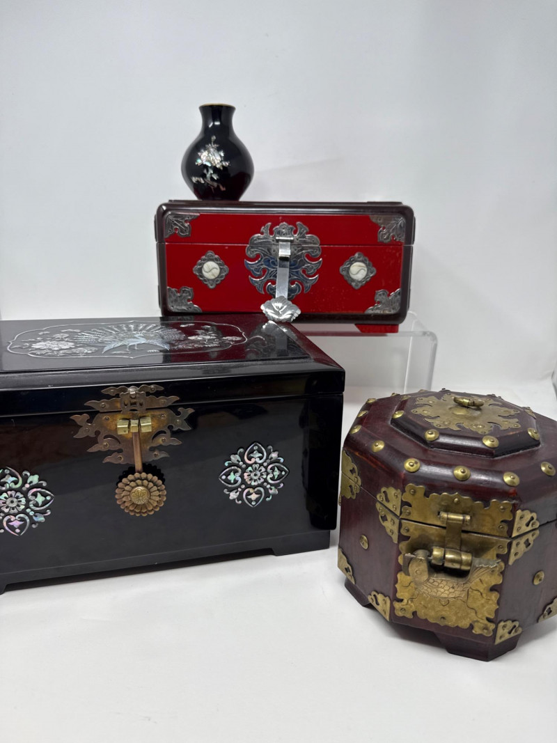 A richly varied quartet of decorative pieces showcasing global craftsmanship and ornate finishes. This lot includes three distinctive jewelry and treasure boxes—each with unique materials and motifs—plus a petite bud vase with mother-of-pearl floral inlay. Ideal for collectors of decorative arts or stylists curating a tabletop with texture and intrigue. Mother-of-Pearl Inlay Box Dimensions: 10.75" L × 7.25" W × 5.75" H Finish: Gloss black lacquer with floral MOP inlay and brass latch Style: Korean export Red Lacquer Treasure Box Dimensions: 10" L × 7" W × 5" H Finish: Red lacquer with silver and brass embellishments Features: Ornate latch and corner detailing Wood & Brass Hexagonal Box Dimensions: 5.5" W × 5.5" H Finish: Dark wood with vintage brass fittings Style: Antique-inspired Bud Vase Dimensions: 3.5" H × 3" W Finish: Black with white floral mother-of-pearl inlay Displayed on clear riser Set Include