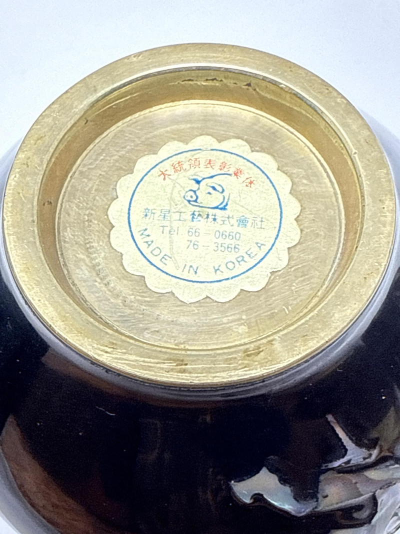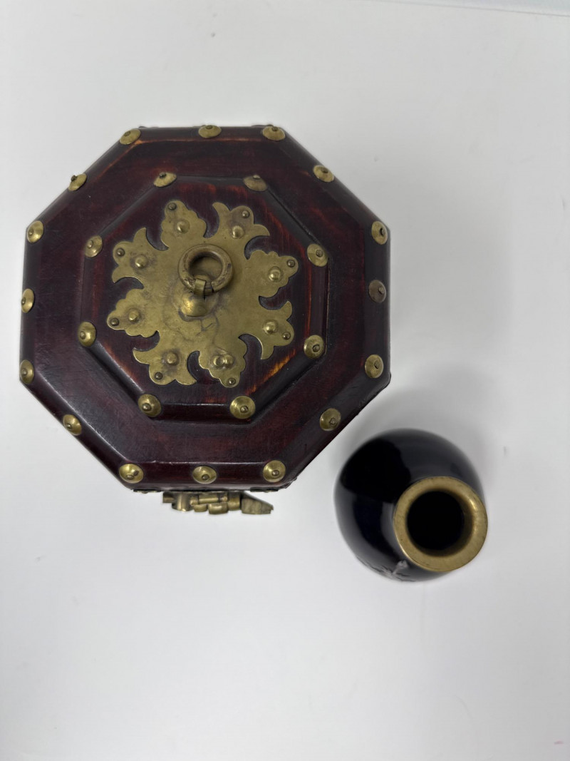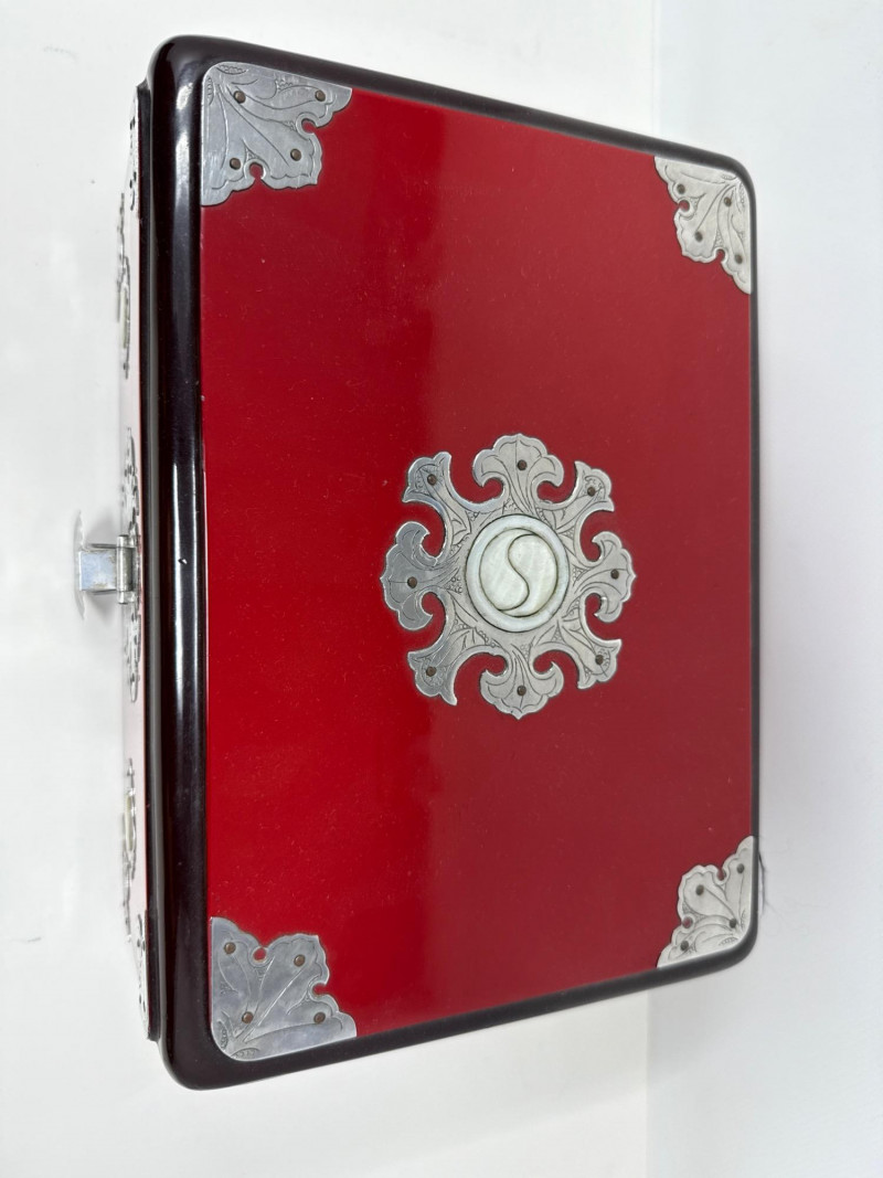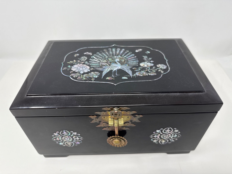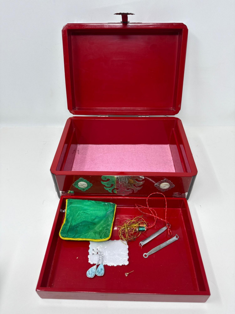 A richly varied quartet of decorative pieces showcasing global craftsmanship and ornate finishes. This lot includes three distinctive jewelry and treasure boxes—each with unique materials and motifs—plus a petite bud vase with mother-of-pearl floral inlay. Ideal for collectors of decorative arts or stylists curating a tabletop with texture and intrigue. Mother-of-Pearl Inlay Box Dimensions: 10.75" L × 7.25" W × 5.75" H Finish: Gloss black lacquer with floral MOP inlay and brass latch Style: Korean export Red Lacquer Treasure Box Dimensions: 10" L × 7" W × 5" H Finish: Red lacquer with silver and brass embellishments Features: Ornate latch and corner detailing Wood & Brass Hexagonal Box Dimensions: 5.5" W × 5.5" H Finish: Dark wood with vintage brass fittings Style: Antique-inspired Bud Vase Dimensions: 3.5" H × 3" W Finish: Black with white floral mother-of-pearl inlay Displayed on clear riser Set Include