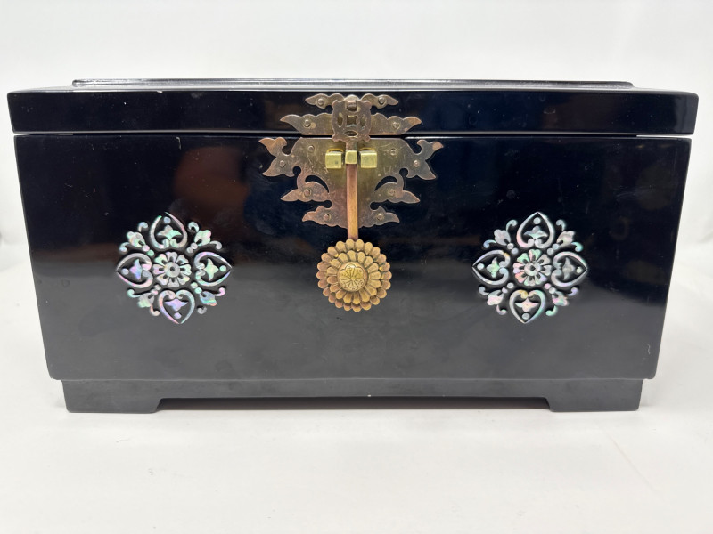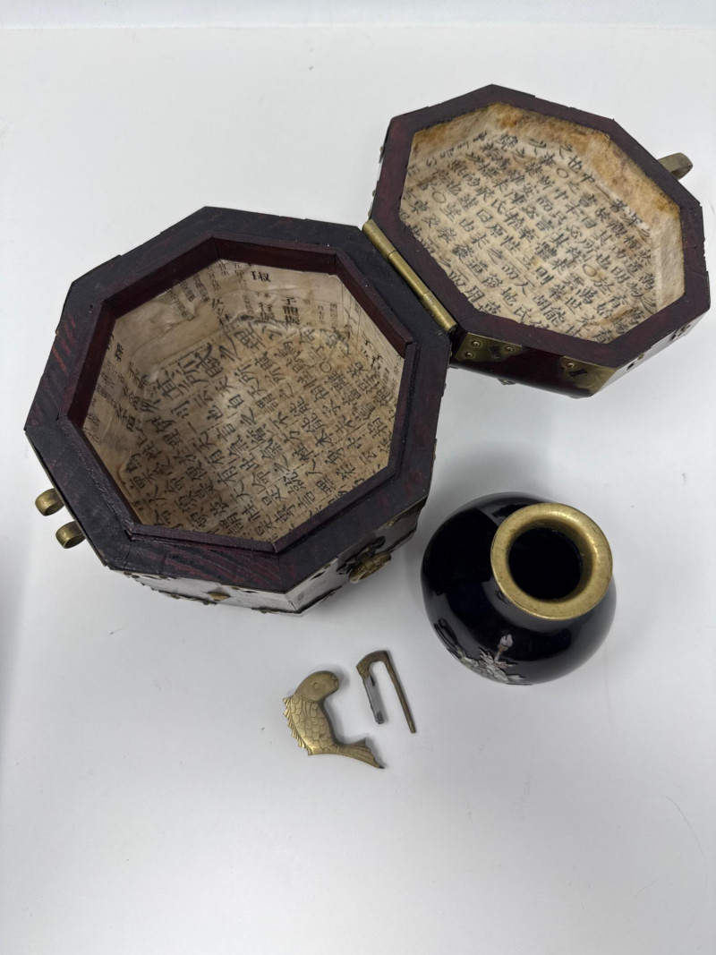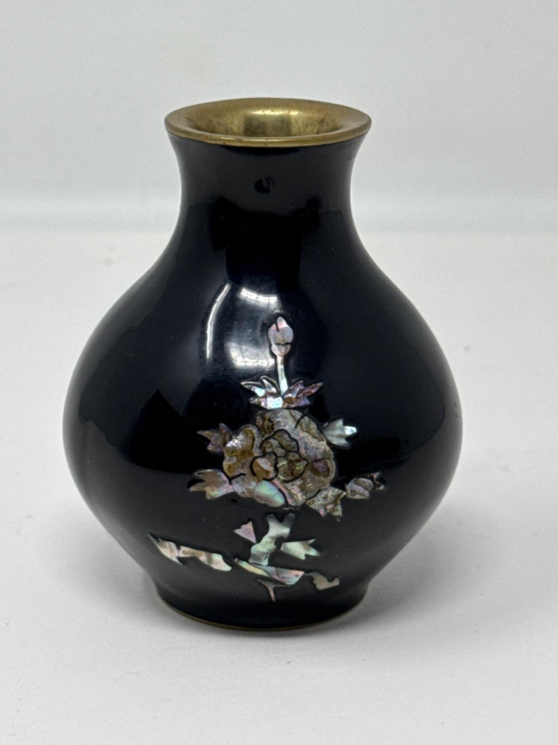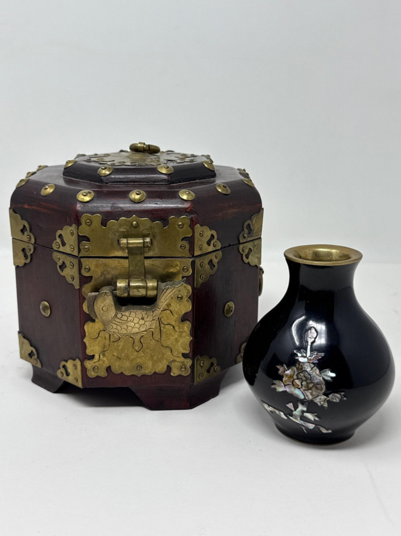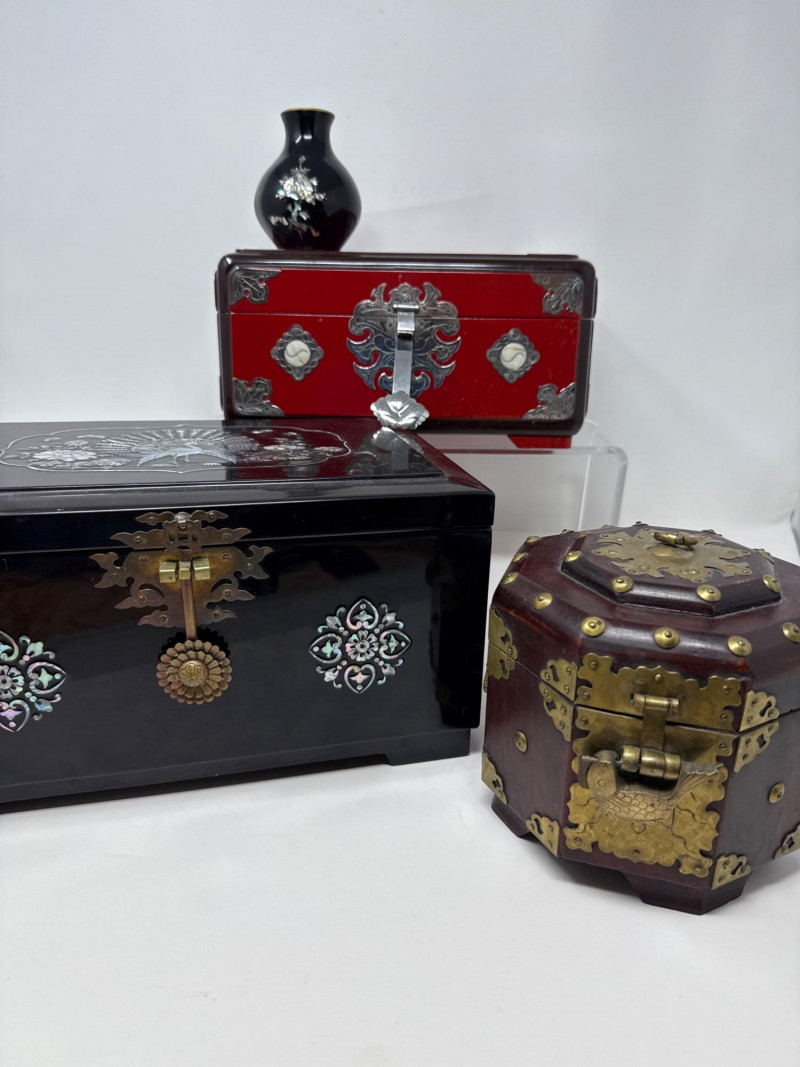 Lot # 169 - Asian-Inspired Lacquer & Brass Boxes with Inlaid Bud Vase