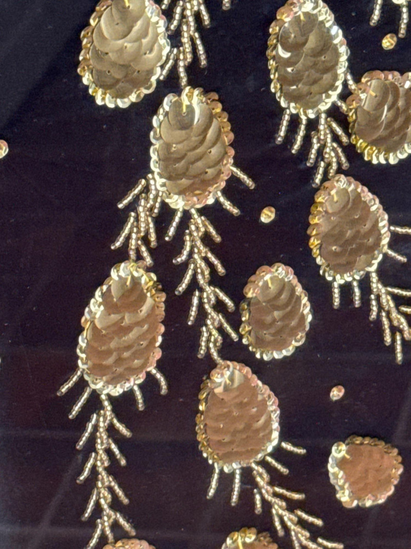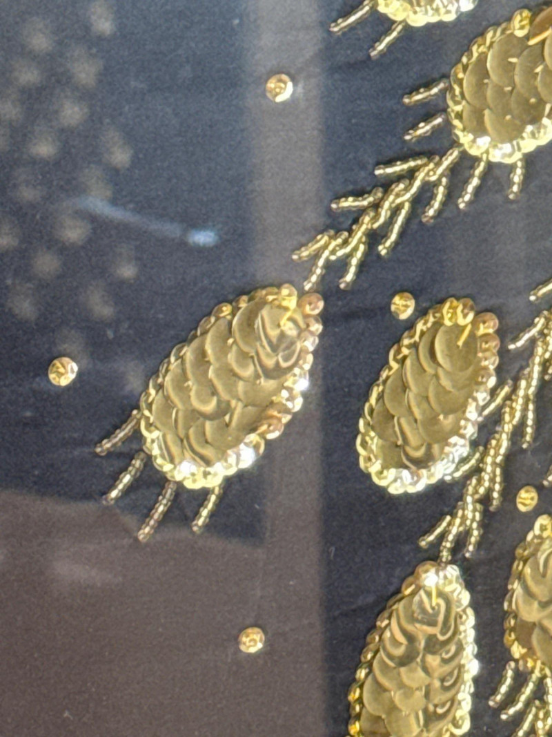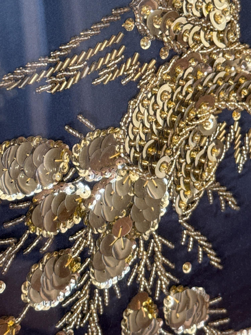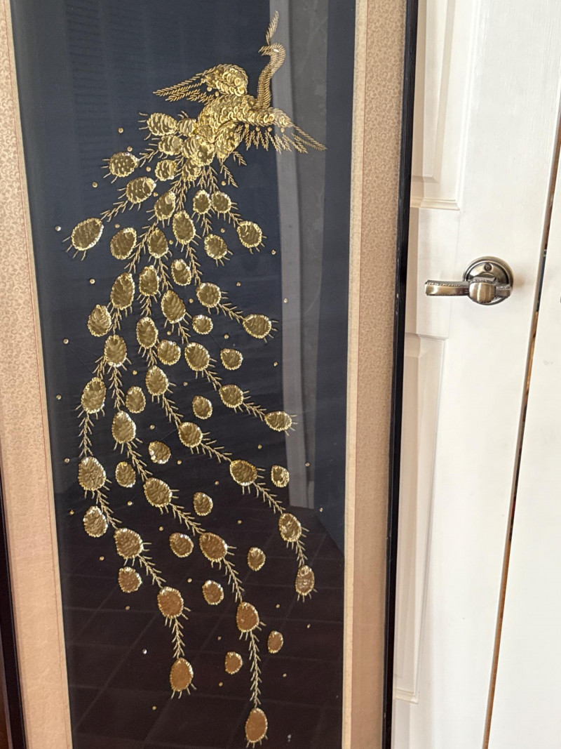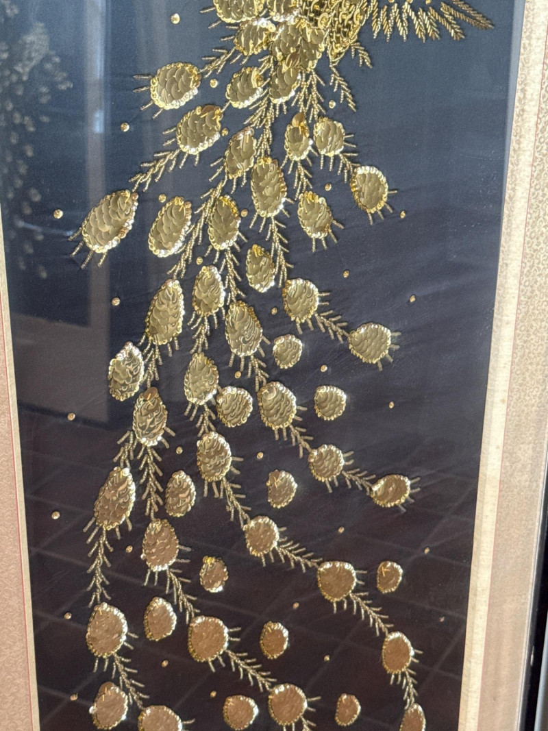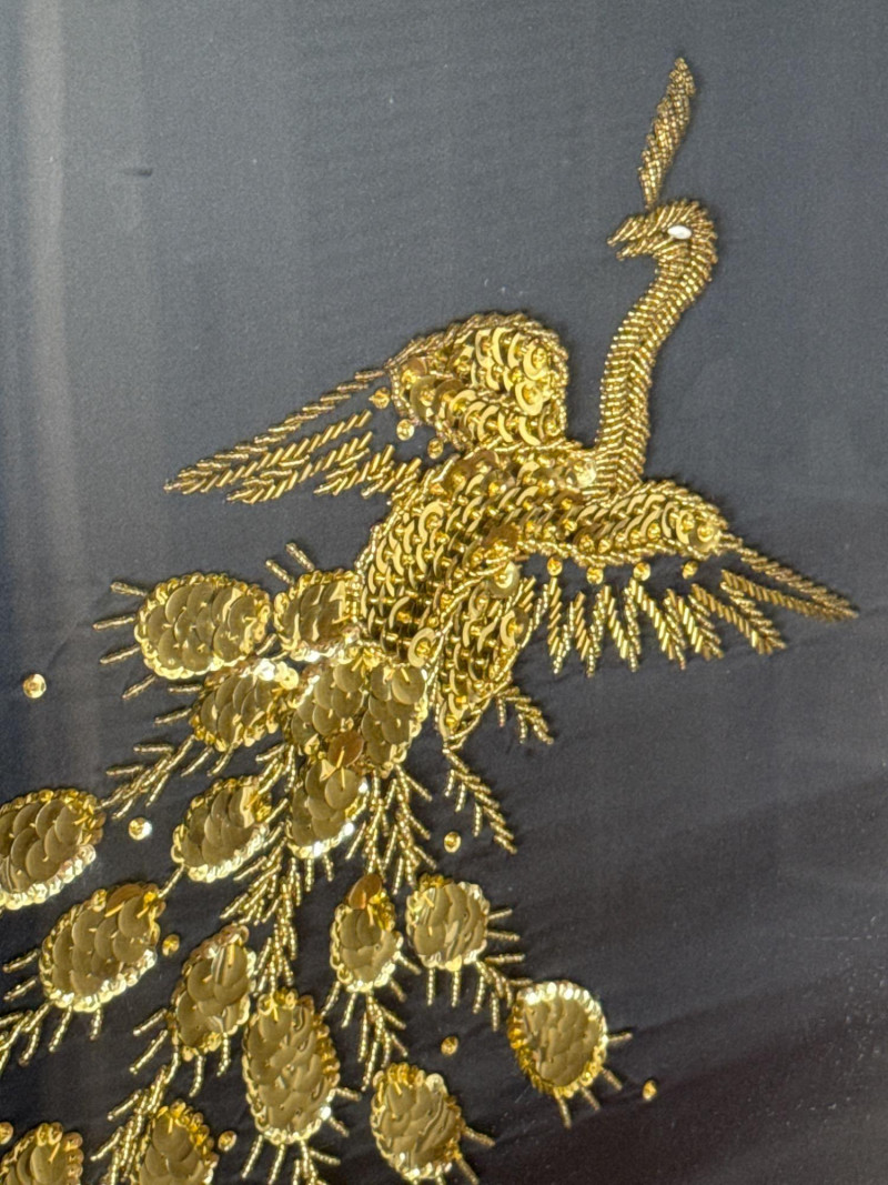 A dramatic and elegant pair of framed Asian-style panels featuring golden peacocks with cascading plumage set against a deep black ground. These large-format artworks shimmer with metallic detail and are beautifully matted and framed—ideal for statement wall décor in formal interiors or curated retail displays. 2 Framed Panels Subject: Golden peacocks with fanned tails and floral accents Background: Deep black for high contrast Matting: Beige Frame: Black wood with clean edges Each Panel: 21.75″ W × 58.5″ H Set Includes