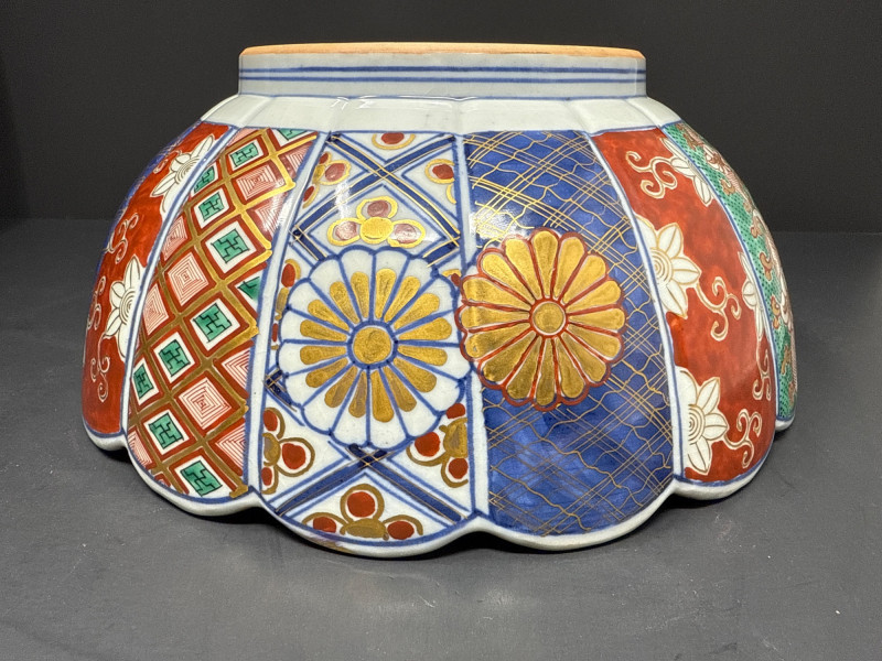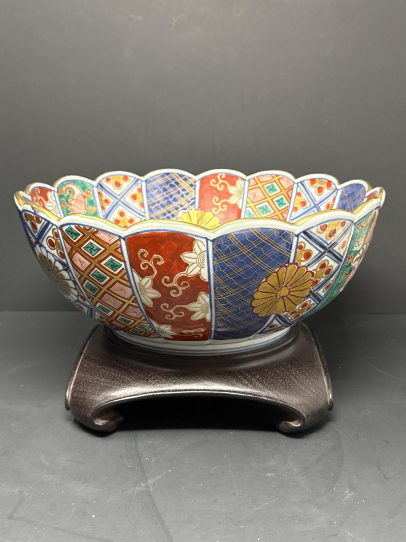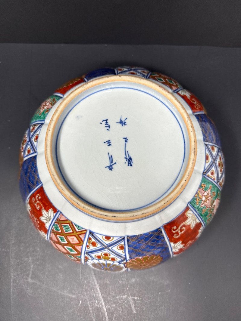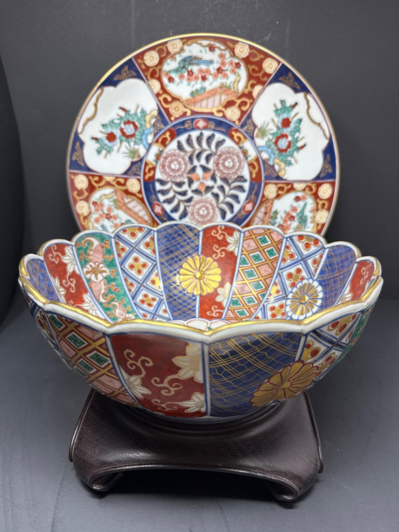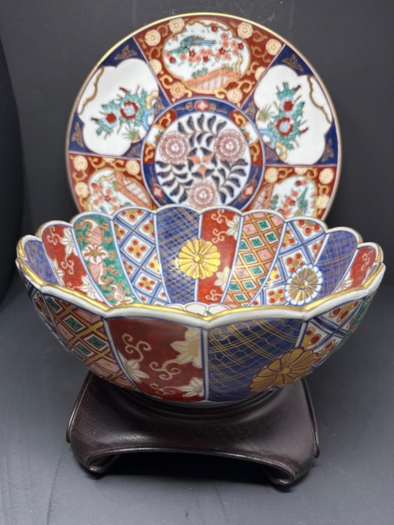 Lot # 173 - Signed Japanese Imari Bowl & Plate – Fluted Porcelain with Stand
