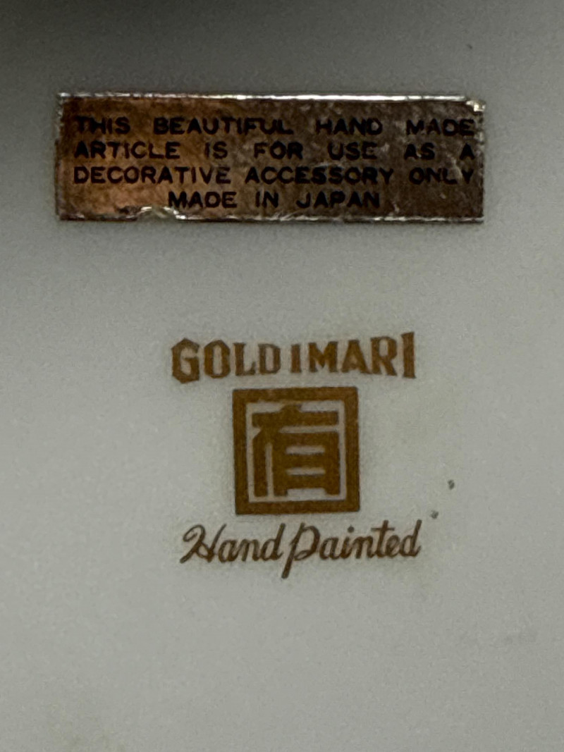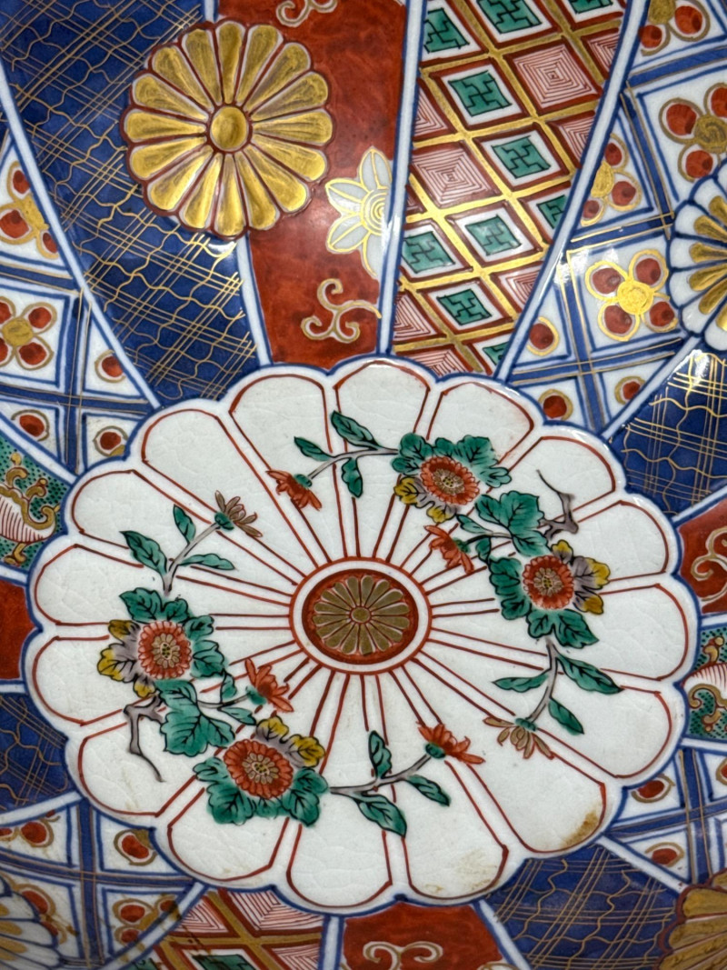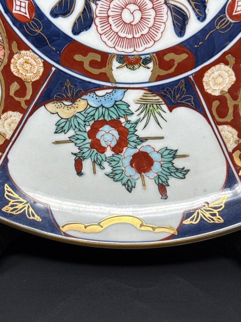 A vibrant and intricately detailed Imari porcelain set from Japan, featuring a scalloped-edge bowl and coordinating plate. Both pieces are signed and showcase traditional Imari motifs—florals, geometrics, and bold colorwork in red, blue, green, and gold. Displayed on a dark wooden stand, this set offers striking visual impact and cultural depth. Fluted Bowl Dimensions: 11" W × 5" H Design: Scalloped edge with multi-panel floral and geometric motifs Colors: Red, blue, yellow, green, and gold Matching Plate Diameter: 14.25" W Design: Alternating panels with central floral medallion Finish: Gloss glaze with hand-painted detailing Display Stand Total Height with Stand: 6.5" Set Includes