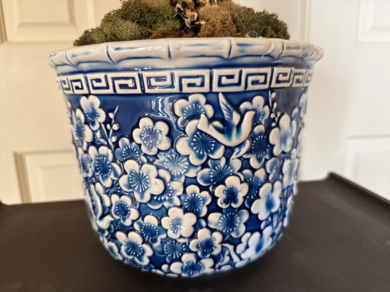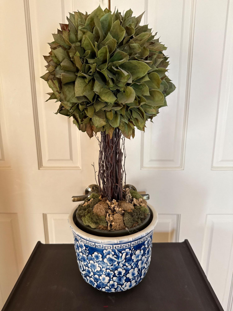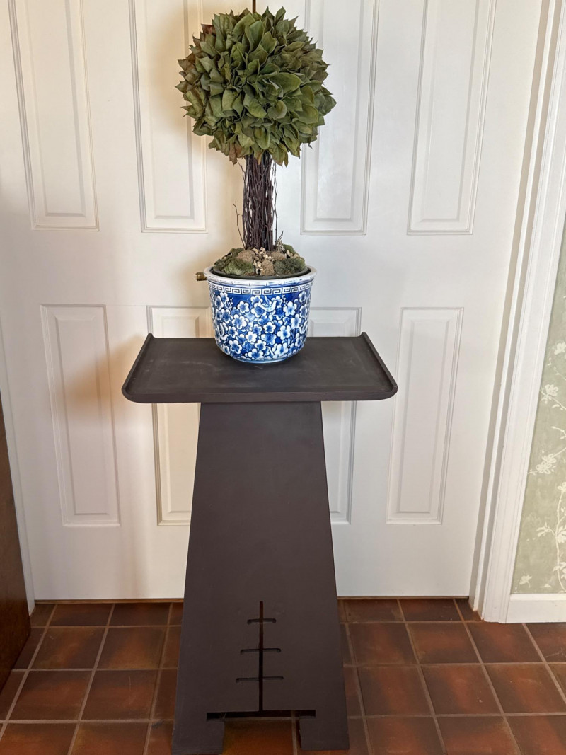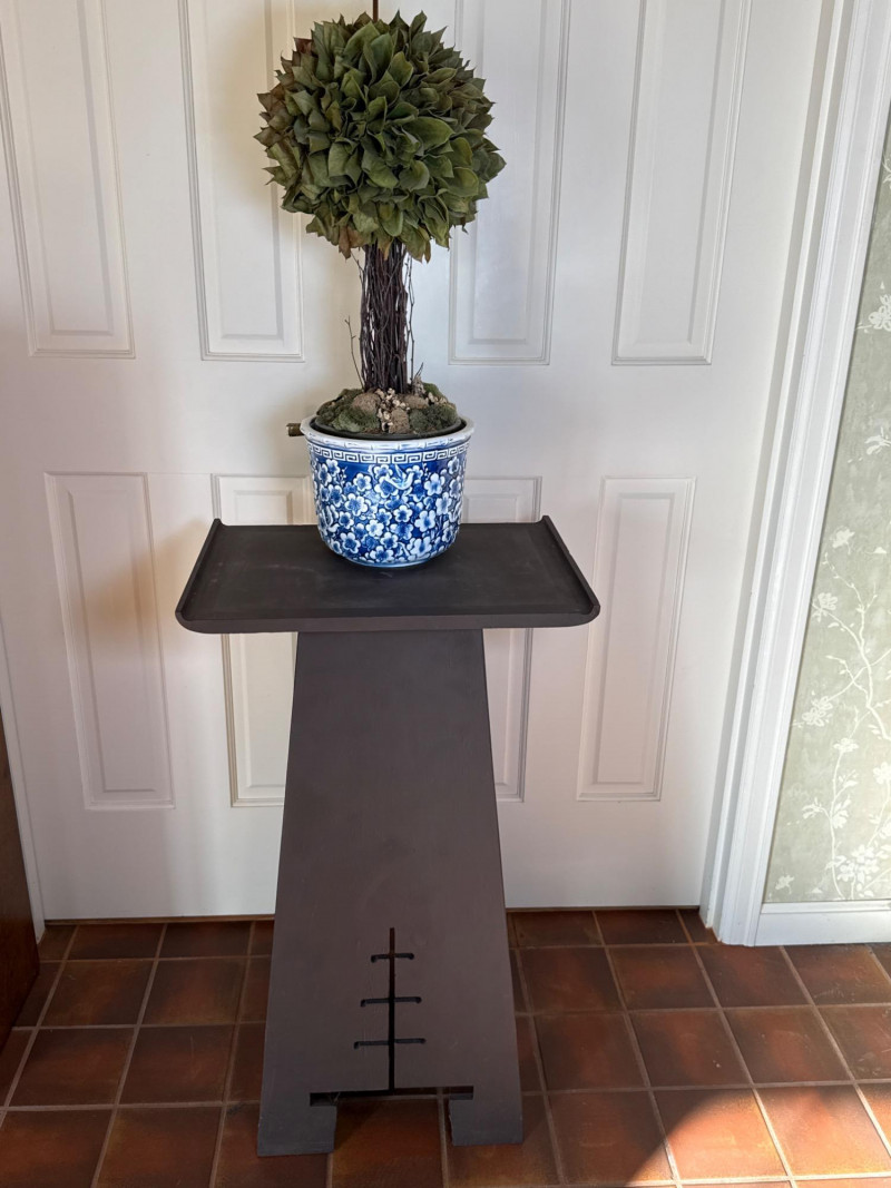 A clean and elegant decorative pairing featuring a geometric Asian-style wood pedestal and a blue-and-white ceramic pot with a faux topiary. The pot’s intricate floral pattern contrasts beautifully with the minimalist cutout base, creating a balanced vignette ideal for entryways, sunrooms, or retail staging. Ceramic Pot Dimensions: 7" H × 9" W Design: Blue-and-white floral motif Contents: Faux topiary with spherical greenery Total Height with Plant: 26" Wood Pedestal Stand Dimensions: 19.25" L × 14" W × 32" H Style: Asian-inspired with cutout base and wide top surface Finish: Dark woodSet Includes