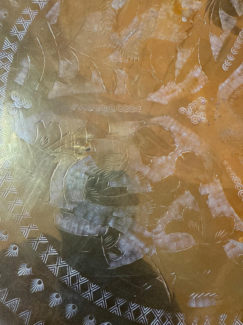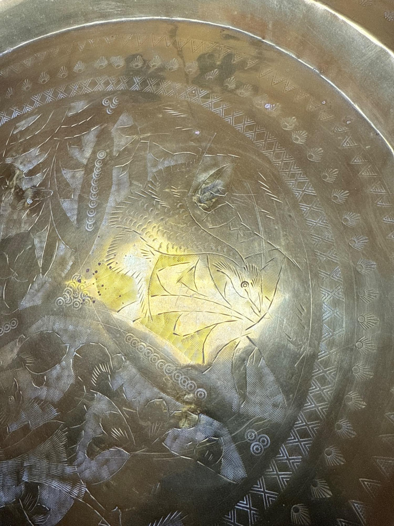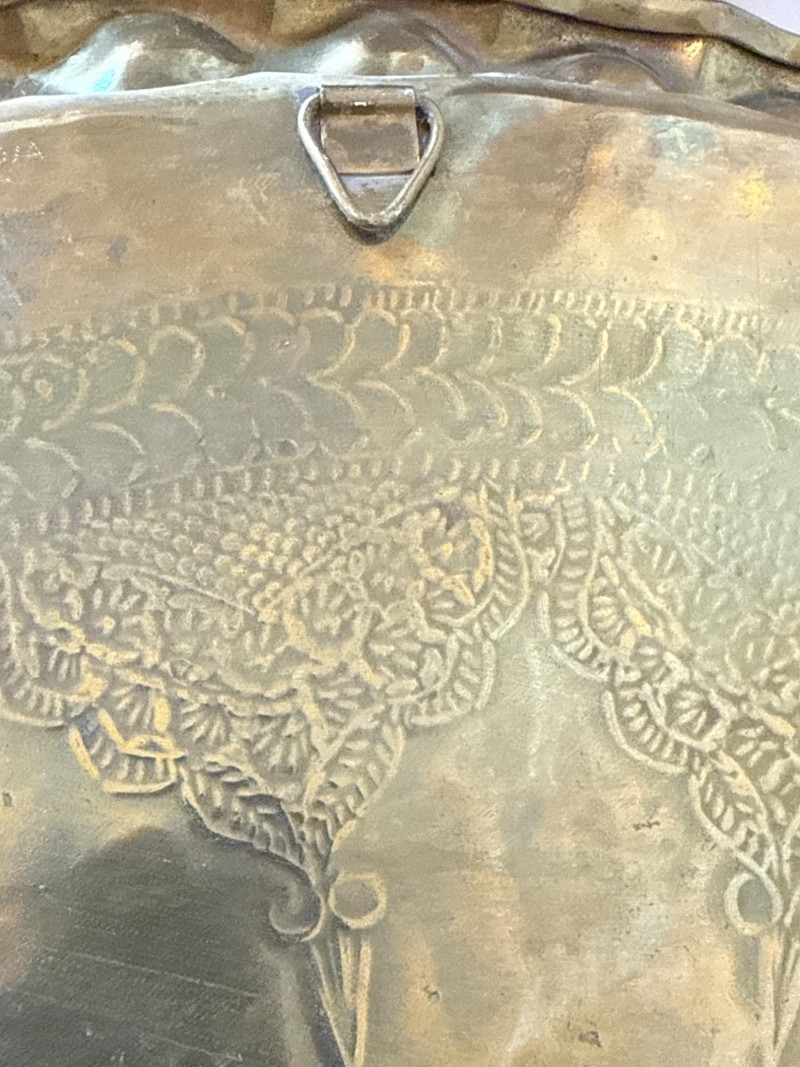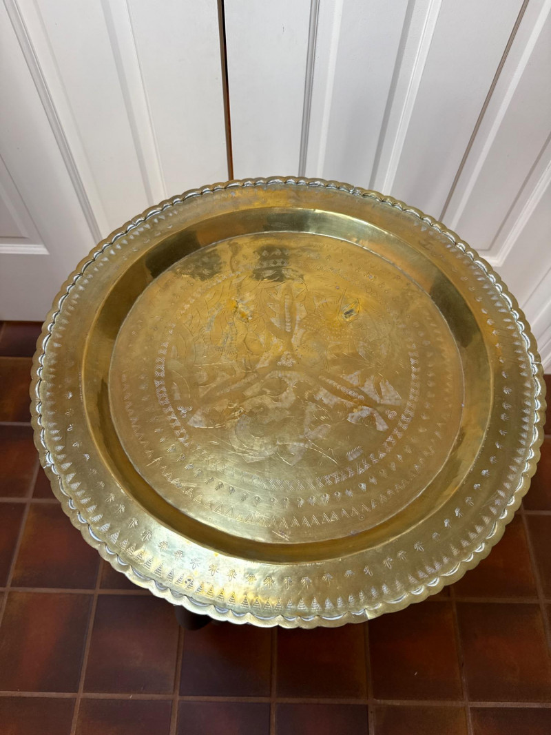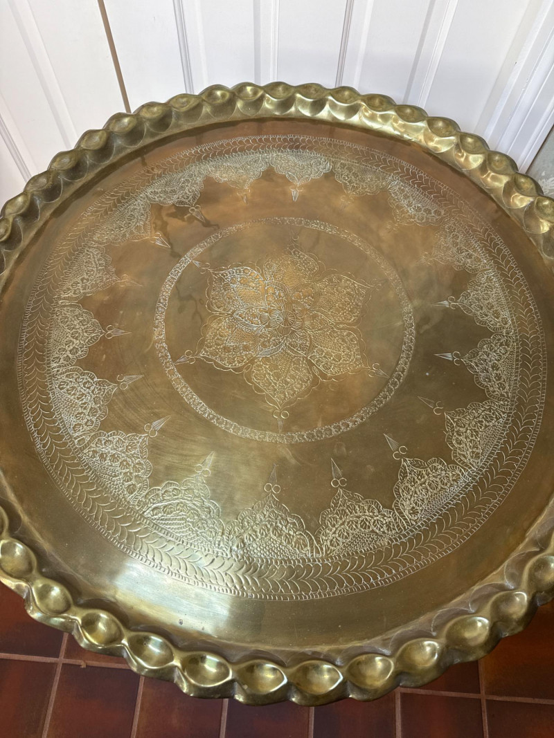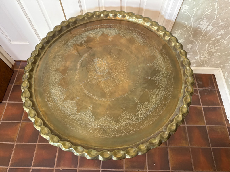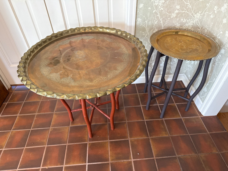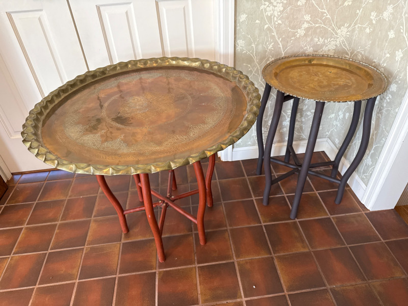 Lot # 185 - Pair of Decorative Brass Trays with Folding Wood Stands – 2 Sizes
