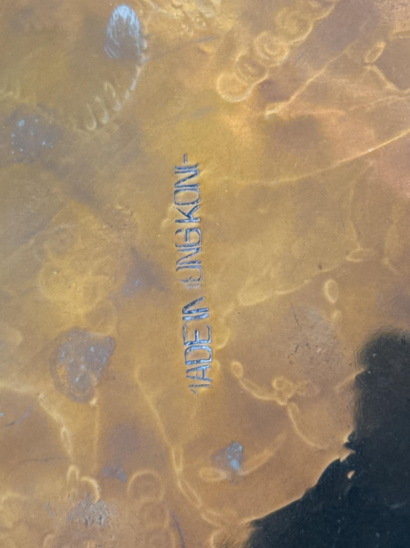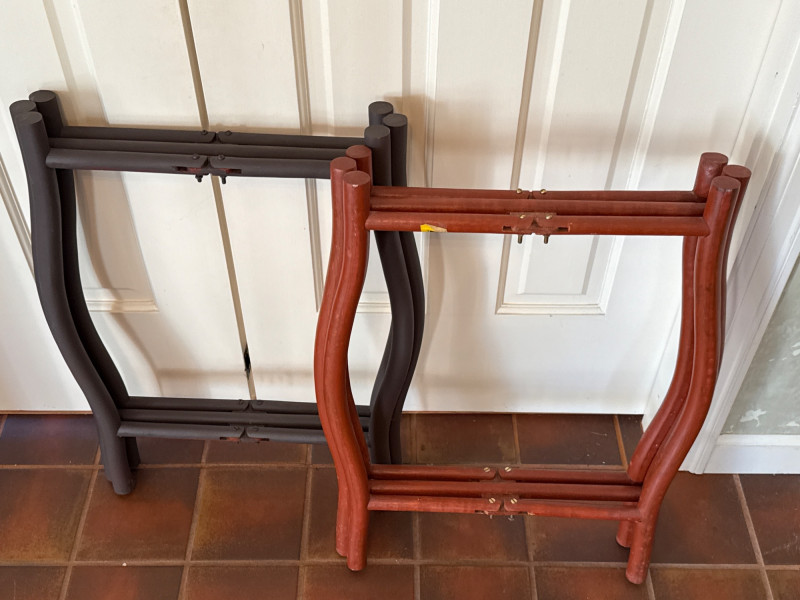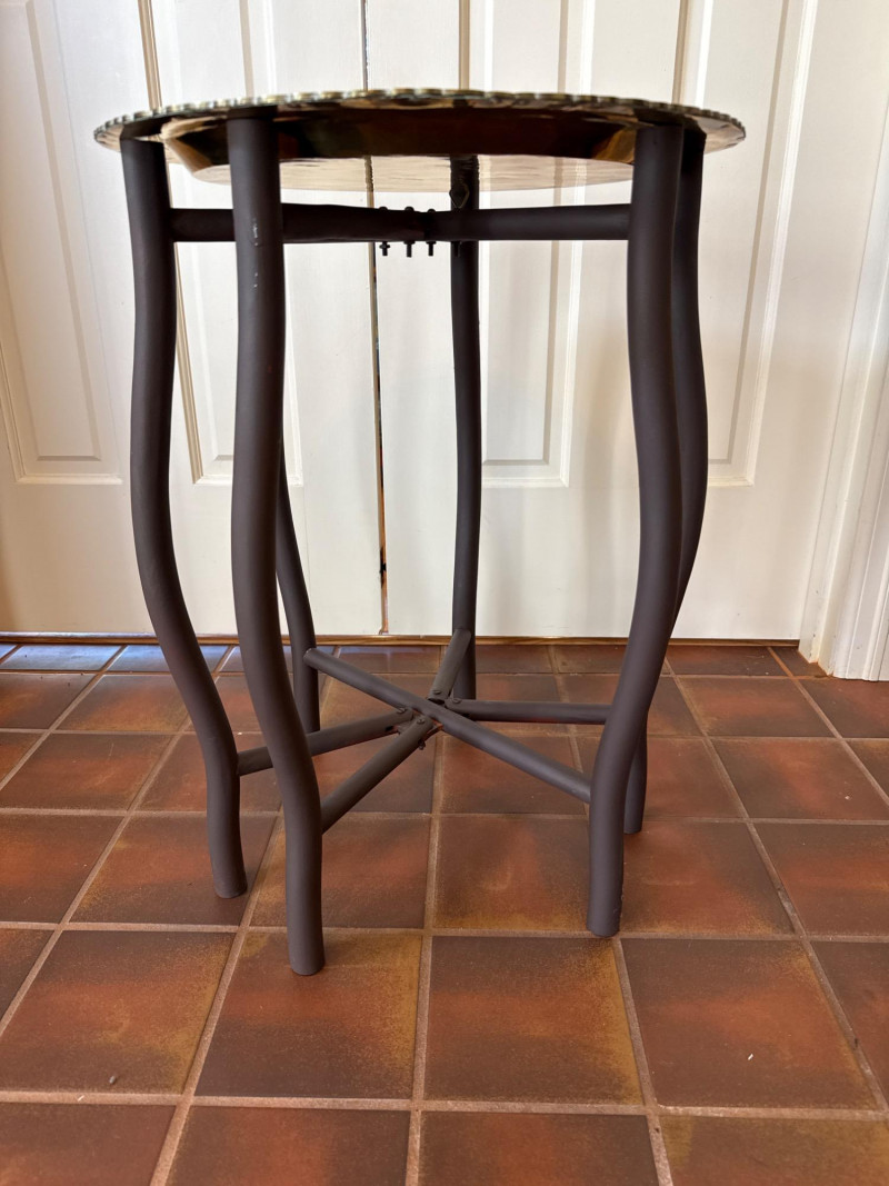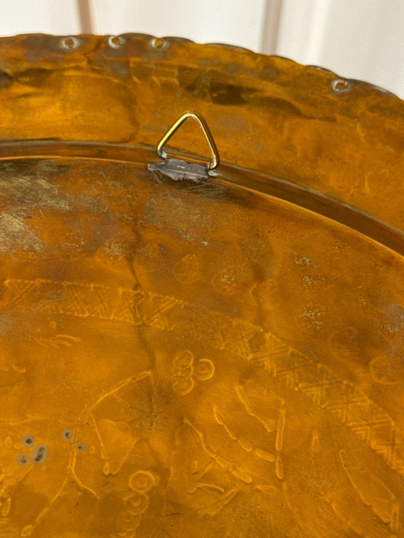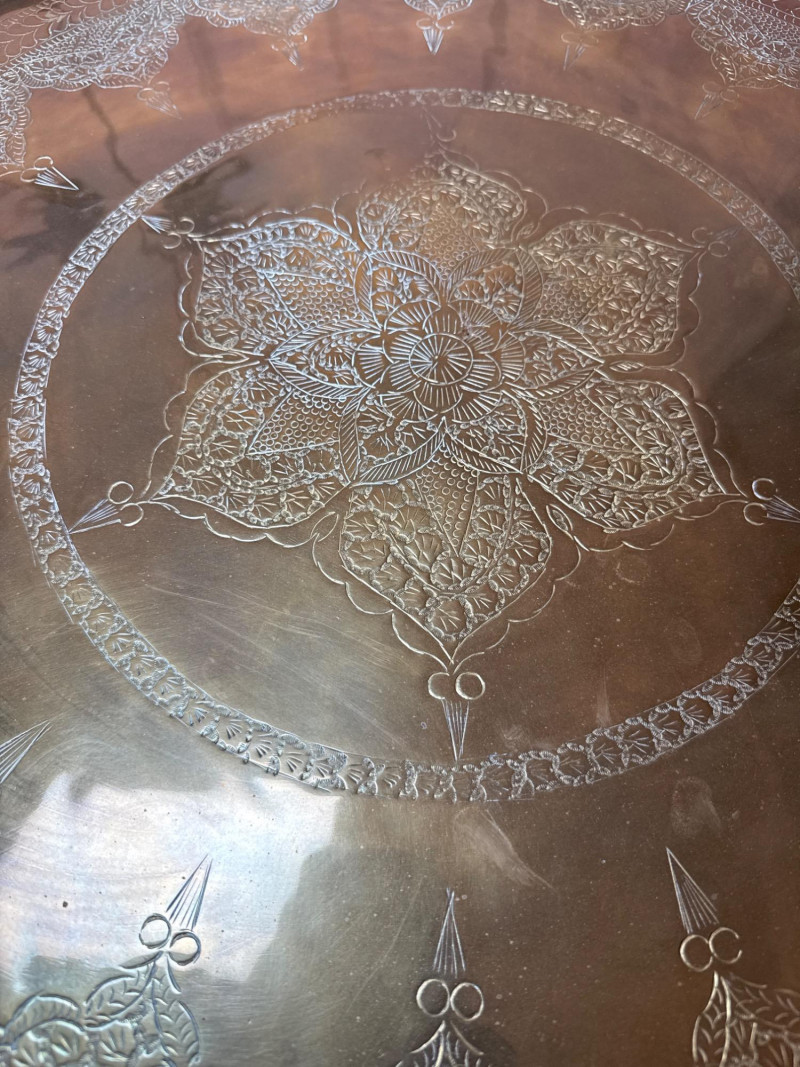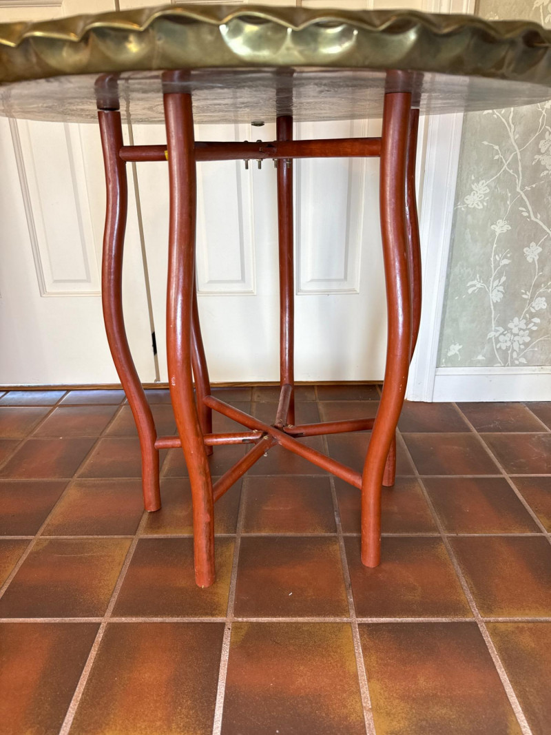 A striking duo of decorative brass trays, each mounted on collapsible wooden stands and designed for versatile use as accent tables or wall décor. Featuring scalloped edges and rich patinas—one reddish-bronze, the other golden—the trays evoke Middle Eastern or North African design traditions. Both are removable and include hooks for wall mounting, offering flexible styling options. Large Tray with Red Stand Diameter: 30.5" Finish: Reddish-bronze patina with scalloped edge Stand: Red wood with curved legs; collapsible Small Tray with Dark Stand Diameter: 18" Finish: Golden-brown patina with scalloped edge Stand: Dark wood with curved legs; collapsibleSet Includes