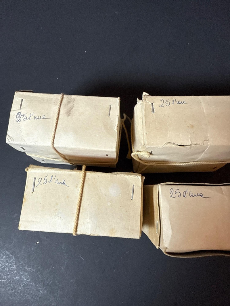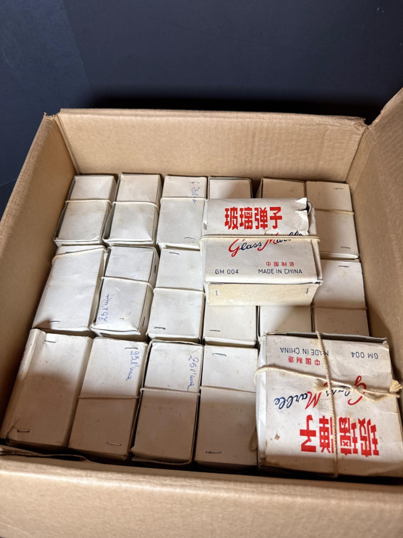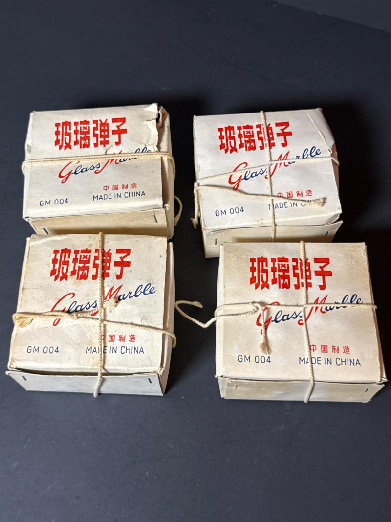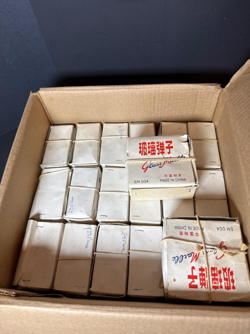 A neatly packed bulk lot of vintage glass marbles, all housed in identical white paper packages printed with red Chinese characters and English text: