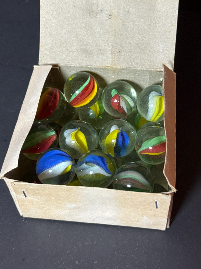 Each package is factory-sealed and arranged in rows within the original cardboard box, offering a clean and cohesive presentation ideal for resale, display, or nostalgic collecting. Multiple sealed packages of glass marbles All packaging identical and printed with product details Original cardboard box incluLot Includes
