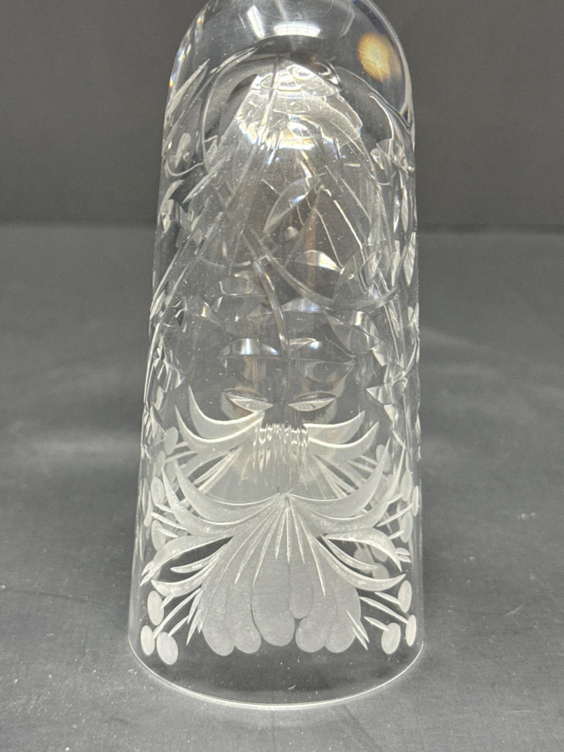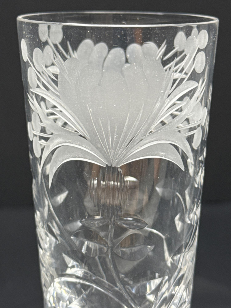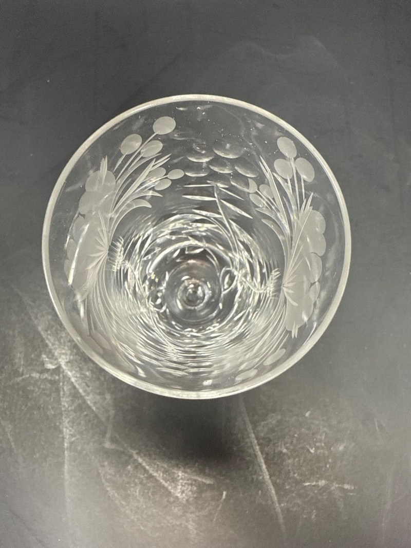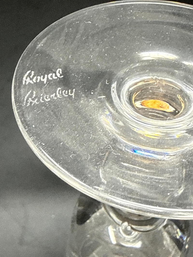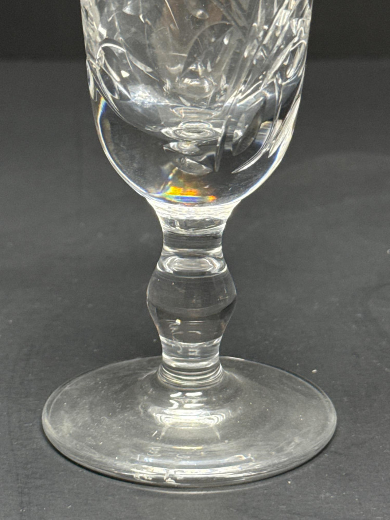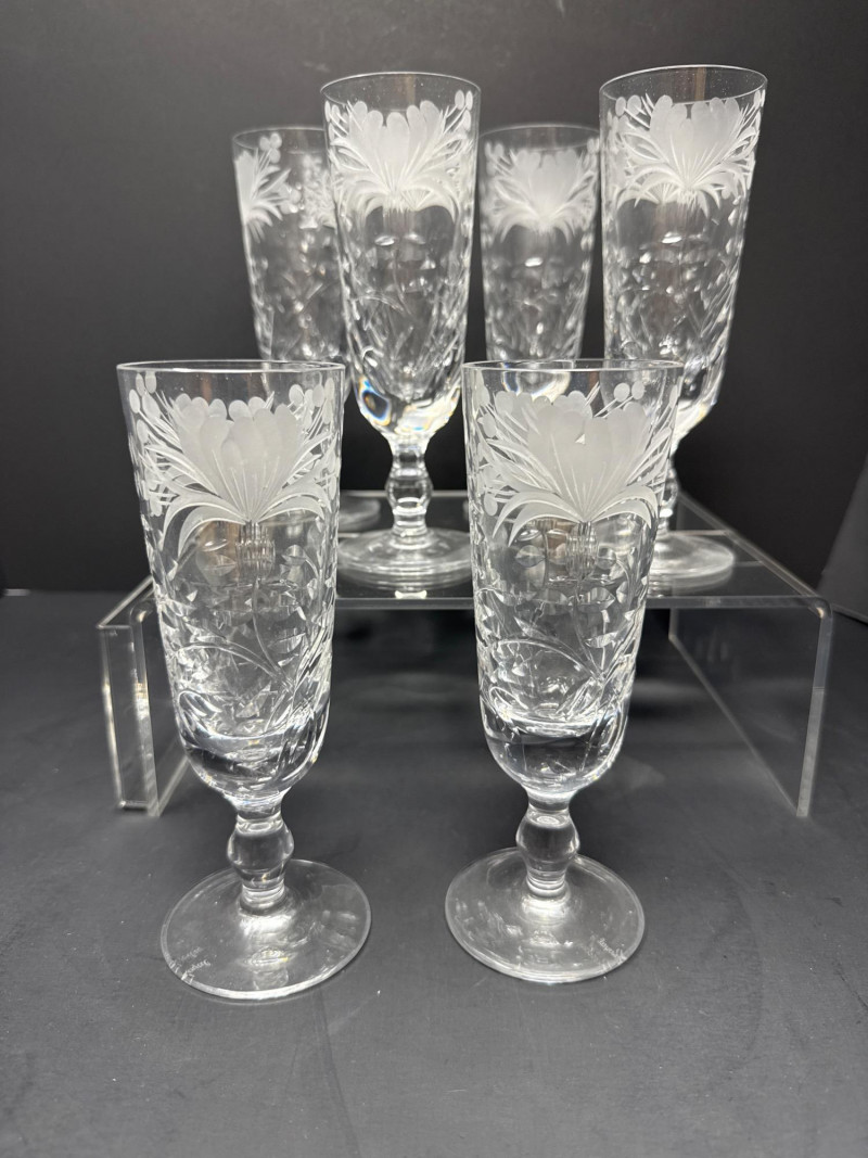 A refined set of six Royal Brierley champagne flutes featuring the elegant “Honeysuckle” etched floral pattern. Each clear glass goblet showcases a large central bloom surrounded by delicate botanical detailing, with short rounded stems and wide bases for stability. Elevated on a transparent display stand, this set offers symmetry, craftsmanship, and timeless appeal. Six Champagne Flutes Pattern: “Honeysuckle” etched floral motif Maker: Royal Brierley Dimensions: 7" H each Display: Four elevated on stand, two placed below Set Includes