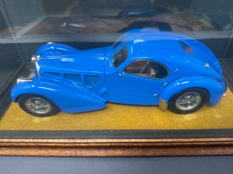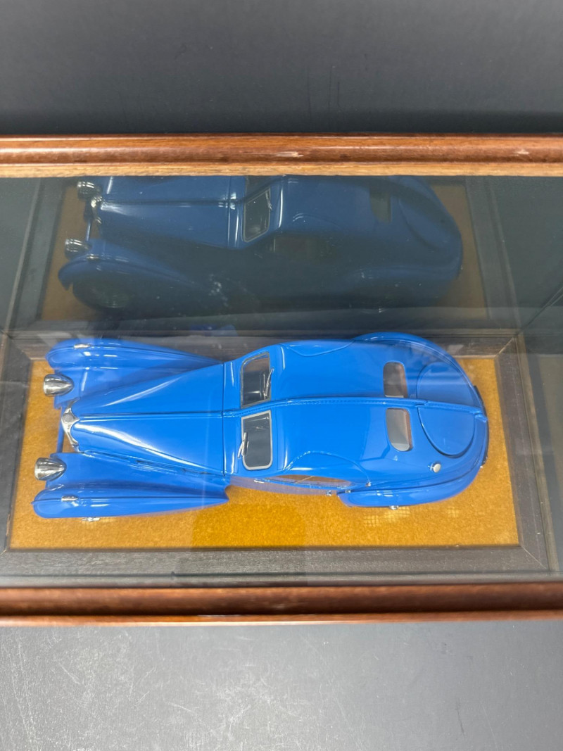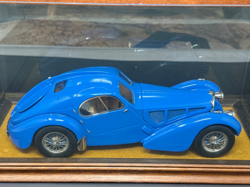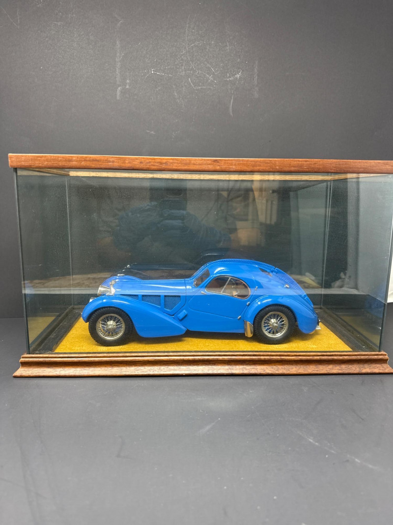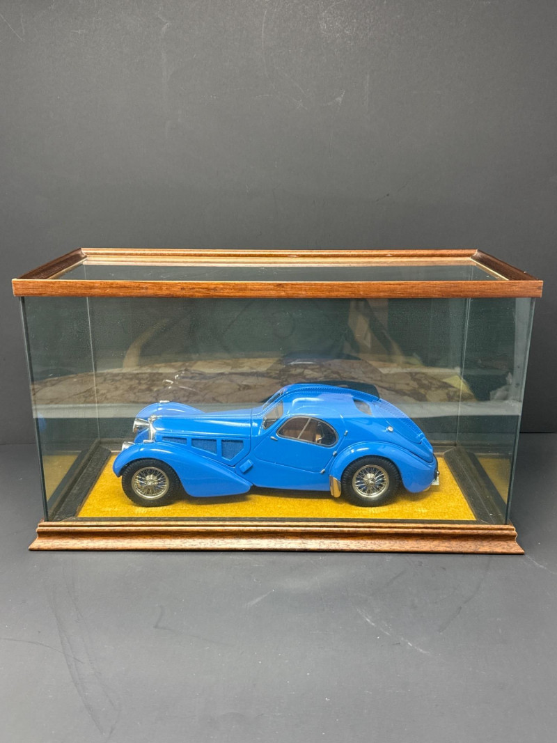 A beautifully preserved vintage diecast Bugatti model housed in a custom glass display case with a wood base and frame. The car features a streamlined body, wire-spoke wheels, and early 20th-century styling, rendered in rich blue with chrome accents. Item Details Model: Vintage Bugatti diecast car Dimensions: 12" L × 4" H × 5" W Color: Blue with chrome detailing Style: Early-to-mid 20th century design Display Case Dimensions: 17.5" L × 10" H × 8" W Materials: Glass panels with wood frame and base Light surface wear consistent with age Case intact and display-ready Sold as-is Condition Notes