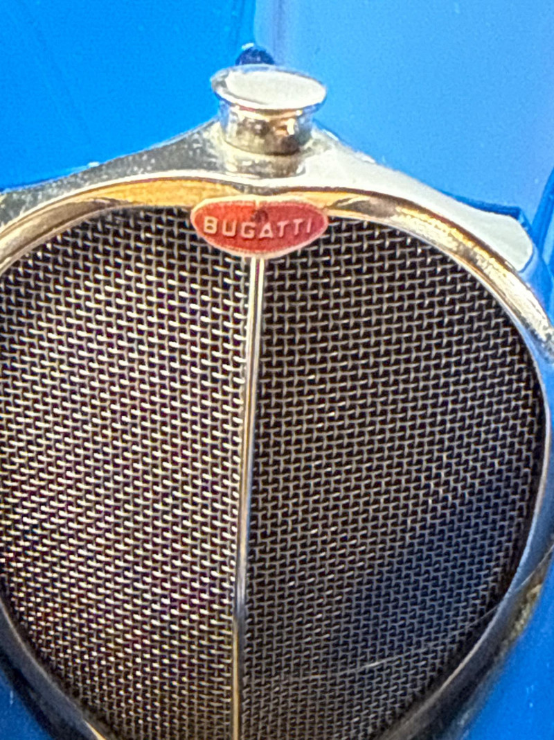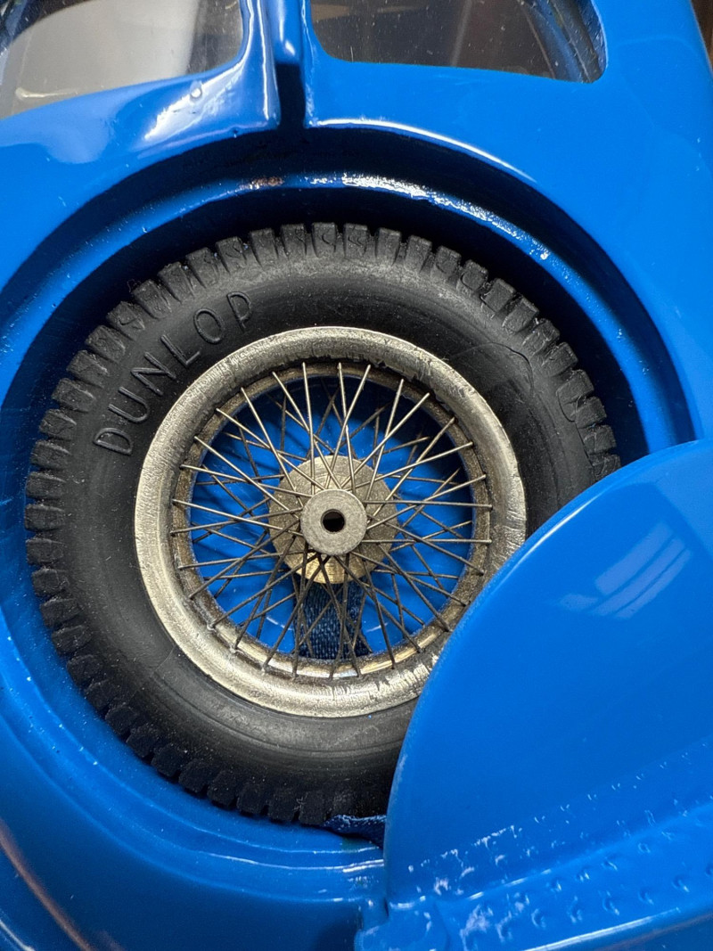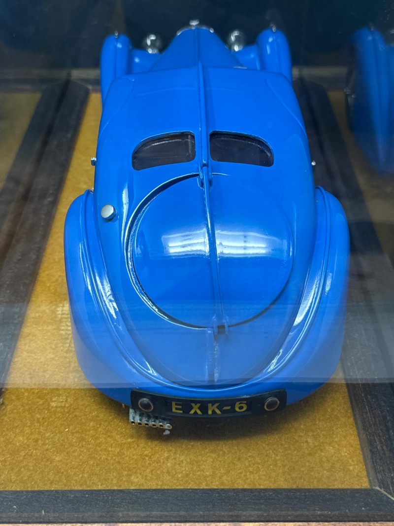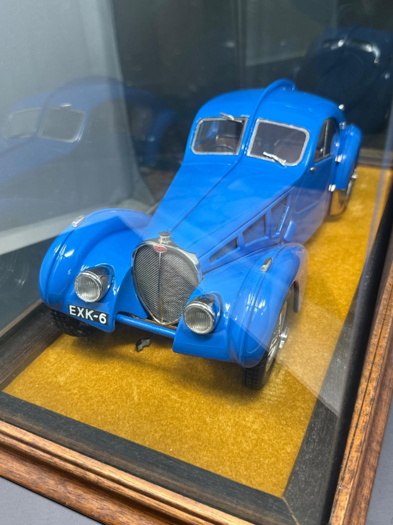 A beautifully preserved vintage diecast Bugatti model housed in a custom glass display case with a wood base and frame. The car features a streamlined body, wire-spoke wheels, and early 20th-century styling, rendered in rich blue with chrome accents. Item Details Model: Vintage Bugatti diecast car Dimensions: 12" L × 4" H × 5" W Color: Blue with chrome detailing Style: Early-to-mid 20th century design Display Case Dimensions: 17.5" L × 10" H × 8" W Materials: Glass panels with wood frame and base Light surface wear consistent with age Case intact and display-ready Sold as-is Condition Notes