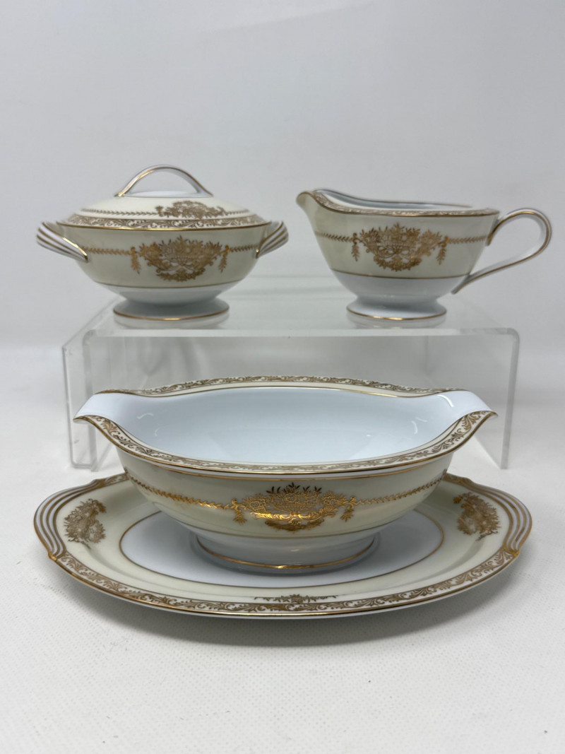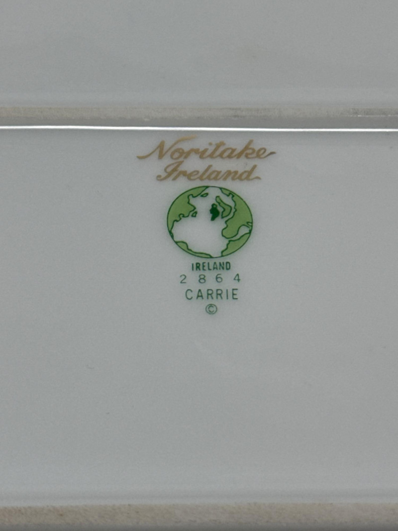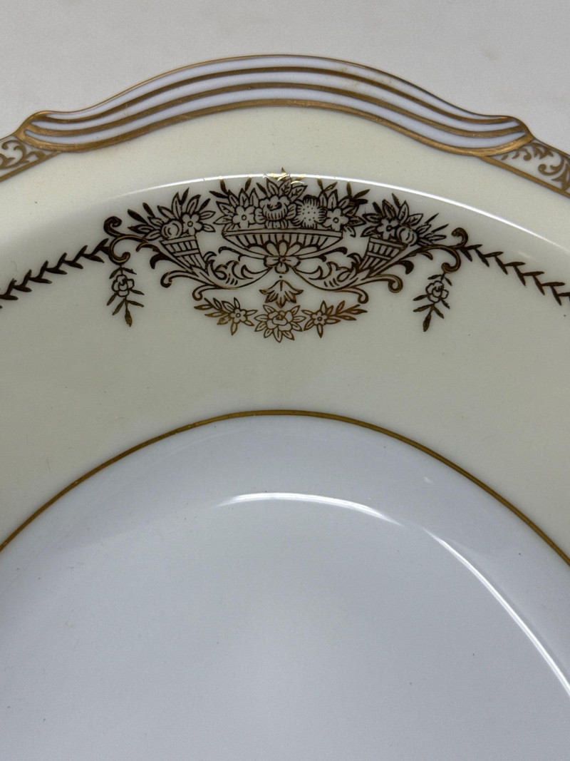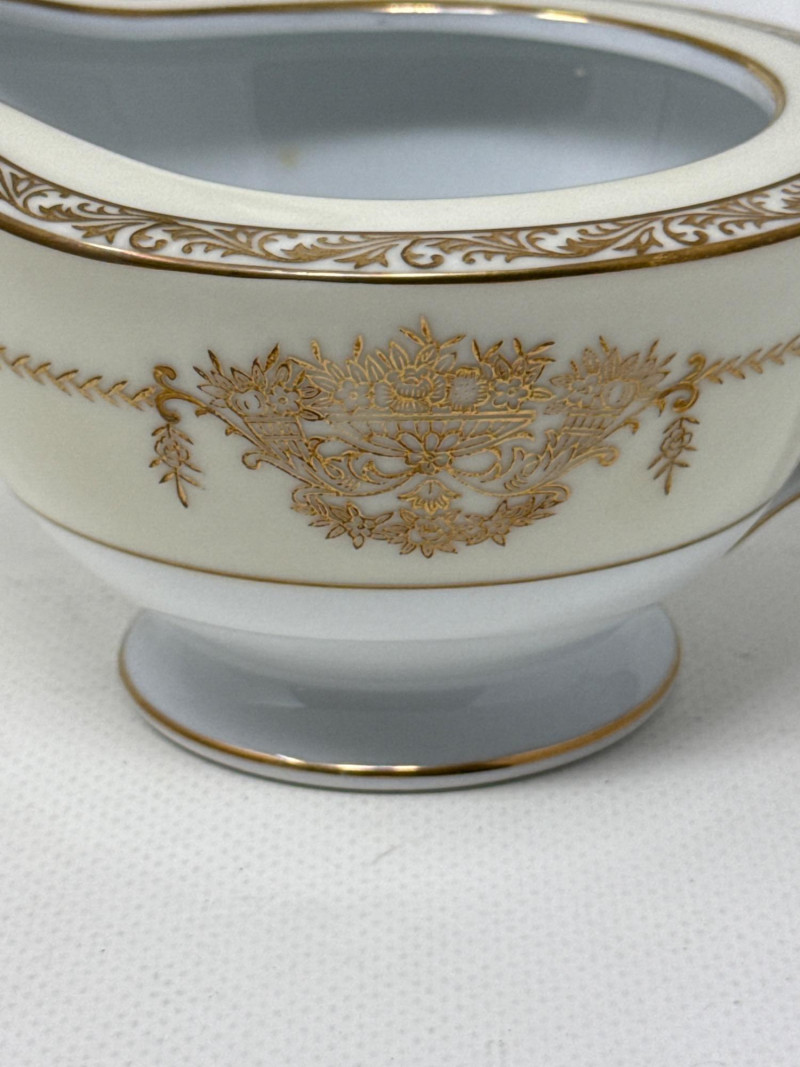 An elegant and expansive set of Noritake “Bancroft” fine china featuring a white base with intricate gold and brown floral rim detailing. This coordinated collection includes dinner plates, soup bowls, serving platters, a gravy boat, covered tureen, and teacups with saucers—many pieces still carefully wrapped. Ideal for formal dining, resale, or collectors seeking a complete and refined table setting. 12 Dinner Plates – 10" diameter 12 Soup Bowls – 10.5" diameter 3 Serving Platters – Three identical trays, 13.5" L × 6.5" W 1 Large Oval Platter – 16.25" L × 12" W 1 Medium Oval Platter- 12”L x 6” W 1 Round Serving Bowl – 10.5" diameter 1 Gravy Boat – 9" L × 6" W × 3.5" H 1 Additional Serving Dish – 10.5" L × 7.5" W 13 Teacups & 14 Saucers – Quantity not specified 12 Salad Plates 12 Dessert Plates 12 Bread/finger Bowls 1 each Creamer and Sugar Dish No defects found. Pieces were unwrapped and counted Sold as a complete lot Pattern: “Carrie” (on serving trays) This Noritake set offers timeless elegance and exceptional completeness—perfect for formal entertaining, heirloom gifting, or resale to collectors of fine Japanese porcelain.Set Includes