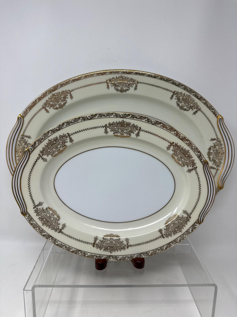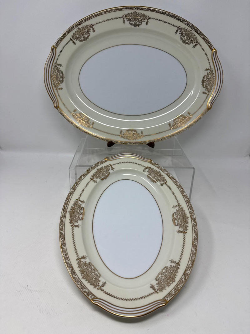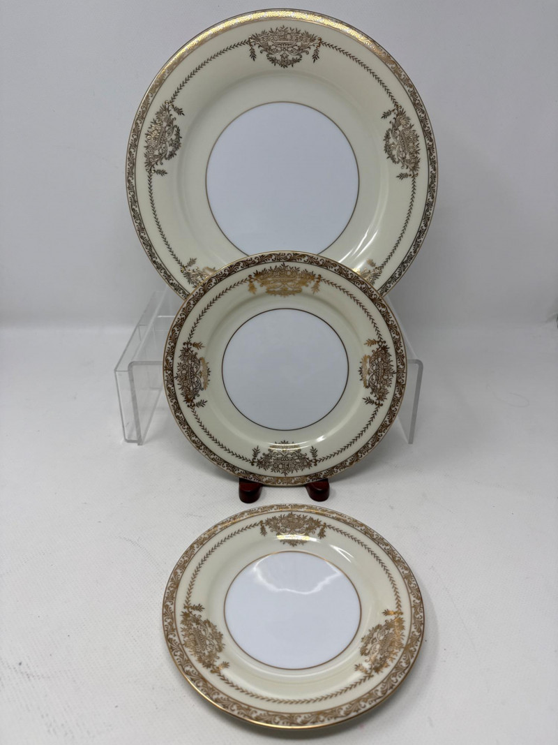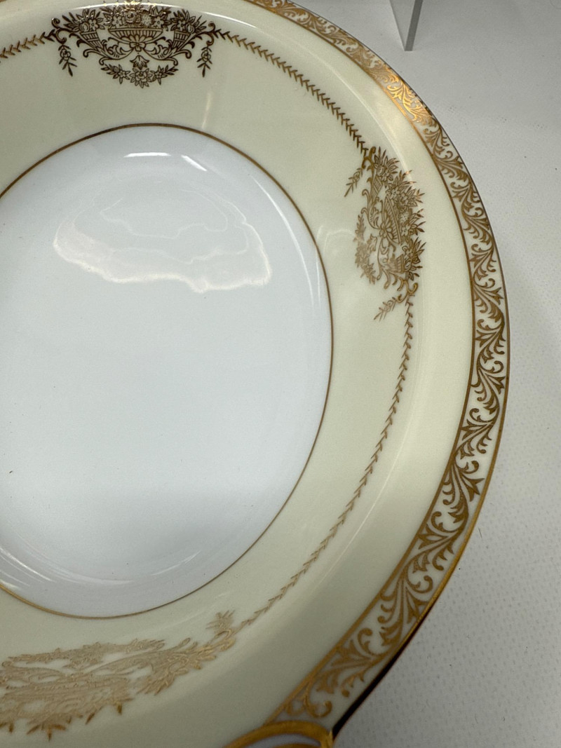 An elegant and expansive set of Noritake “Bancroft” fine china featuring a white base with intricate gold and brown floral rim detailing. This coordinated collection includes dinner plates, soup bowls, serving platters, a gravy boat, covered tureen, and teacups with saucers—many pieces still carefully wrapped. Ideal for formal dining, resale, or collectors seeking a complete and refined table setting. 12 Dinner Plates – 10" diameter 12 Soup Bowls – 10.5" diameter 3 Serving Platters – Three identical trays, 13.5" L × 6.5" W 1 Large Oval Platter – 16.25" L × 12" W 1 Medium Oval Platter- 12”L x 6” W 1 Round Serving Bowl – 10.5" diameter 1 Gravy Boat – 9" L × 6" W × 3.5" H 1 Additional Serving Dish – 10.5" L × 7.5" W 13 Teacups & 14 Saucers – Quantity not specified 12 Salad Plates 12 Dessert Plates 12 Bread/finger Bowls 1 each Creamer and Sugar Dish No defects found. Pieces were unwrapped and counted Sold as a complete lot Pattern: “Carrie” (on serving trays) This Noritake set offers timeless elegance and exceptional completeness—perfect for formal entertaining, heirloom gifting, or resale to collectors of fine Japanese porcelain.Set Includes