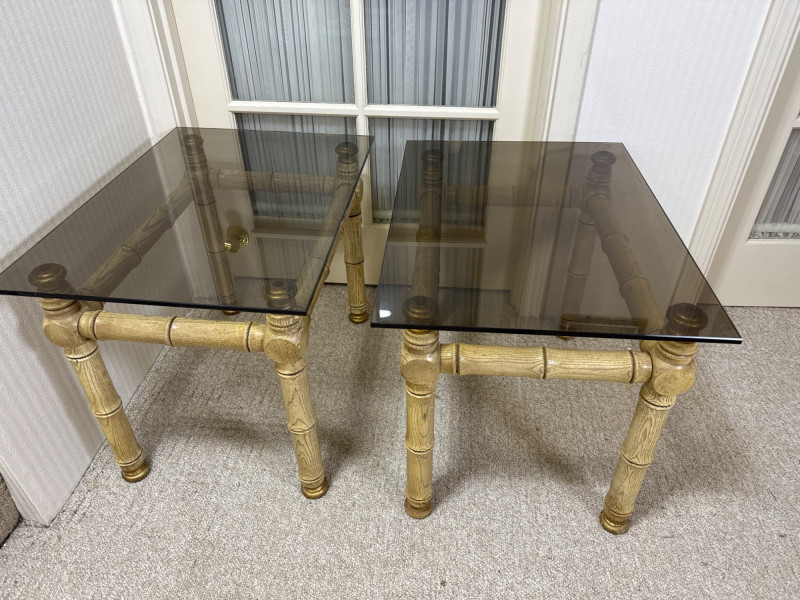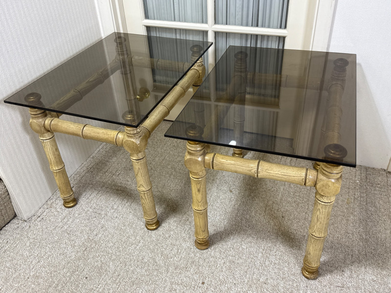 Lot # 197 - Pair of Vintage Smoked Glass & Bamboo-Style End Tables – 28" Length