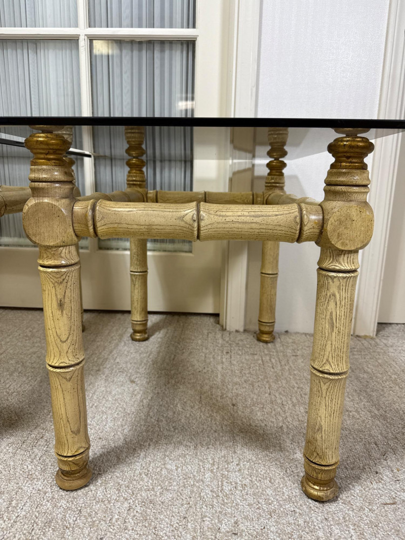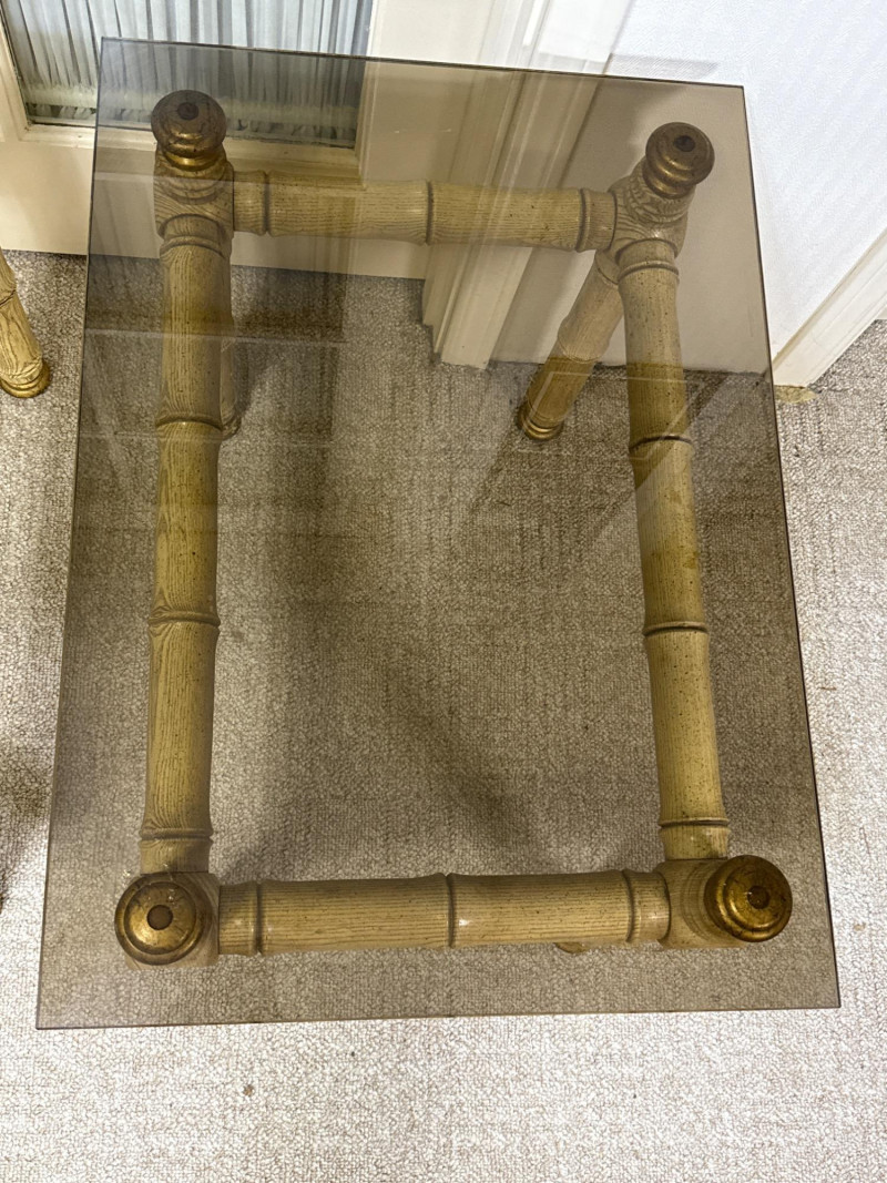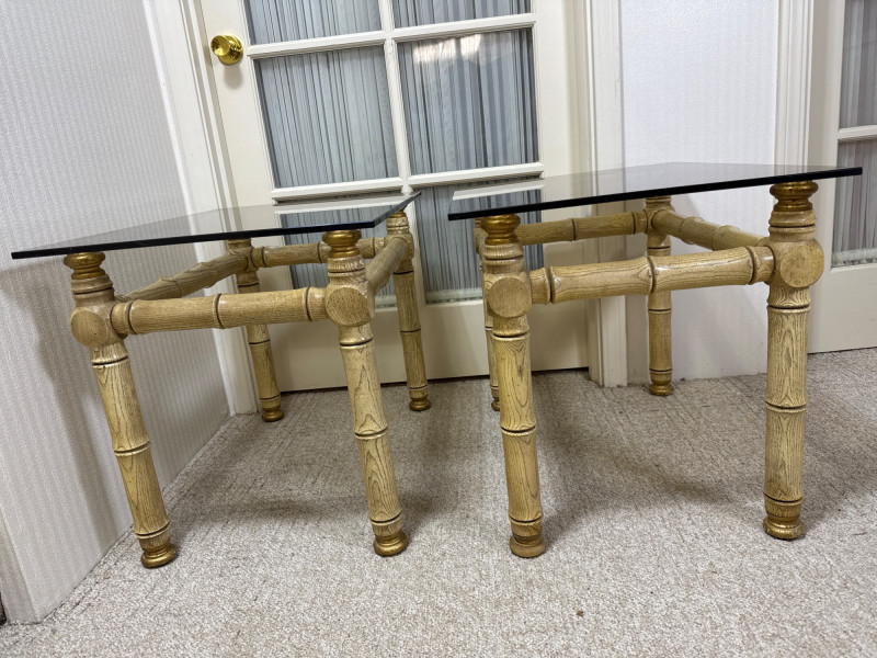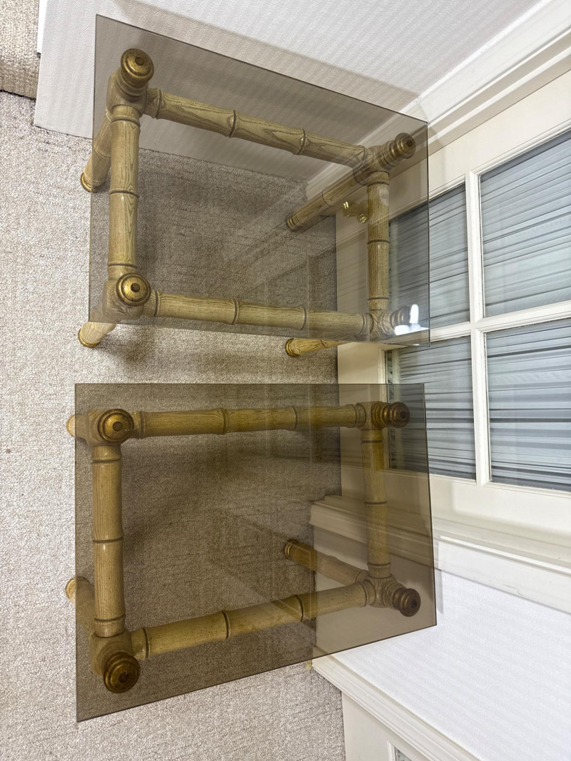 A stylish pair of vintage end tables featuring square smoked glass tops and faux bamboo frames. The legs and supports mimic the segmented texture of bamboo stalks, offering a tropical-meets-transitional aesthetic. Lightweight yet sturdy, these tables are ideal for sunrooms, coastal interiors, or resale to decorators seeking themed accent pieces. Materials: Smoked glass tops, bamboo-style metal frames Design: Faux bamboo legs and supports with square tinted glass surfaces Quantity: Set of two identical tables Length: 28" Width: 20" Height: 21.5" Item Details