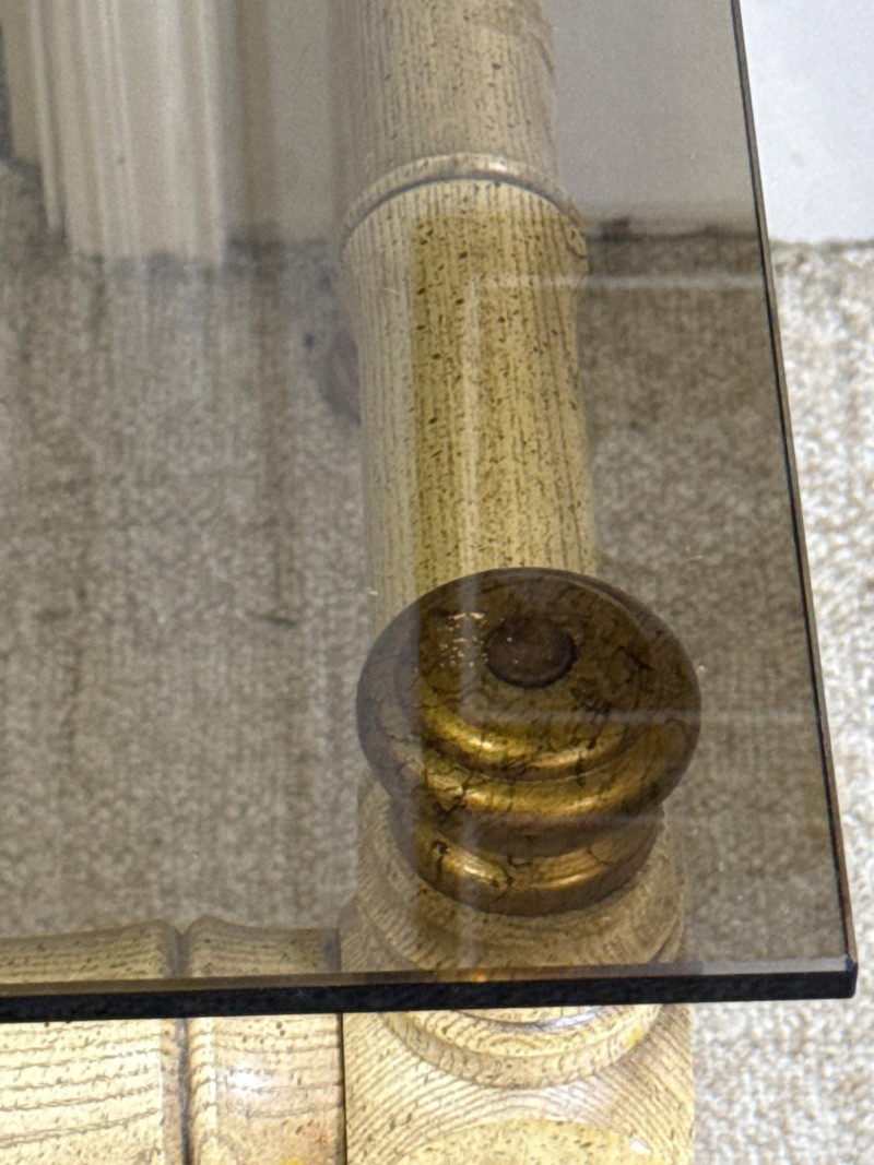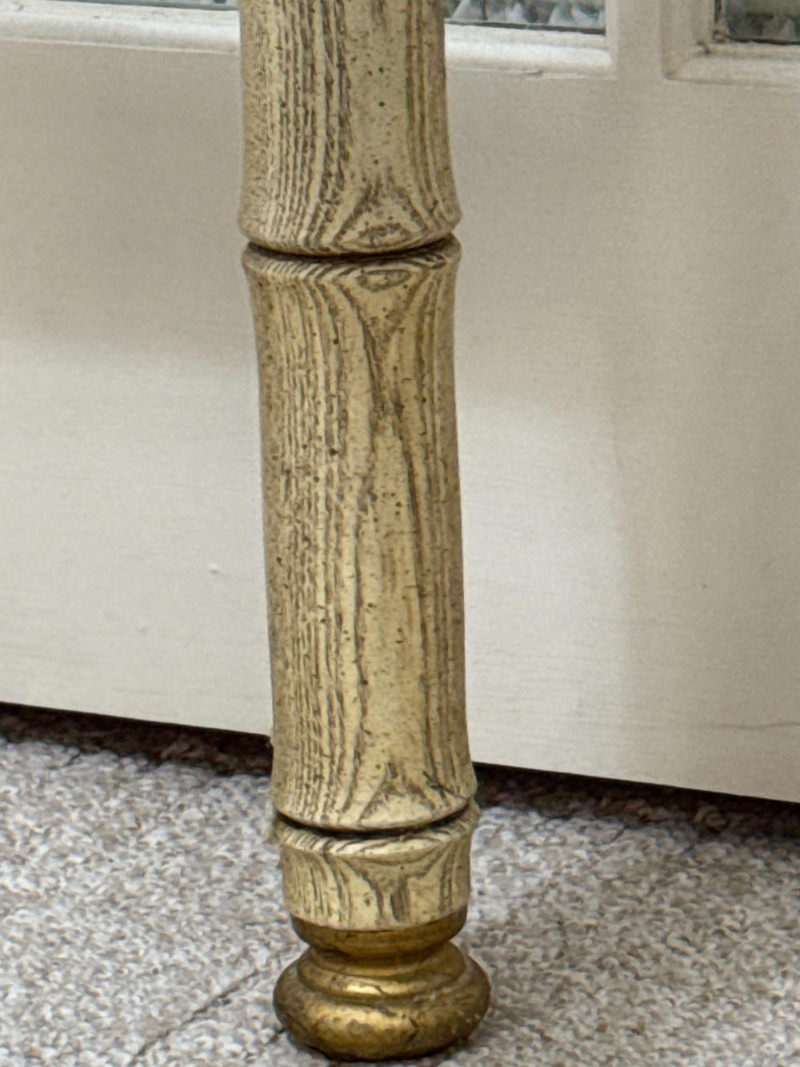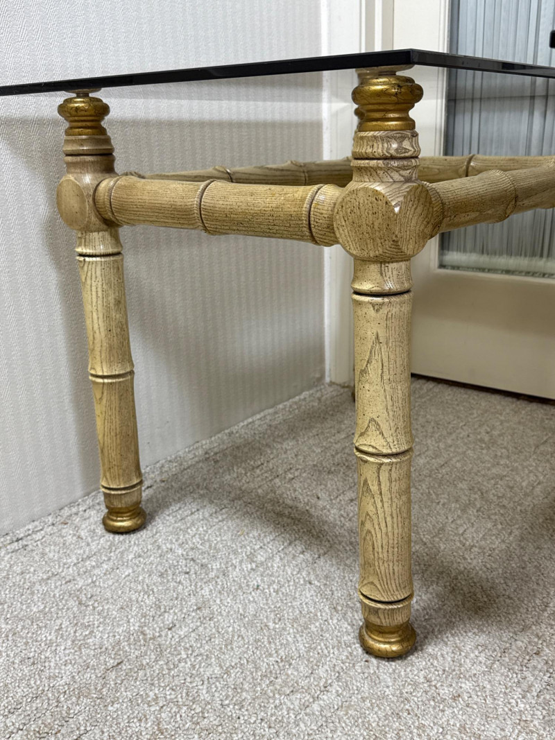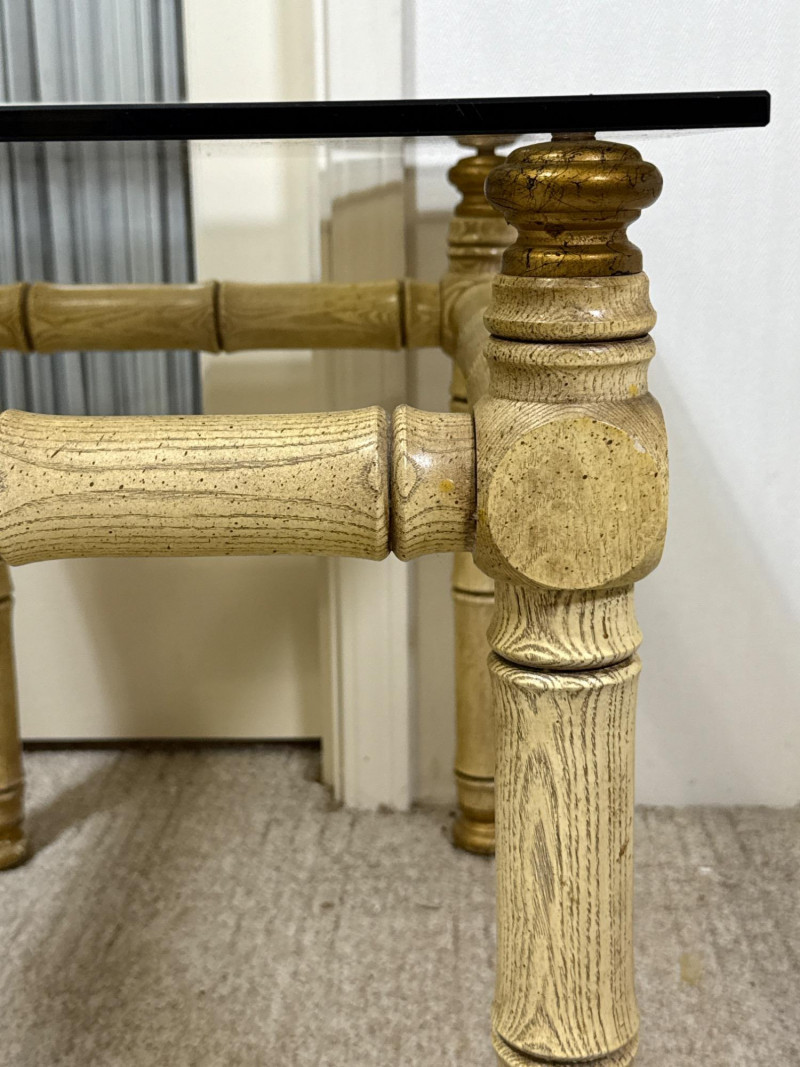 A stylish pair of vintage end tables featuring square smoked glass tops and faux bamboo frames. The legs and supports mimic the segmented texture of bamboo stalks, offering a tropical-meets-transitional aesthetic. Lightweight yet sturdy, these tables are ideal for sunrooms, coastal interiors, or resale to decorators seeking themed accent pieces. Materials: Smoked glass tops, bamboo-style metal frames Design: Faux bamboo legs and supports with square tinted glass surfaces Quantity: Set of two identical tables Length: 28" Width: 20" Height: 21.5" Item Details