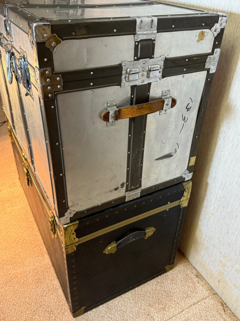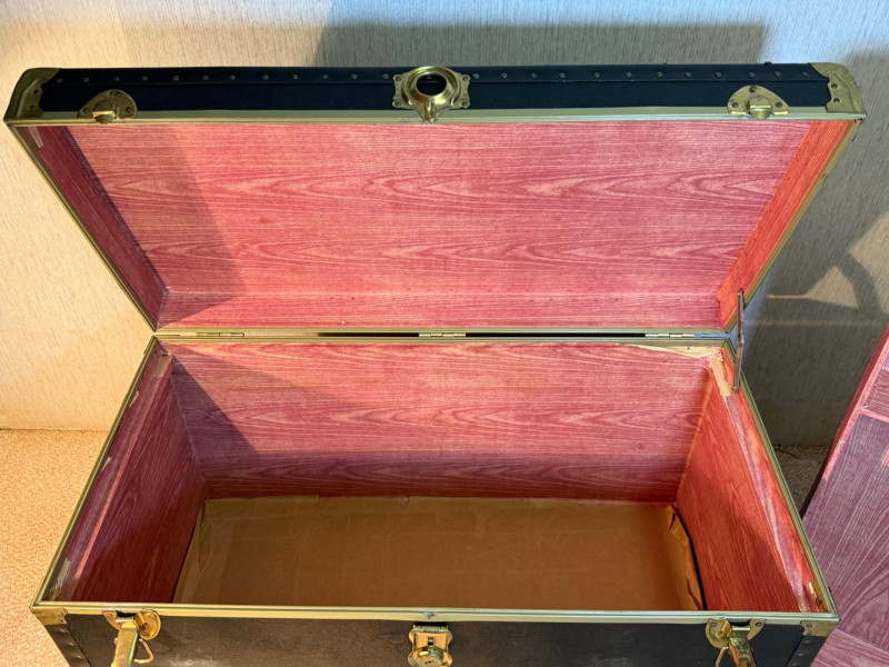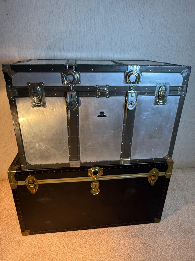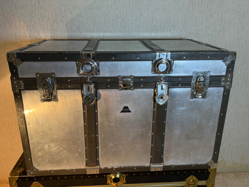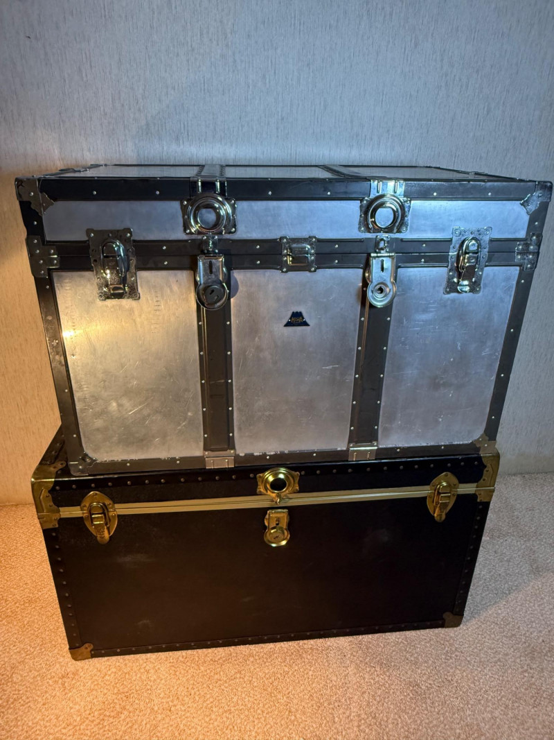 A rugged and visually striking duo of vintage trunks, stacked and ready for display or storage. The top trunk features a metallic silver steel exterior with black trim, brass corner protectors, and latches, plus a central emblem with a mountain logo. The bottom trunk is wrapped in black faux leather with brass hardware and trim, offering a classic travel aesthetic. Together, they evoke industrial charm and timeless utility—ideal for decorators, collectors, or resale pros seeking bold statement pieces. Top Trunk: Material: Steel with black trim Dimensions: 22.5" H × 36" L × 21" D Features: Brass hardware, central emblem Bottom Trunk: Material: Faux leather with brass trim Dimensions: 22" H × 39.75" L × 20.5" D Features: Central latch, brass corner protectors Item Details