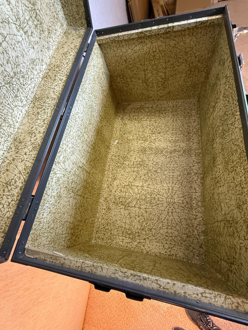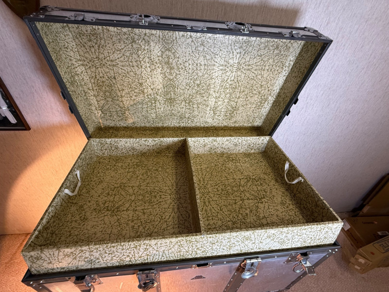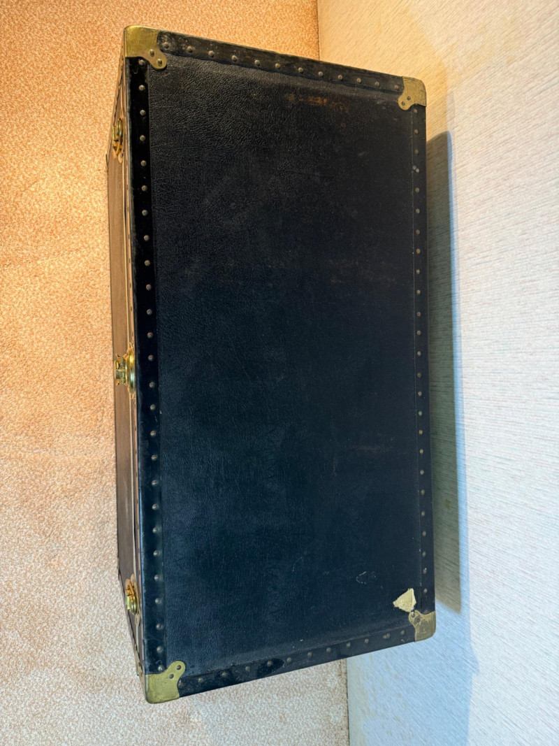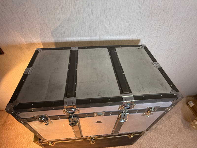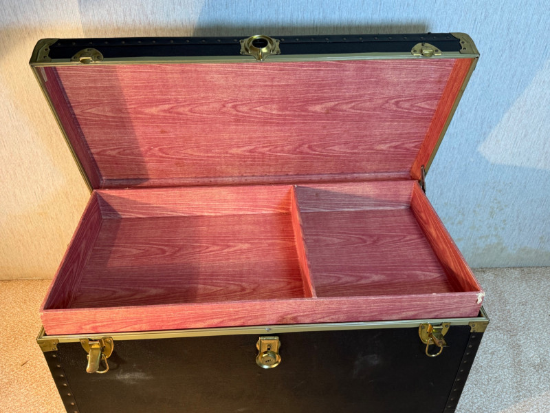 A rugged and visually striking duo of vintage trunks, stacked and ready for display or storage. The top trunk features a metallic silver steel exterior with black trim, brass corner protectors, and latches, plus a central emblem with a mountain logo. The bottom trunk is wrapped in black faux leather with brass hardware and trim, offering a classic travel aesthetic. Together, they evoke industrial charm and timeless utility—ideal for decorators, collectors, or resale pros seeking bold statement pieces. Top Trunk: Material: Steel with black trim Dimensions: 22.5" H × 36" L × 21" D Features: Brass hardware, central emblem Bottom Trunk: Material: Faux leather with brass trim Dimensions: 22" H × 39.75" L × 20.5" D Features: Central latch, brass corner protectors Item Details